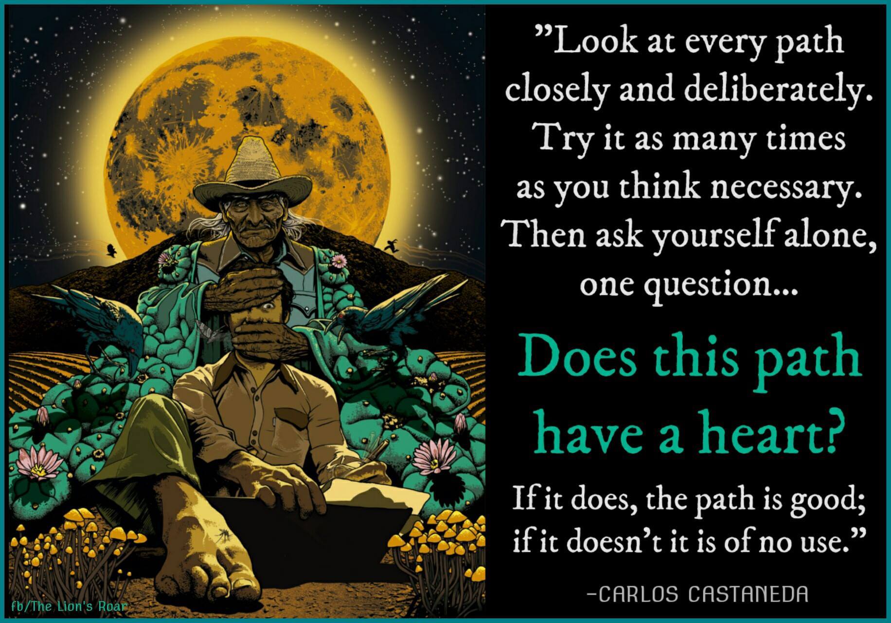 “Anything is one of a million paths. Therefore you must always keep in mind that a path is only a path; if you feel you should not follow it, you must not stay with it under any conditions. To have such clarity you must lead a disciplined life. Only then will you know that any path is only a path, and there is not affront, to oneself or to others, in dropping it if that is what your heart tells you to do. But your decision to keep on the path or to leave it must be free of fear or ambition.