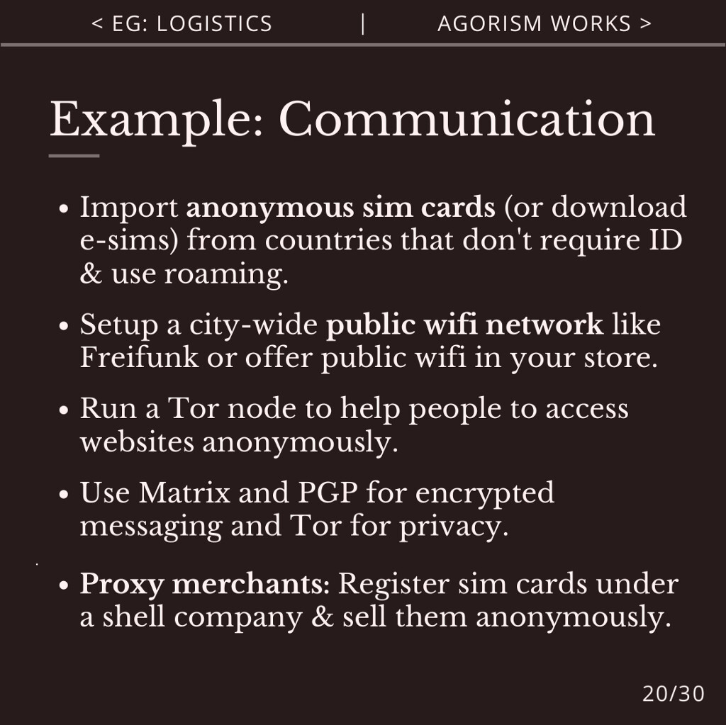Agorist communication includes anonymous sim cards, KYC-free home internet, public wifi networks and mesh networks.