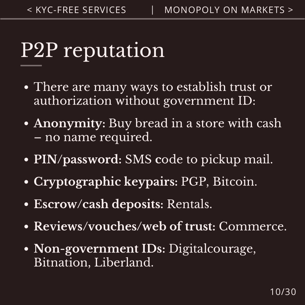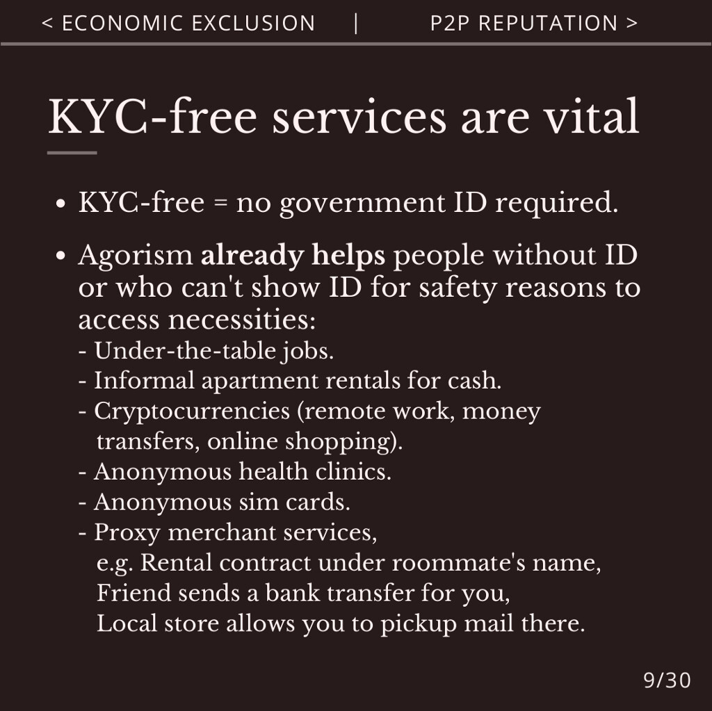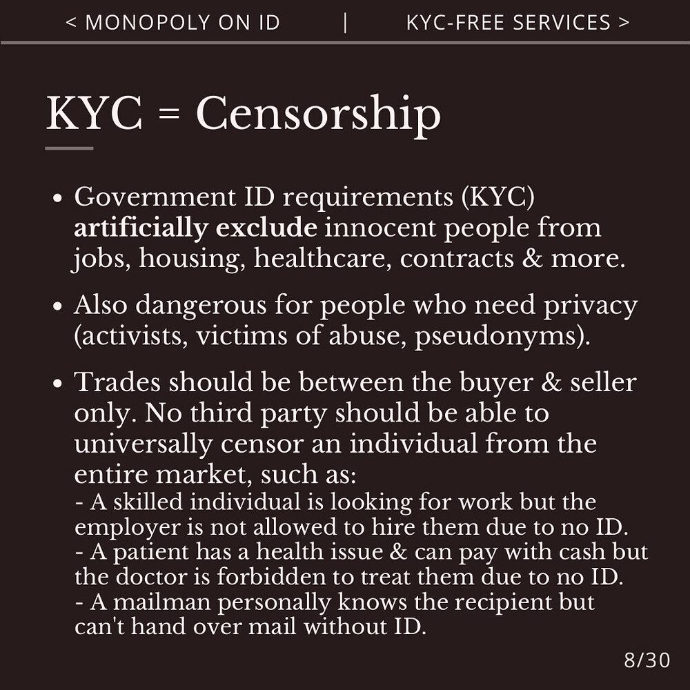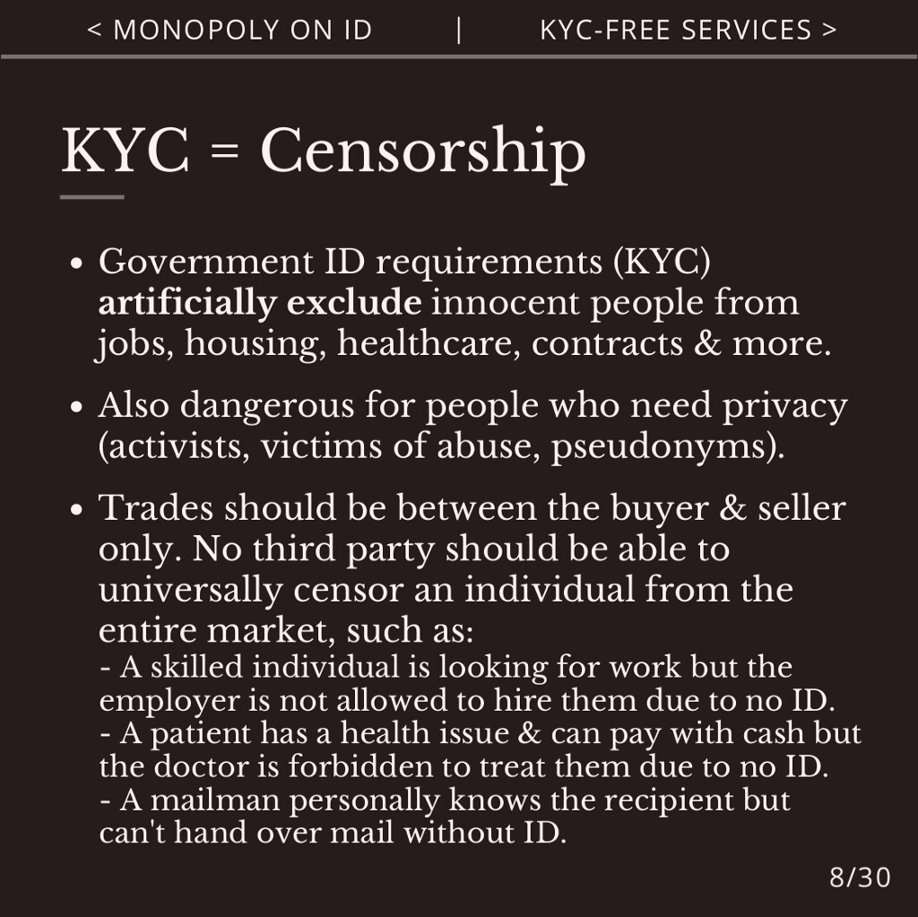 Agorist KYC-free services don’t require government ID or state permission. This provides equal and meritocratic access to services, preserves privacy, and avoids state surveillance and censorship.