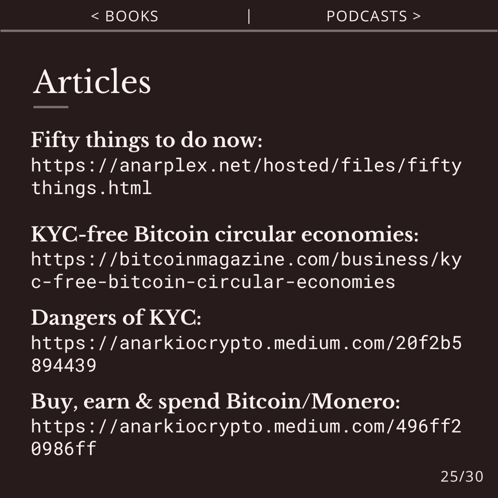 Check Anarplex, Bitcoin Magazine and Medium for agorist and crypto articles, like KYC-free Bitcoin circular economies.