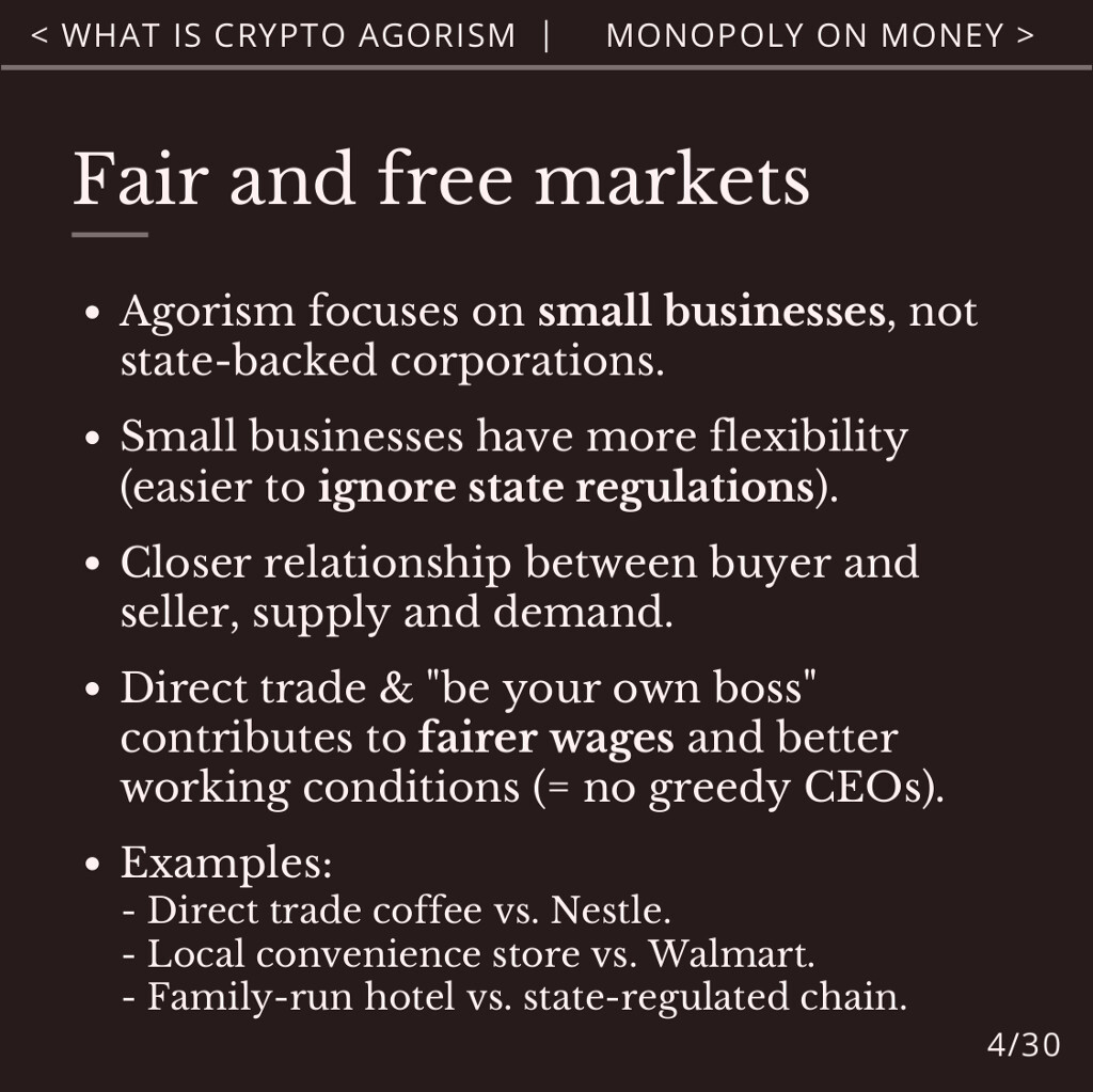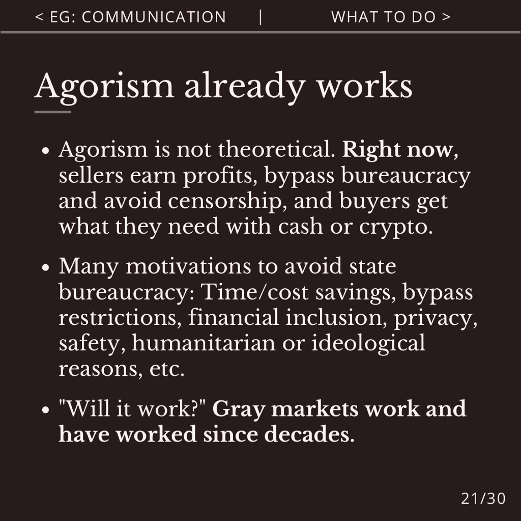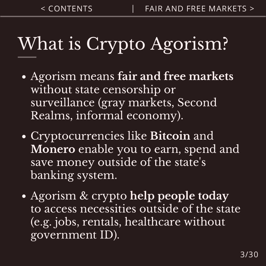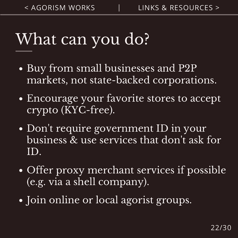 Agorism helps you to bypass the state’s monopolies on money, identity and markets, which attempt to censor and surveil the free market.