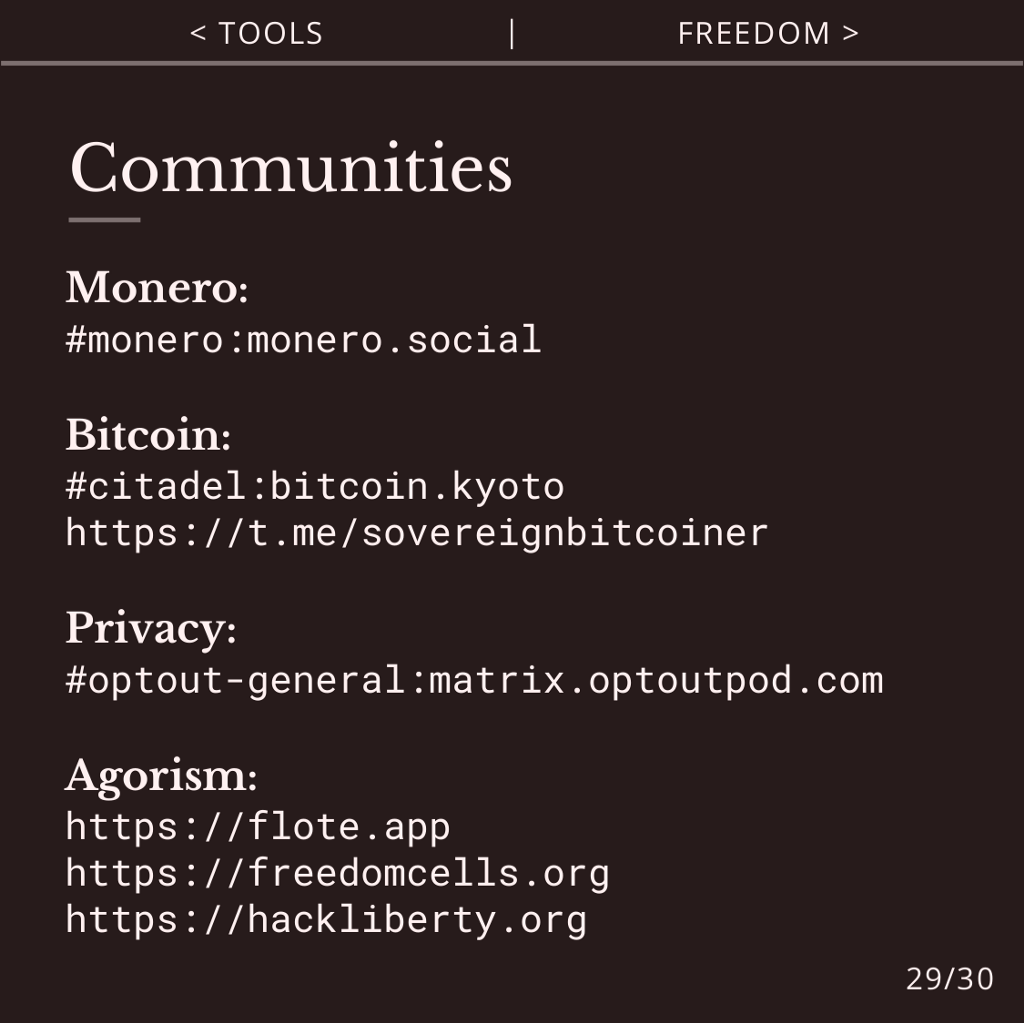 There are many agorist, crypto and privacy communities in Matrix, Telegram and other social networks, including Flote, Freedom Cells and Hack Liberty.