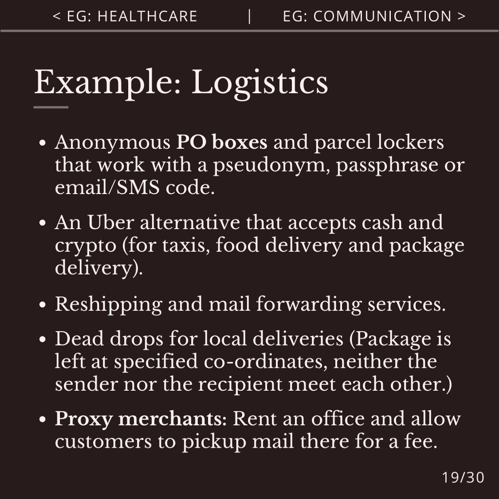 Agorist logistics includes anonymous PO boxes and parcel lockers, a crypto-friendly alternative to Uber for taxis and deliveries, and dead drop services.