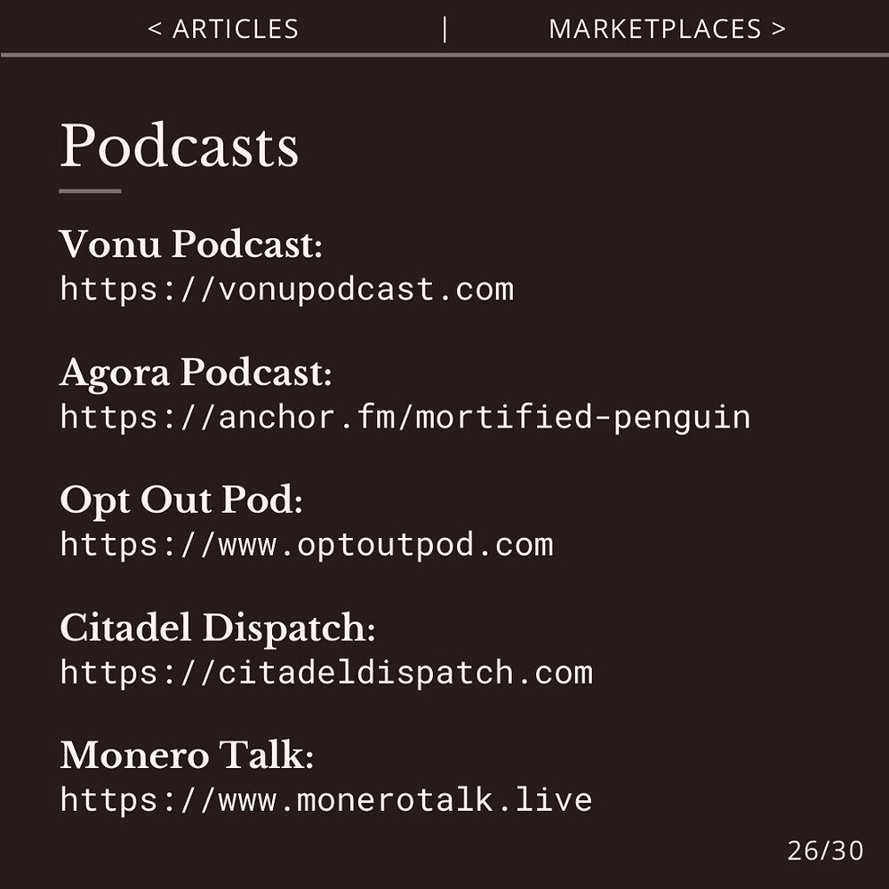 Listen to practical podcasts for agorist ideas, crypto use cases and more, such as Vonu Podcast and Citadel Dispatch.