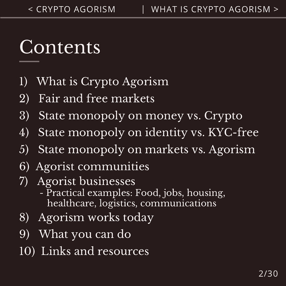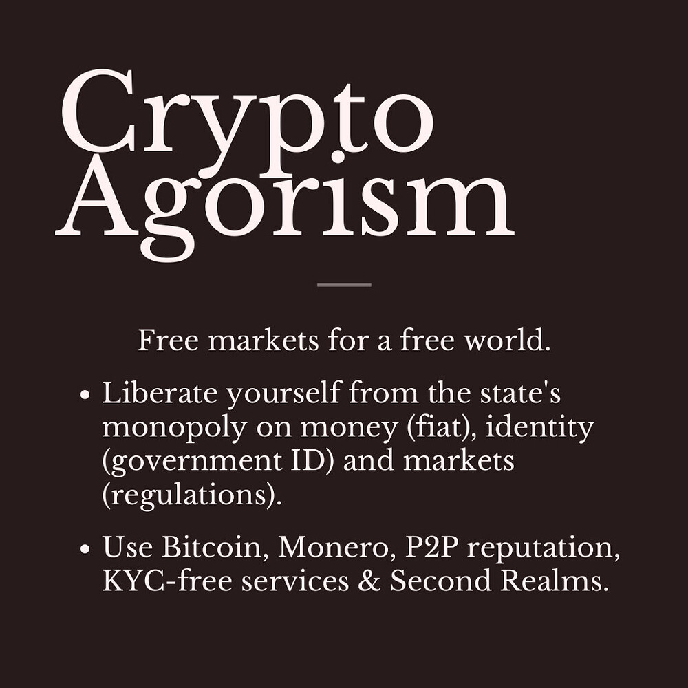 Crypto Agorism unites agorists and cryptocurrency users to build fair and free markets outside of the state, which provide necessities like food, jobs, housing, healthcare, sim cards, mail & more without censorship or surveillance.