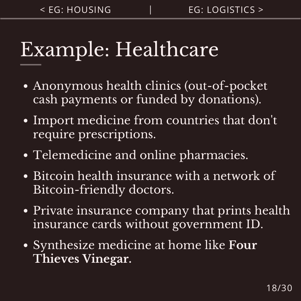 Agorist healthcare includes anonymous health clinics with out-of-pocket payments or funded by donations, crypto-friendly doctors, online pharmacies and telemedicine services, and importing medicine from countries that don’t require prescriptions.