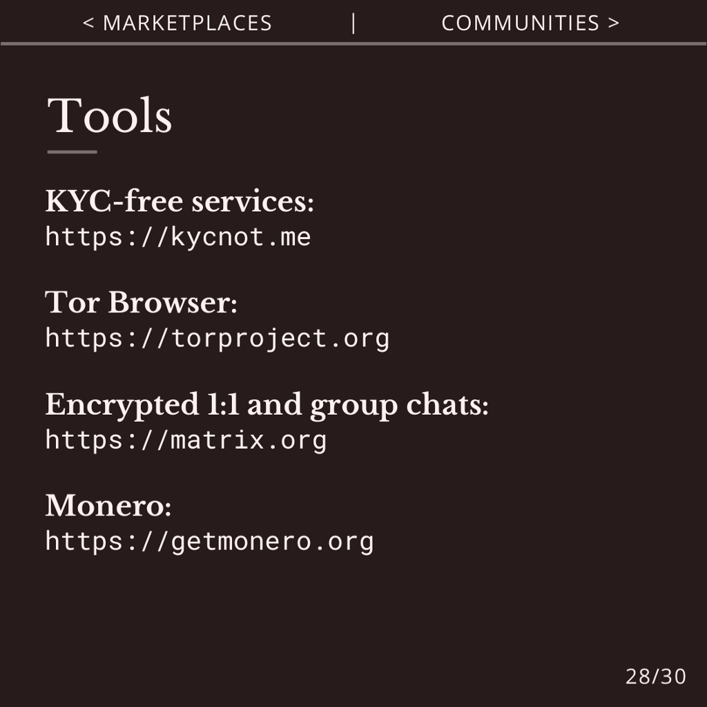 Find a list of KYC-free services at KYCNot.me. Use Tor for anonymity, Matrix for encrypted chats and Monero for private payments.