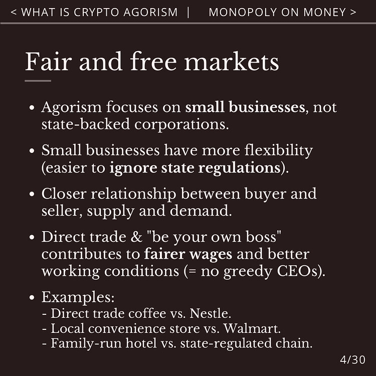 Agorism focuses on small businesses, entrepreneurs and communities, not state-backed corporations.