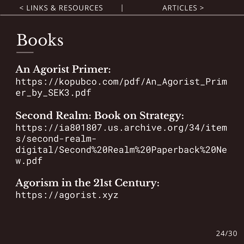 “An Agorist Primer” by SEK3 and “Second Realm: Book on Strategy” by Smuggler & XYZ are practical books about agorism.
