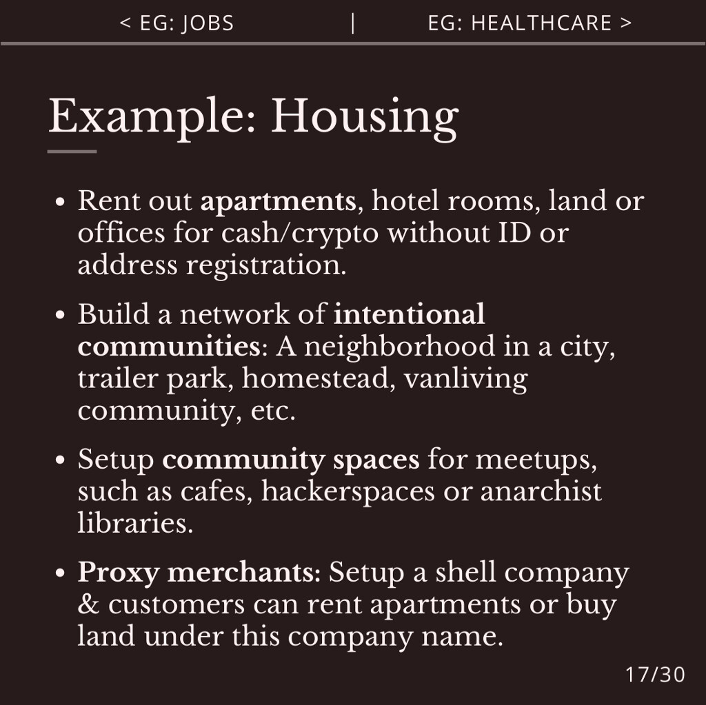 Agorist housing includes apartment, hotel, land and office rentals for cash or crypto, without ID or address registration.