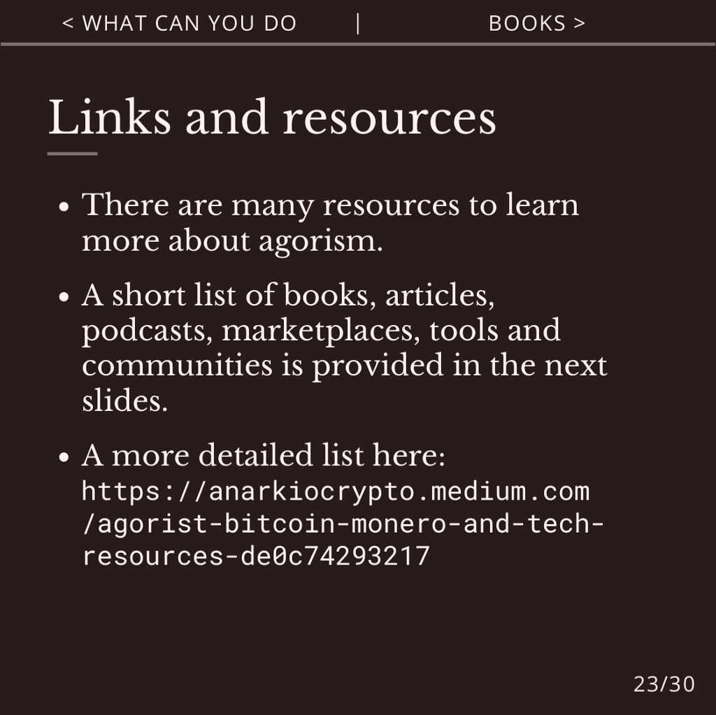 - Slides (PDF): https://anarkio.codeberg.page/crypto_agorism.pdf