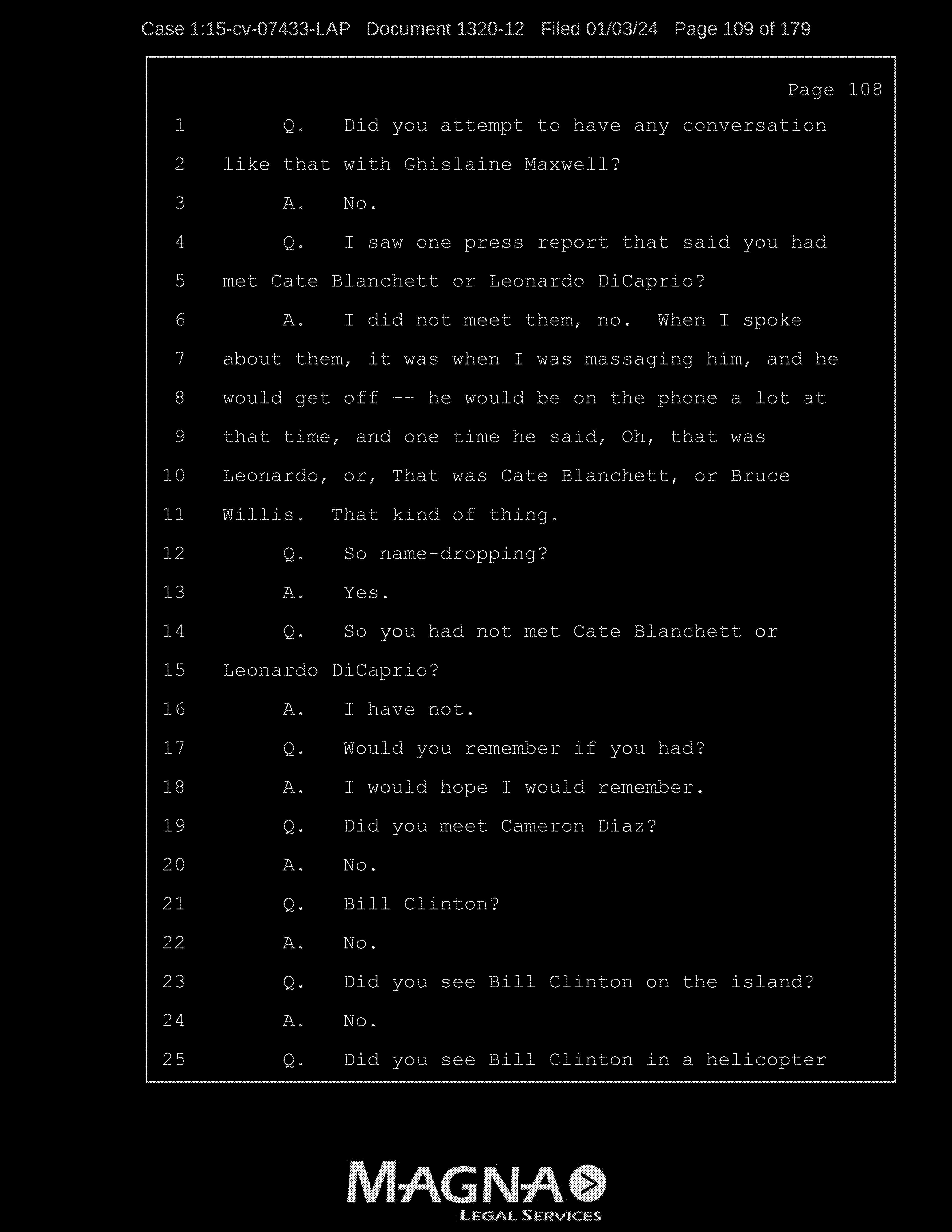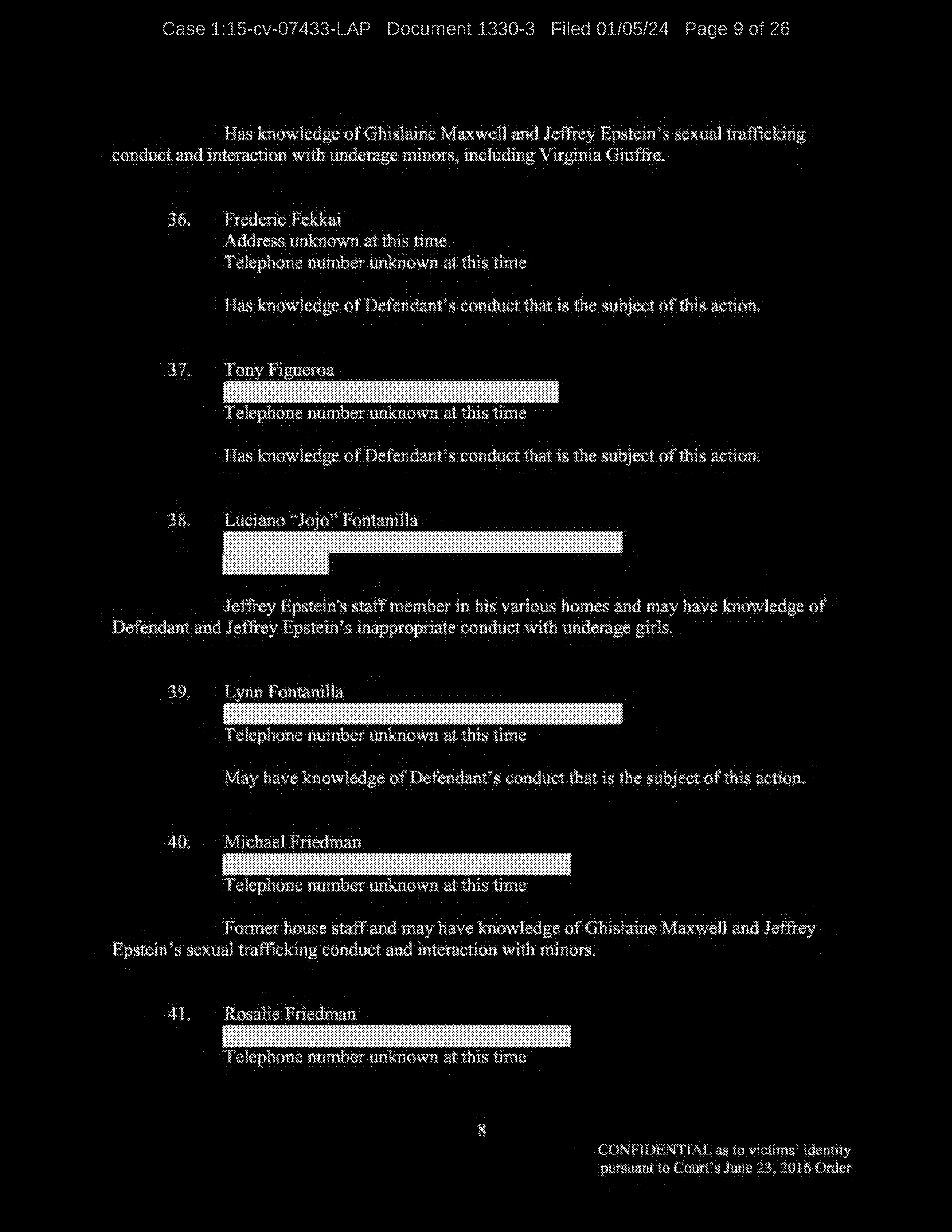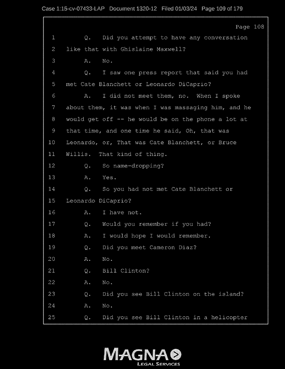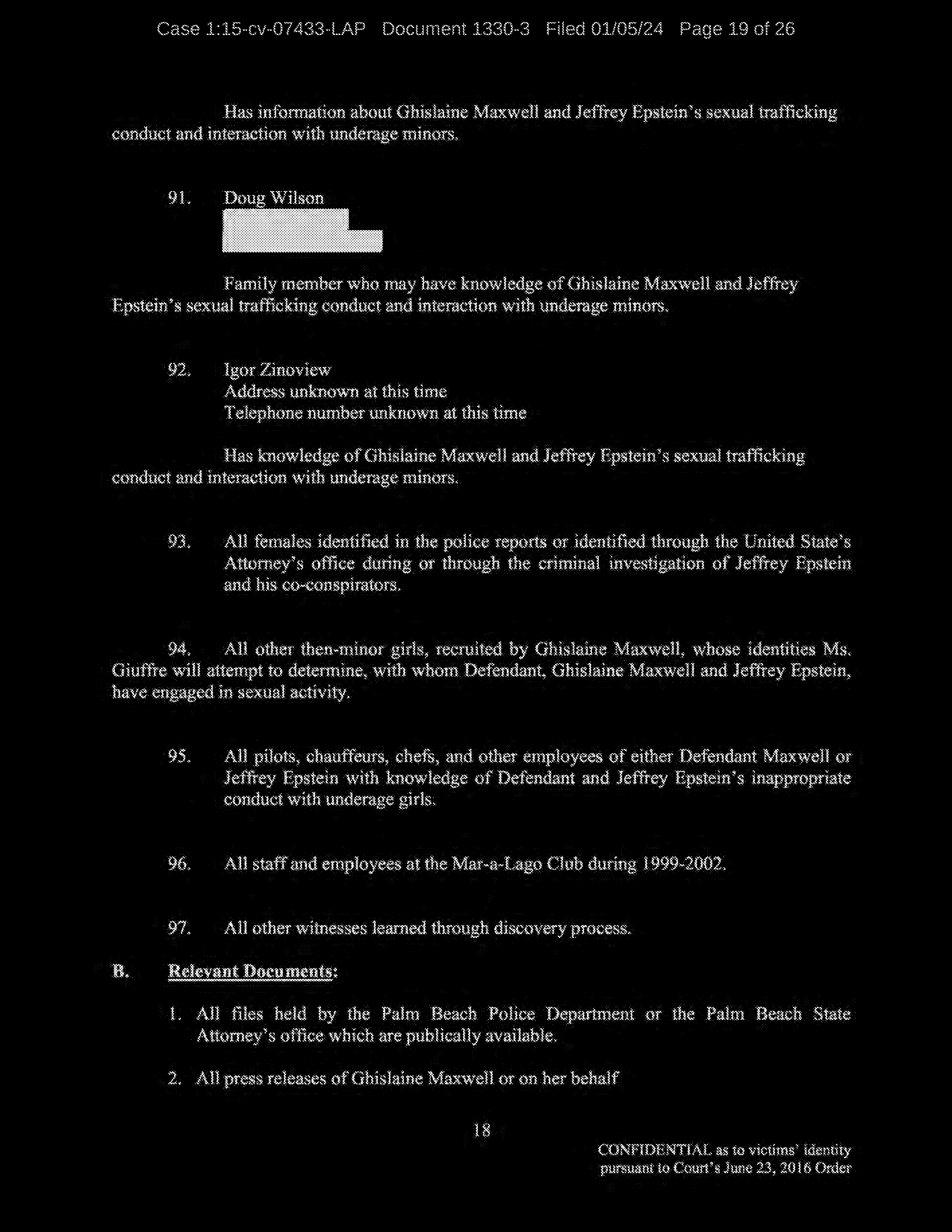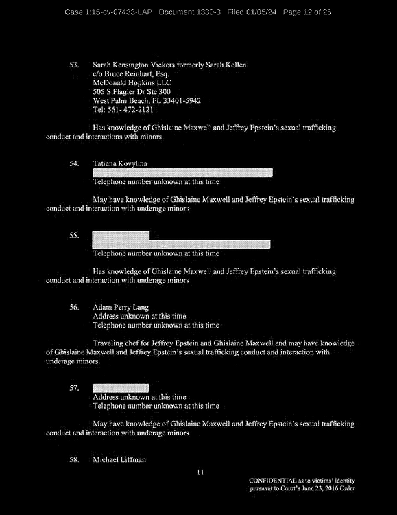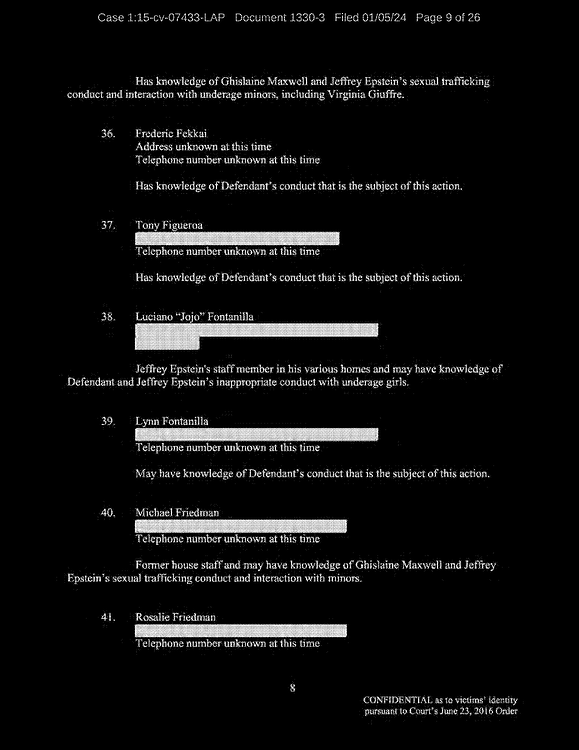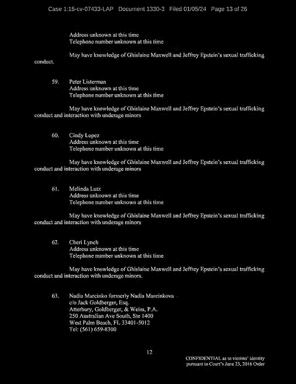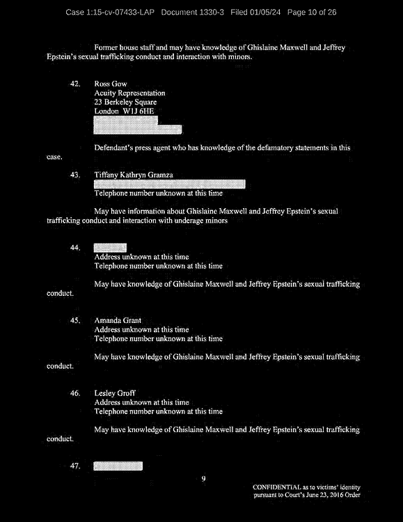 Q: Okay. So, let’s continue reviewing the list. I’m looking for the names of the people that you allege you were sexually trafficked to?