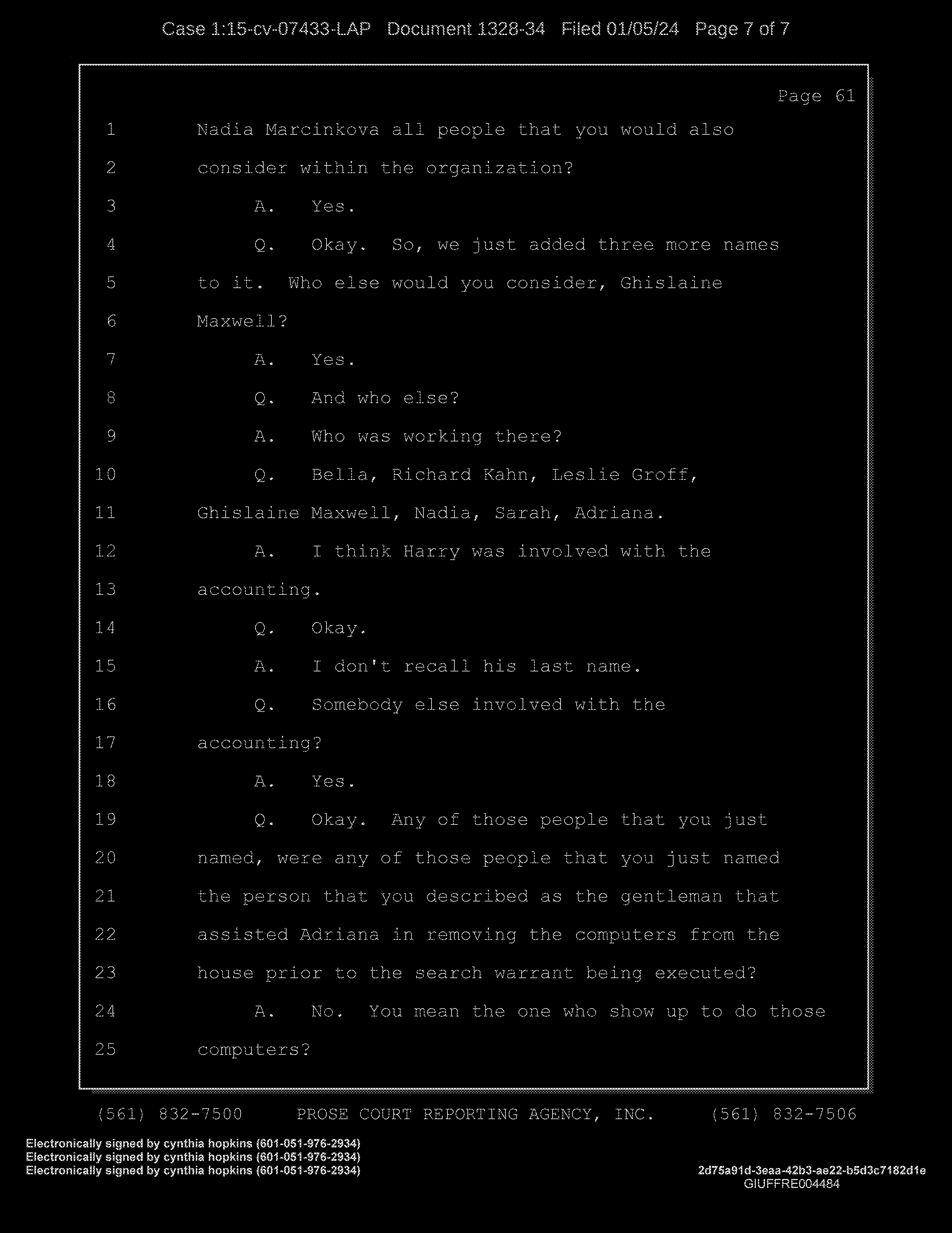 Q: Okay. Any of those people that you just named, were any of those people that you just named the person that you described as the gentleman that assisted Adriana in removing the computers from the house prior to the search warrant being executed?