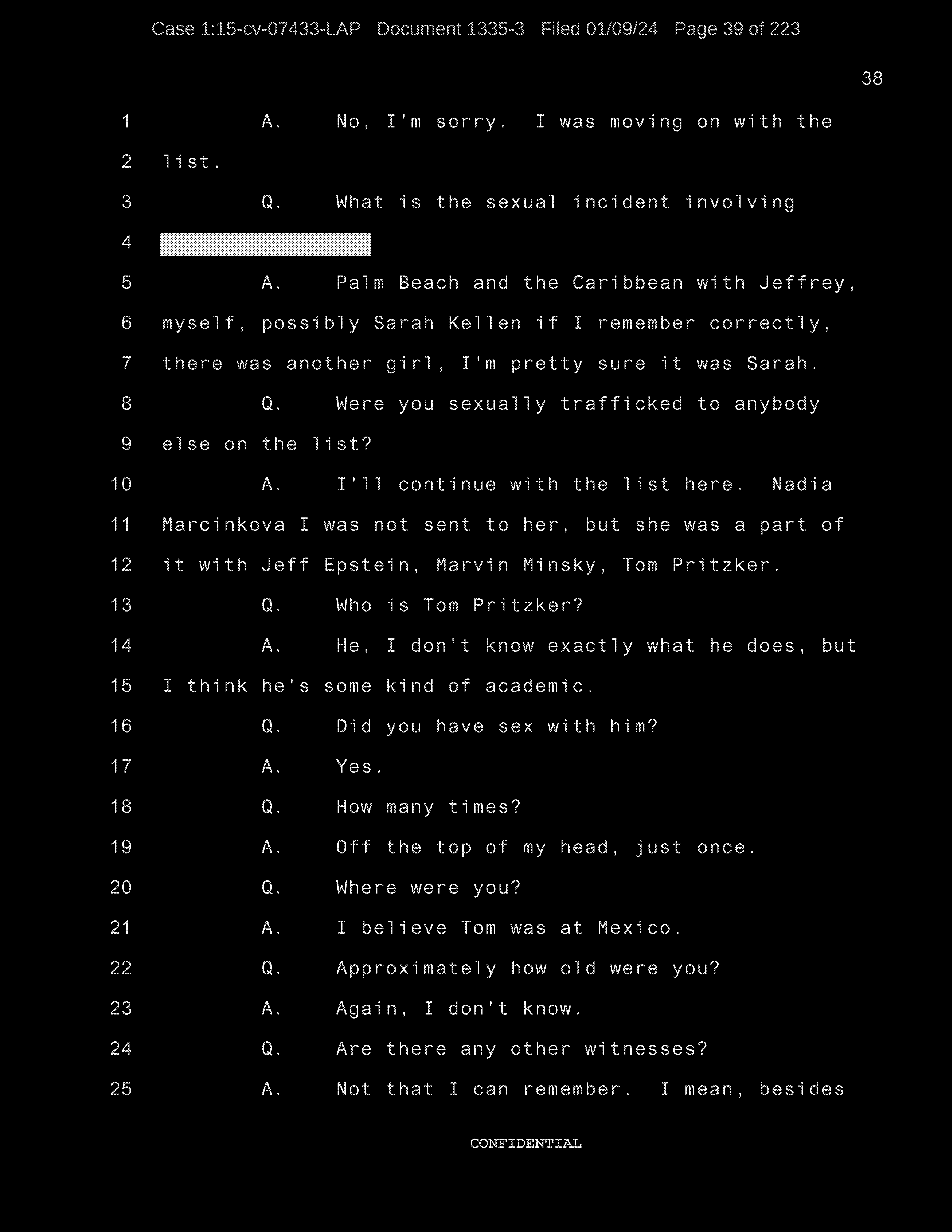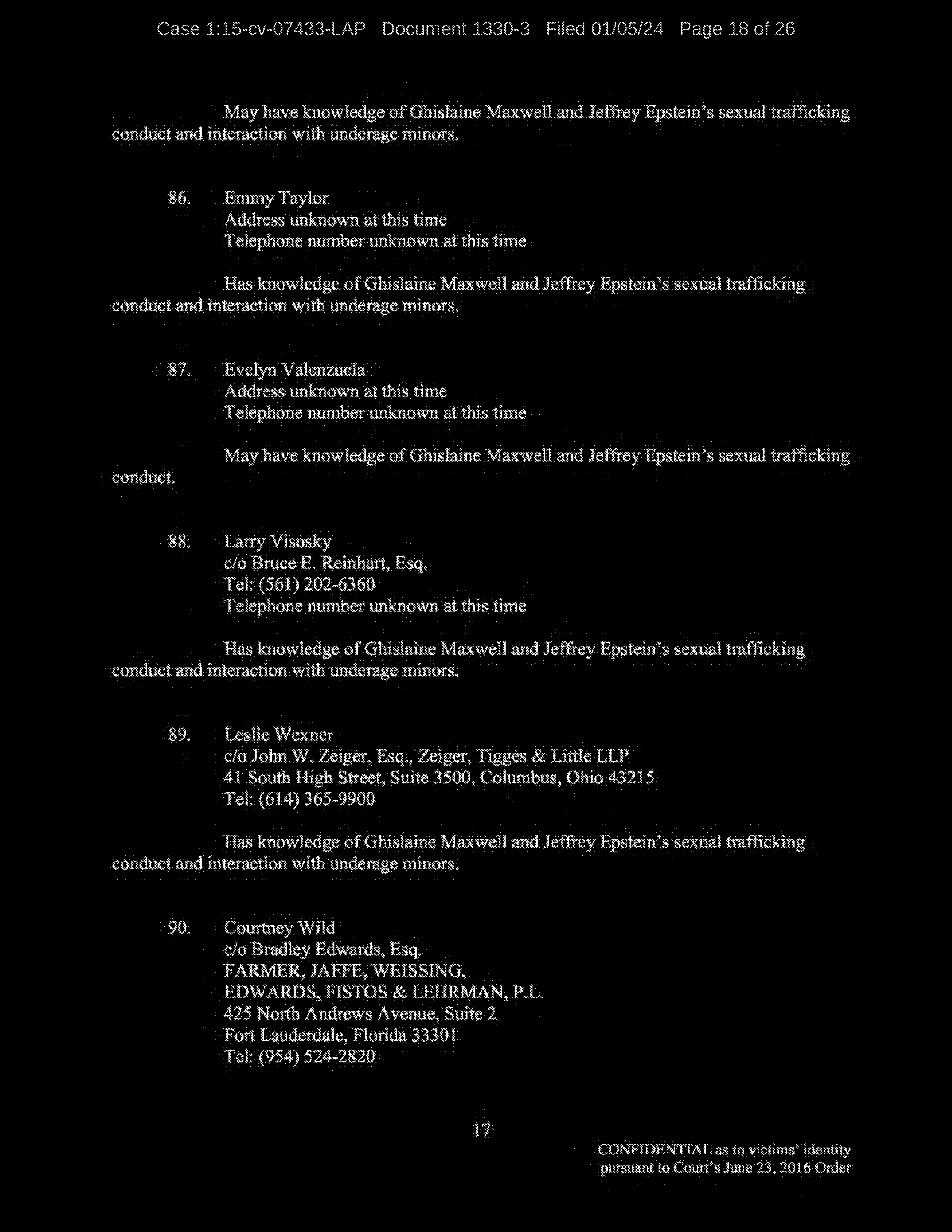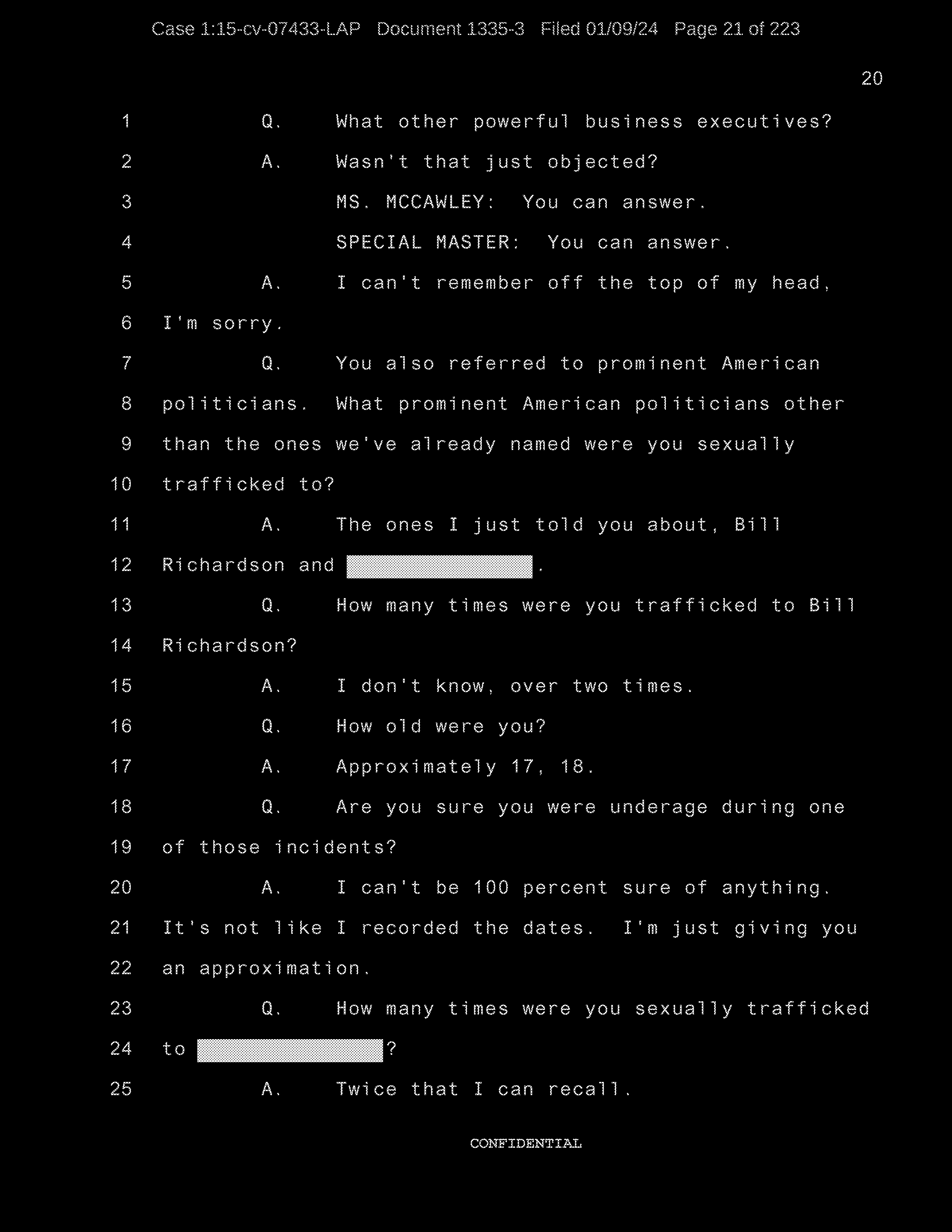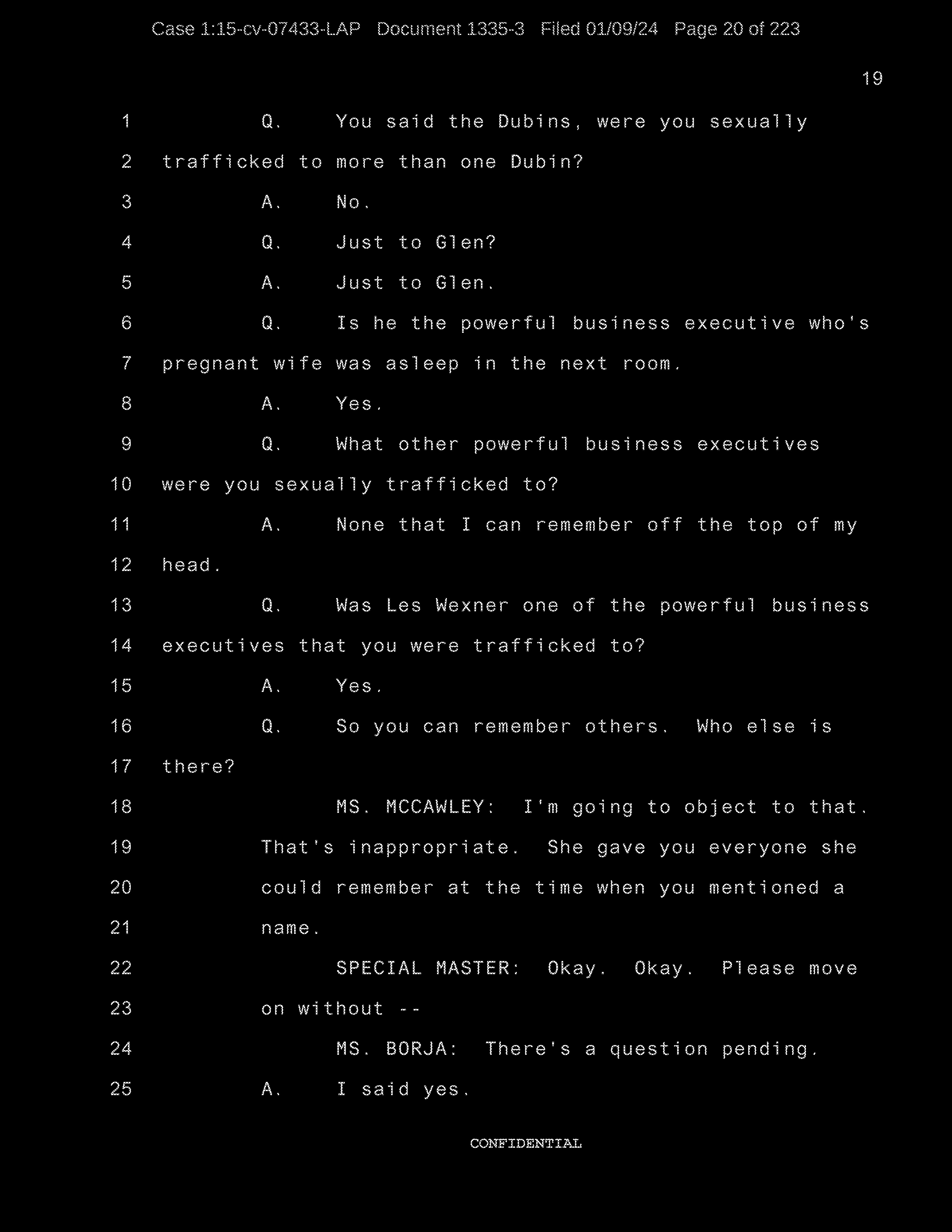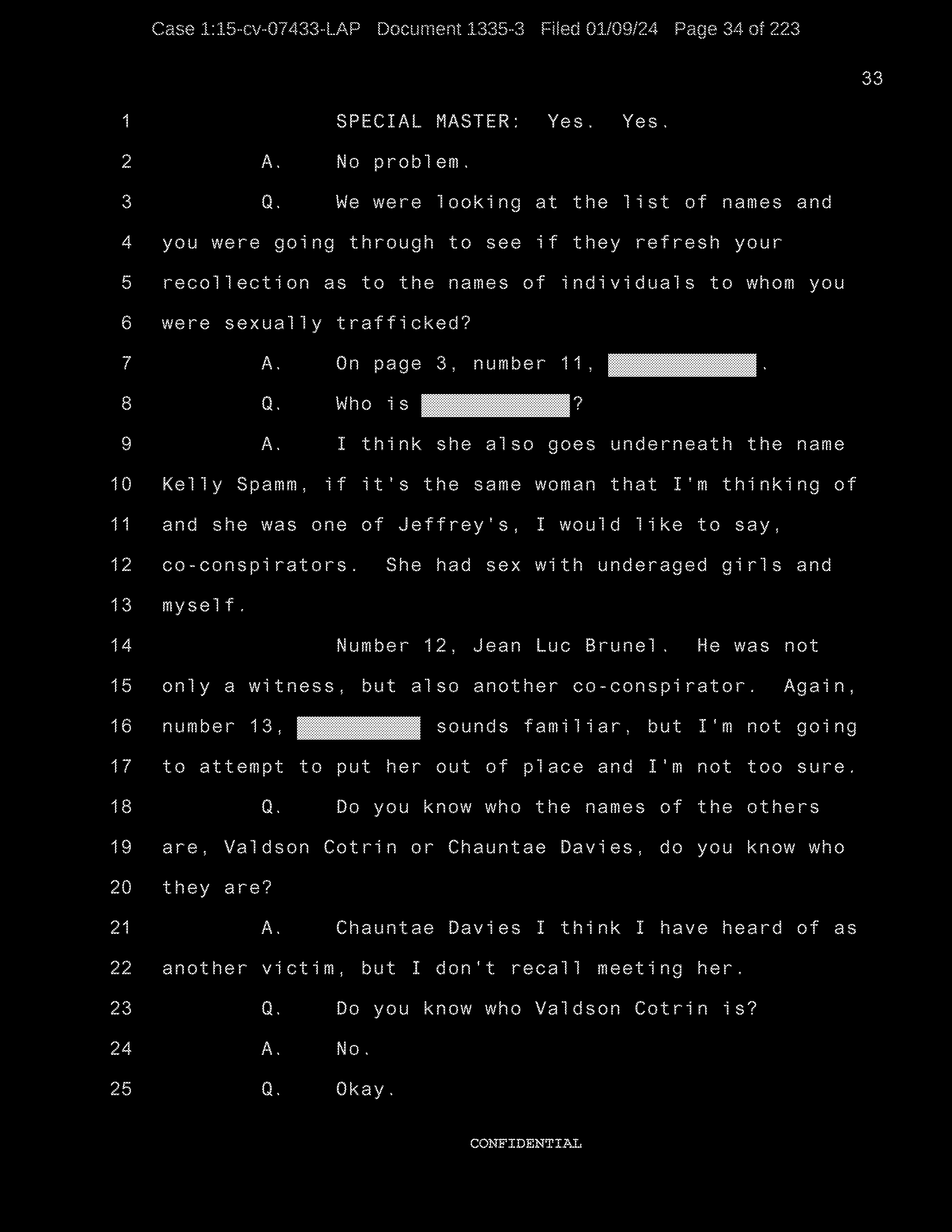 Q: We were looking at the list of names and you were going through to see if they refresh your recollection as to the names of the individuals to whom you were sexually trafficked?