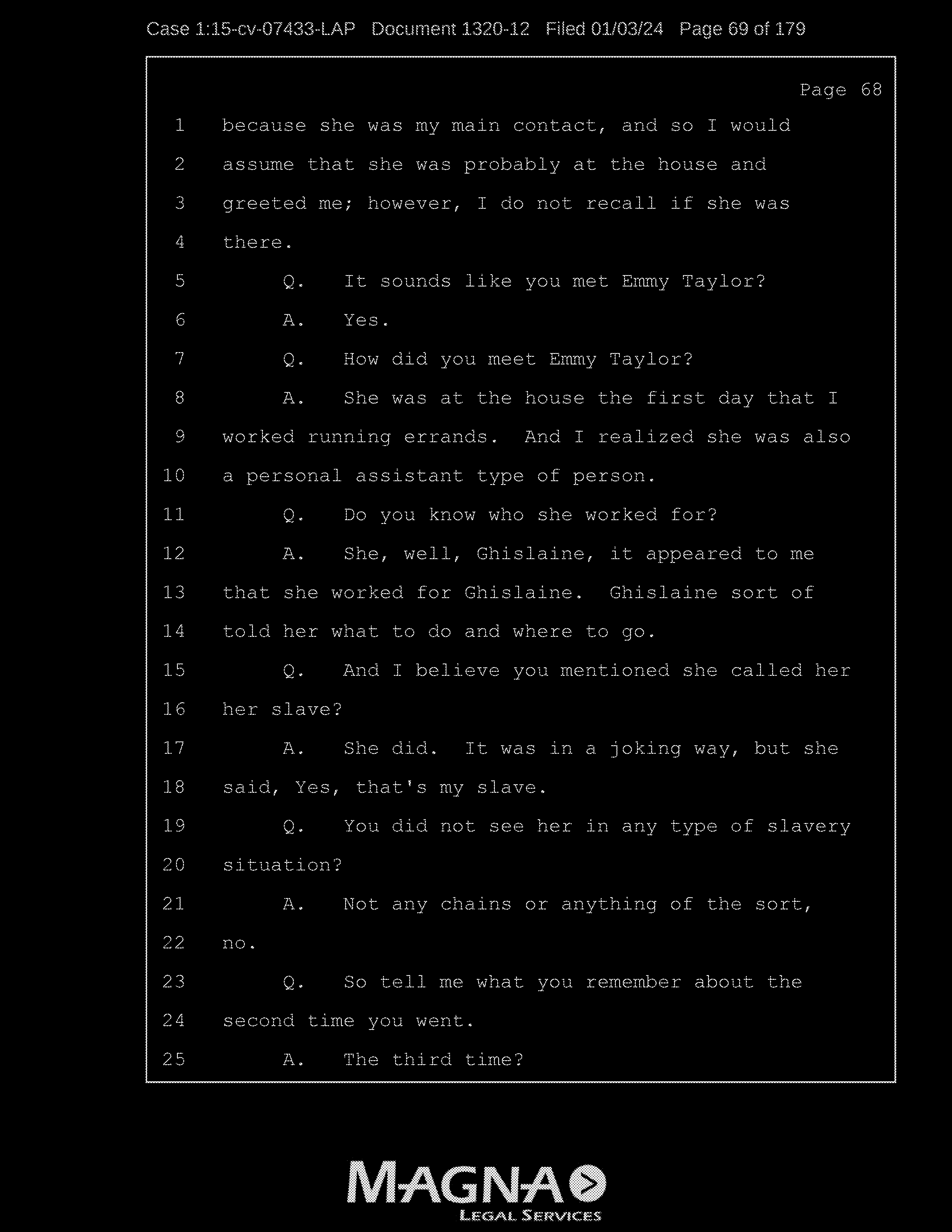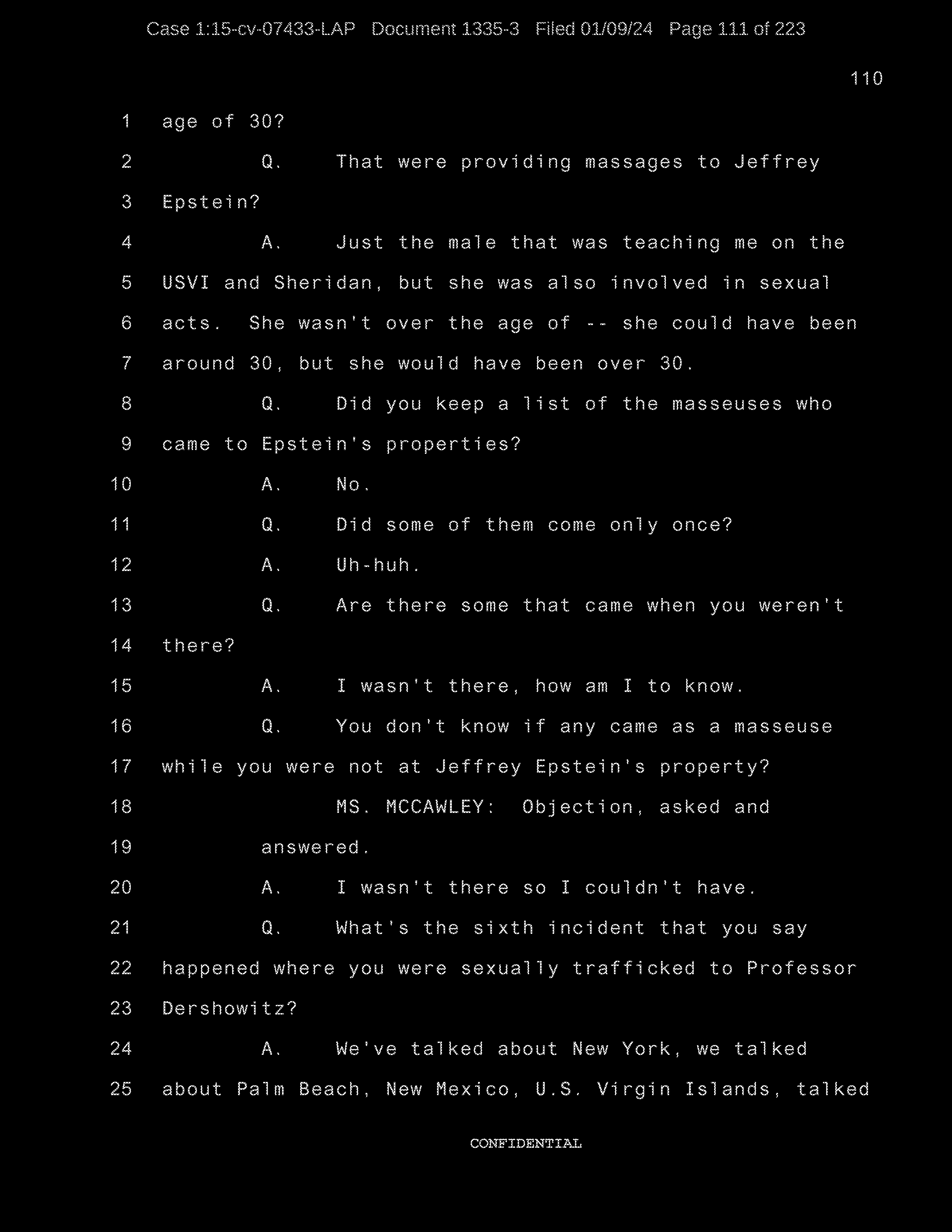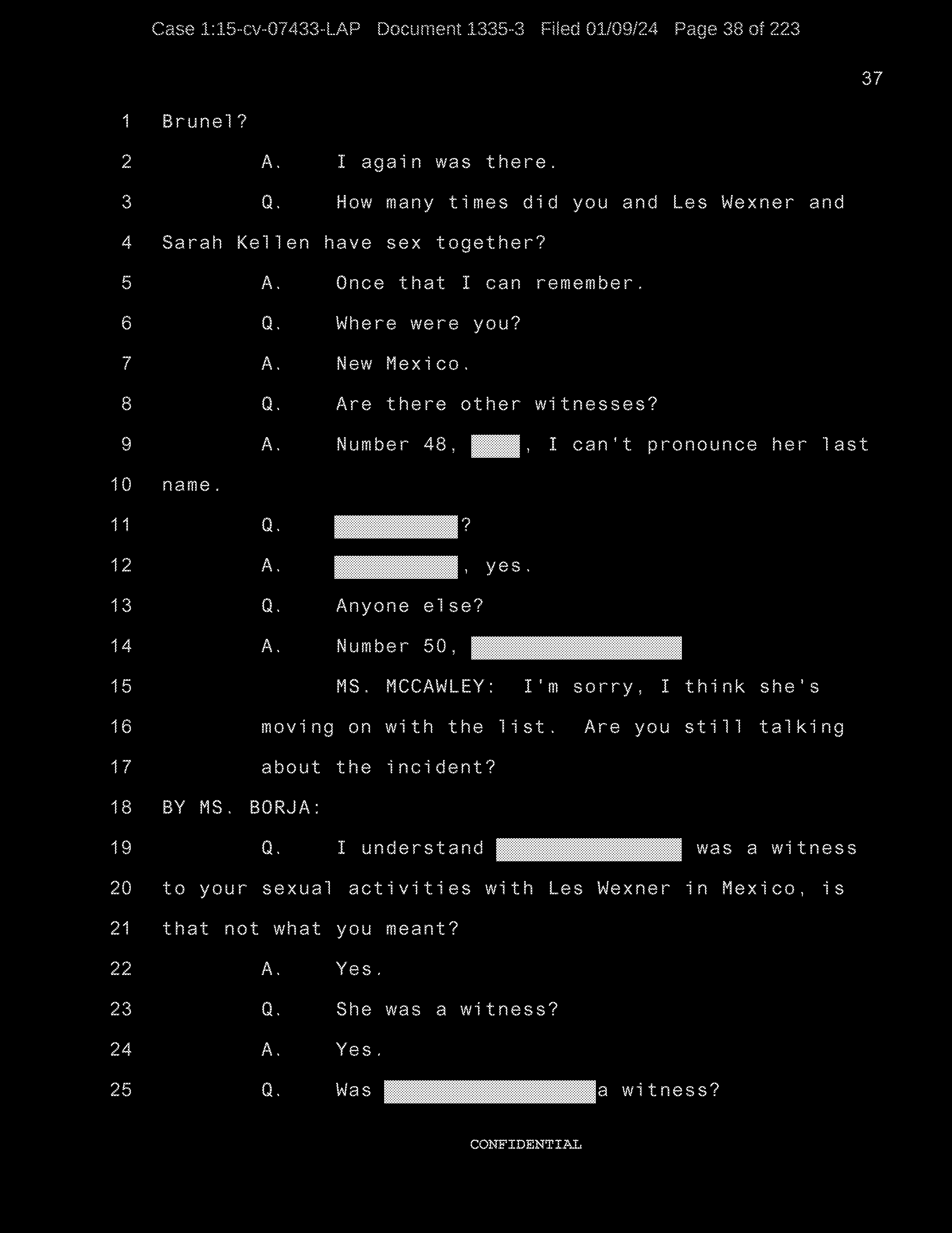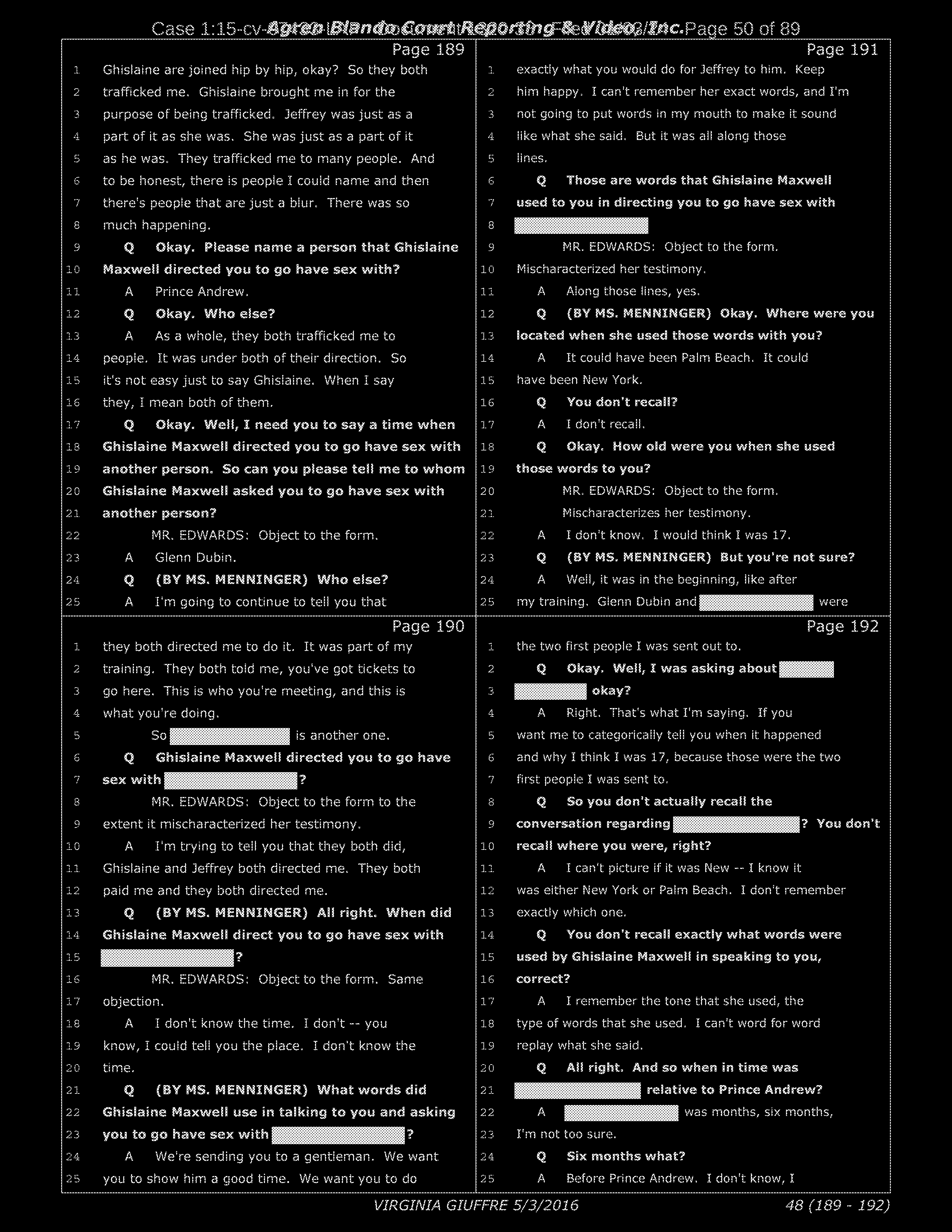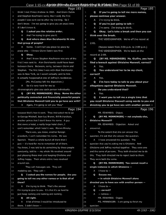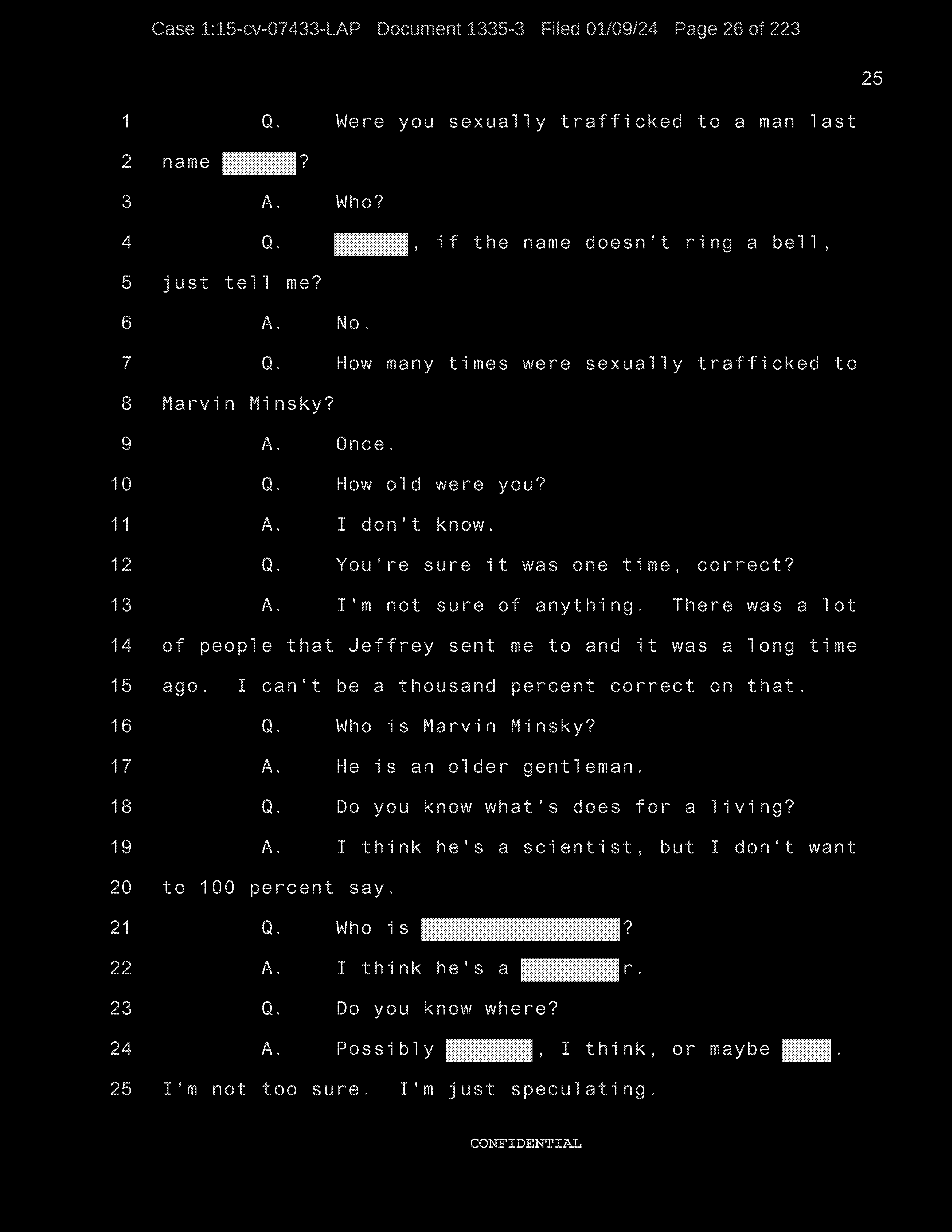 Q: We were looking at the list of names and you were going through to see if they refresh your recollection as to the names of the individuals to whom you were sexually trafficked?