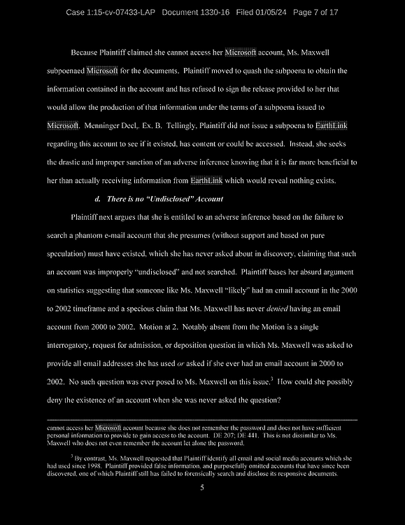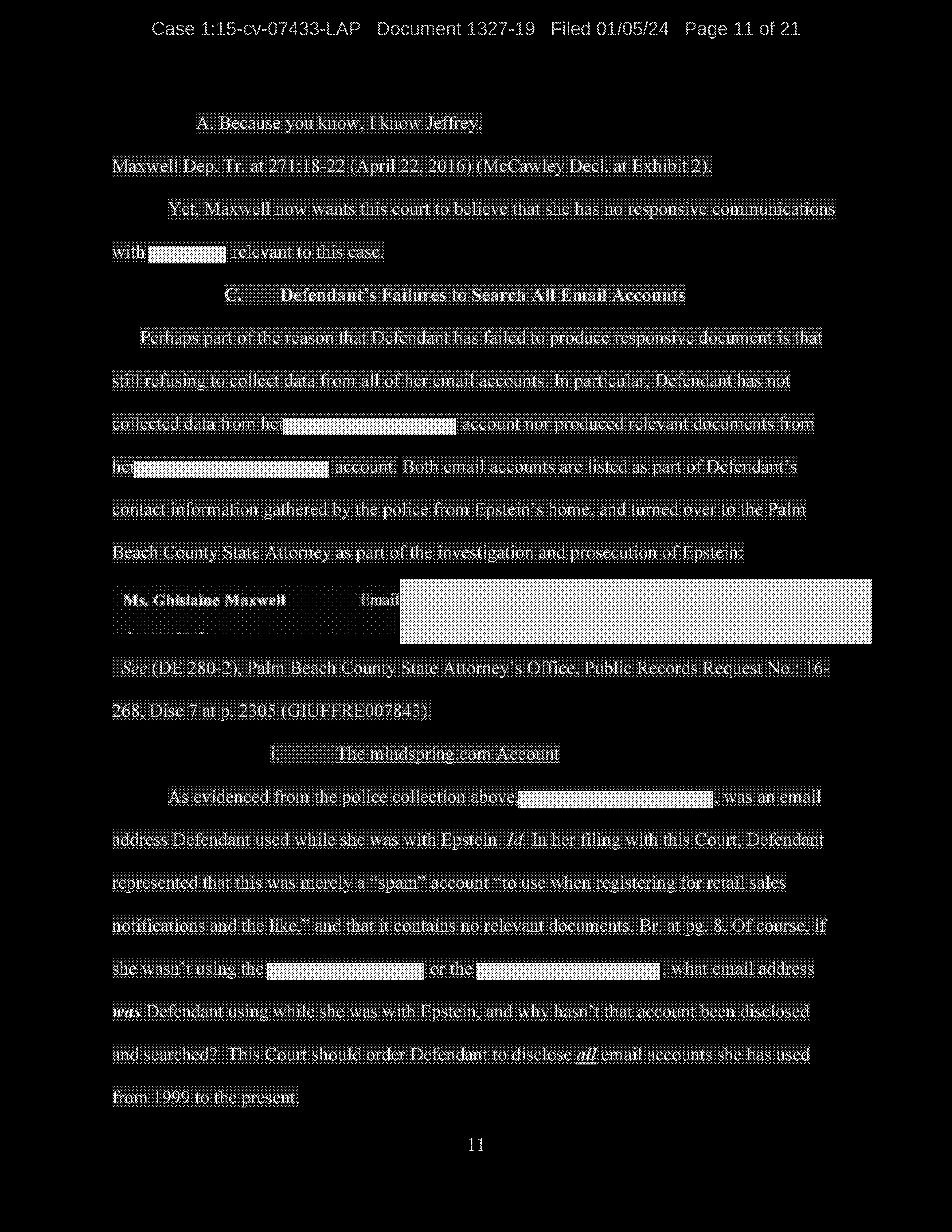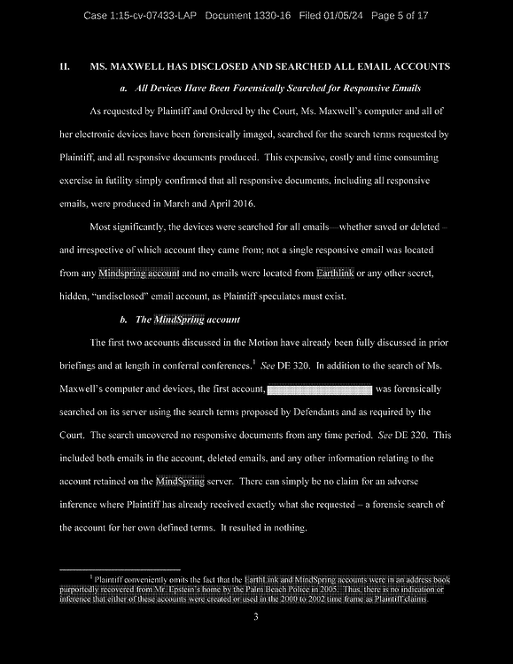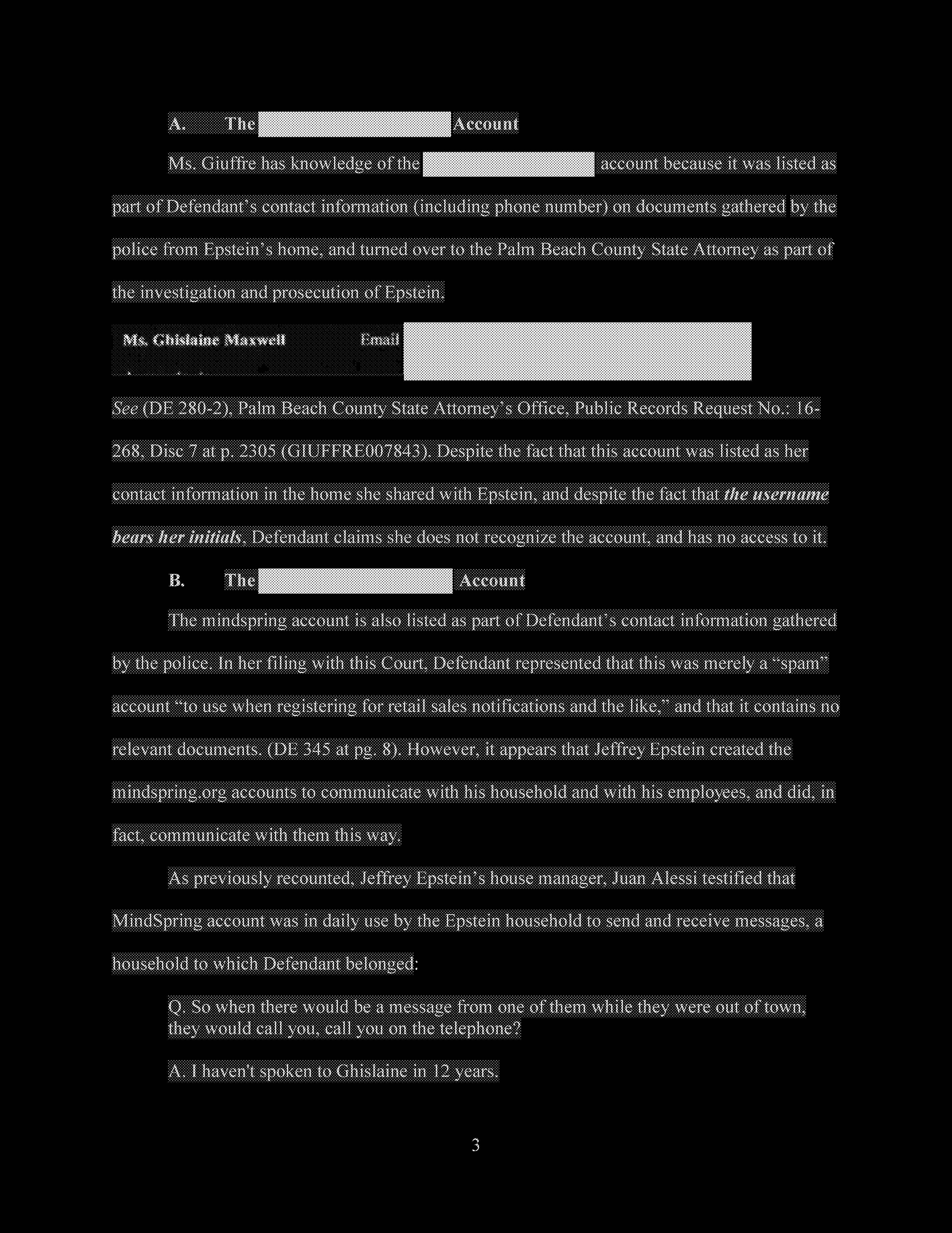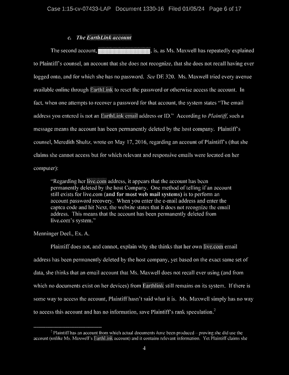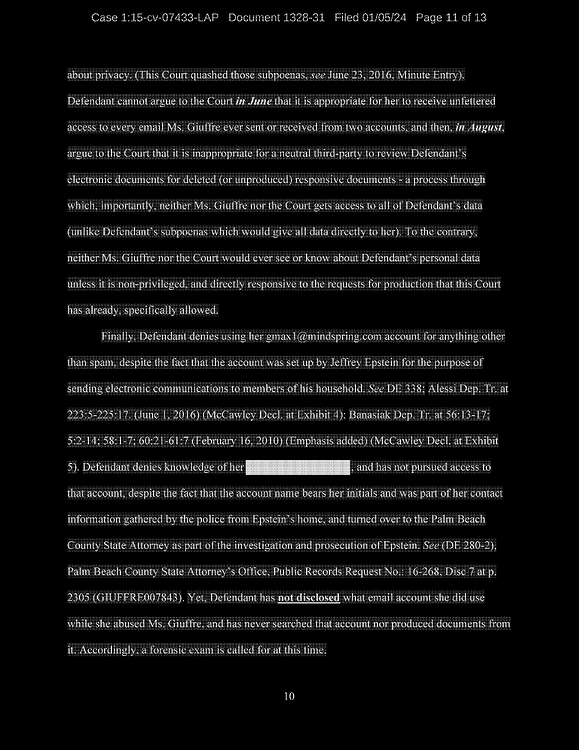 Finally, Defendant denies using her gmax1@mindspring.com account for anything other than spam, despite the fact that the account was set up by Jeffrey Epstein for the purpose of sending electronic communications to members of his household.