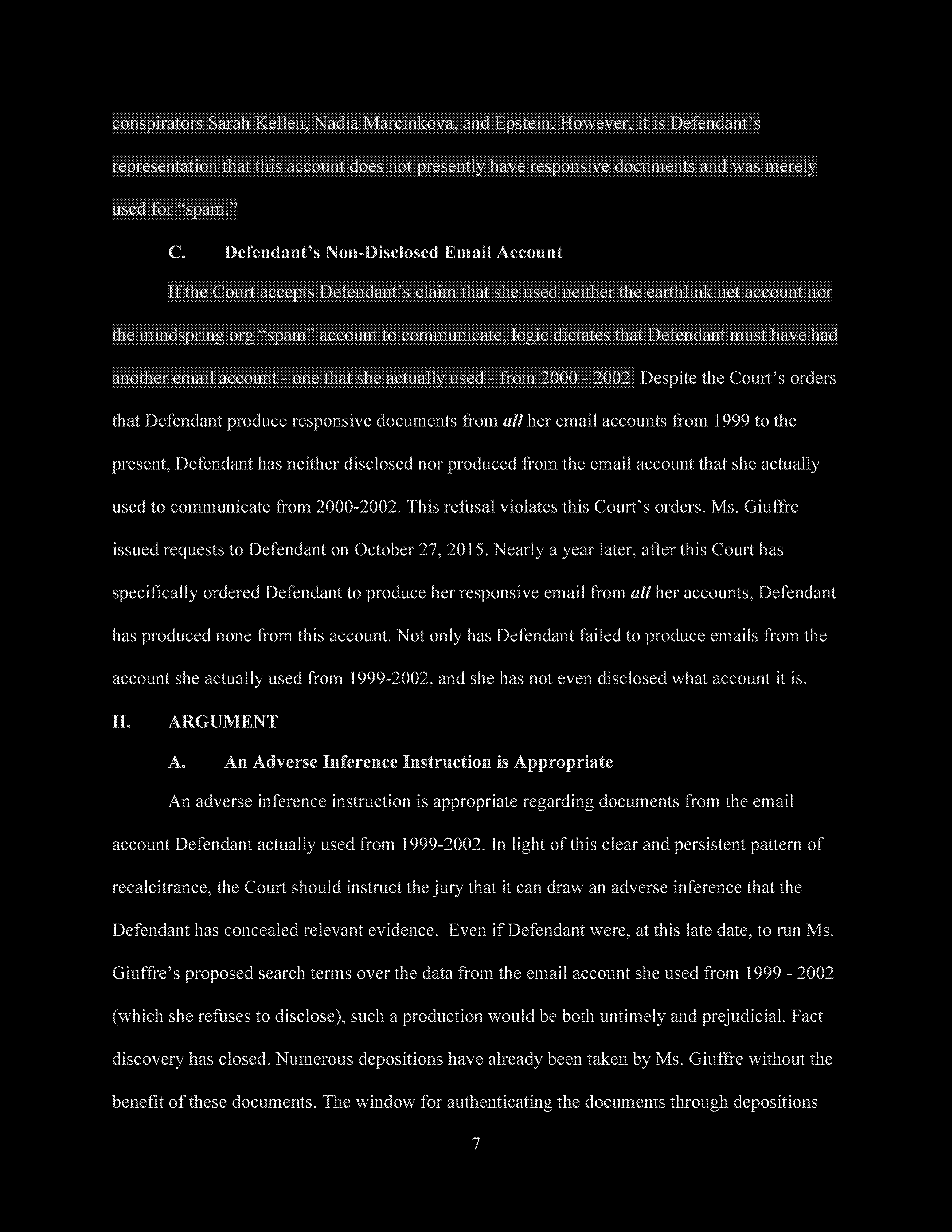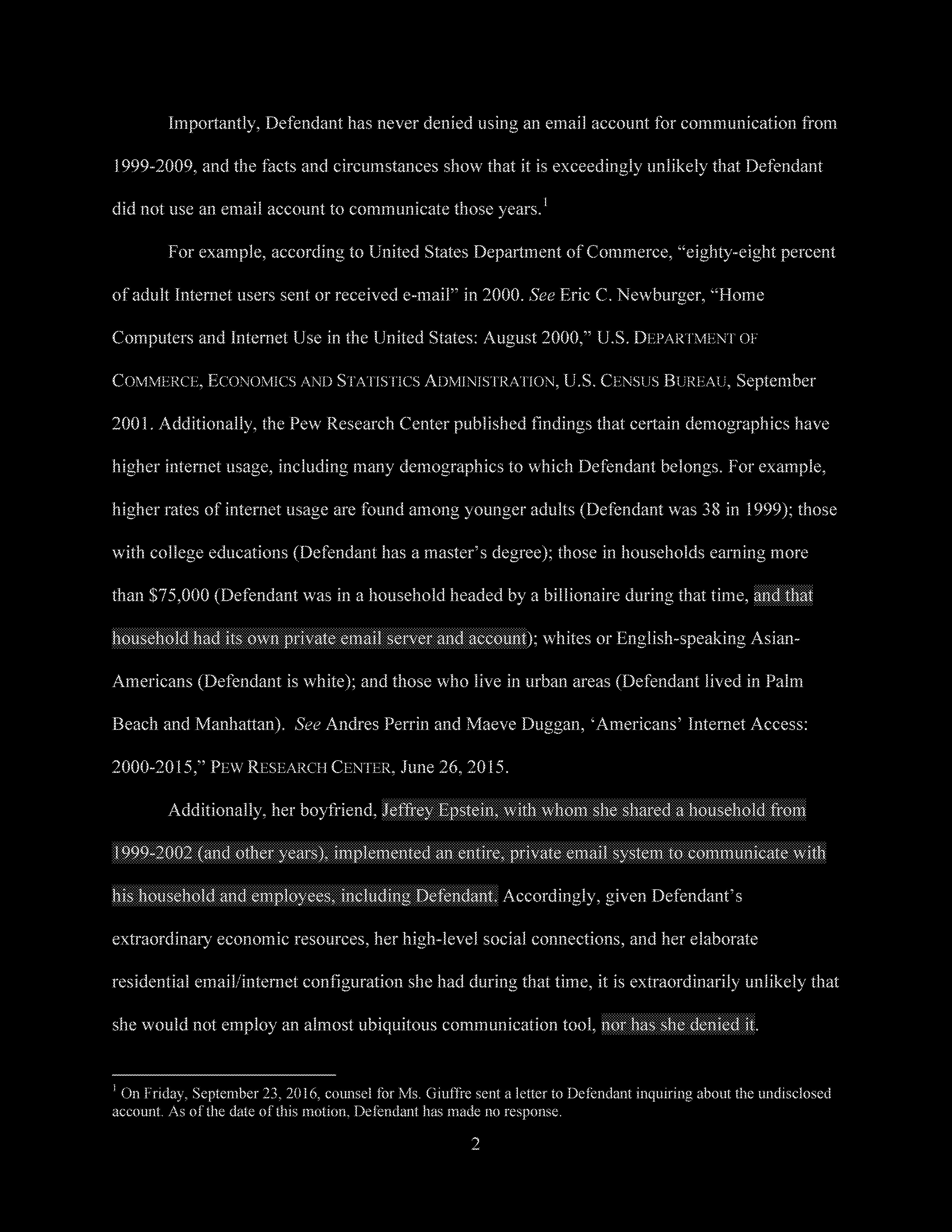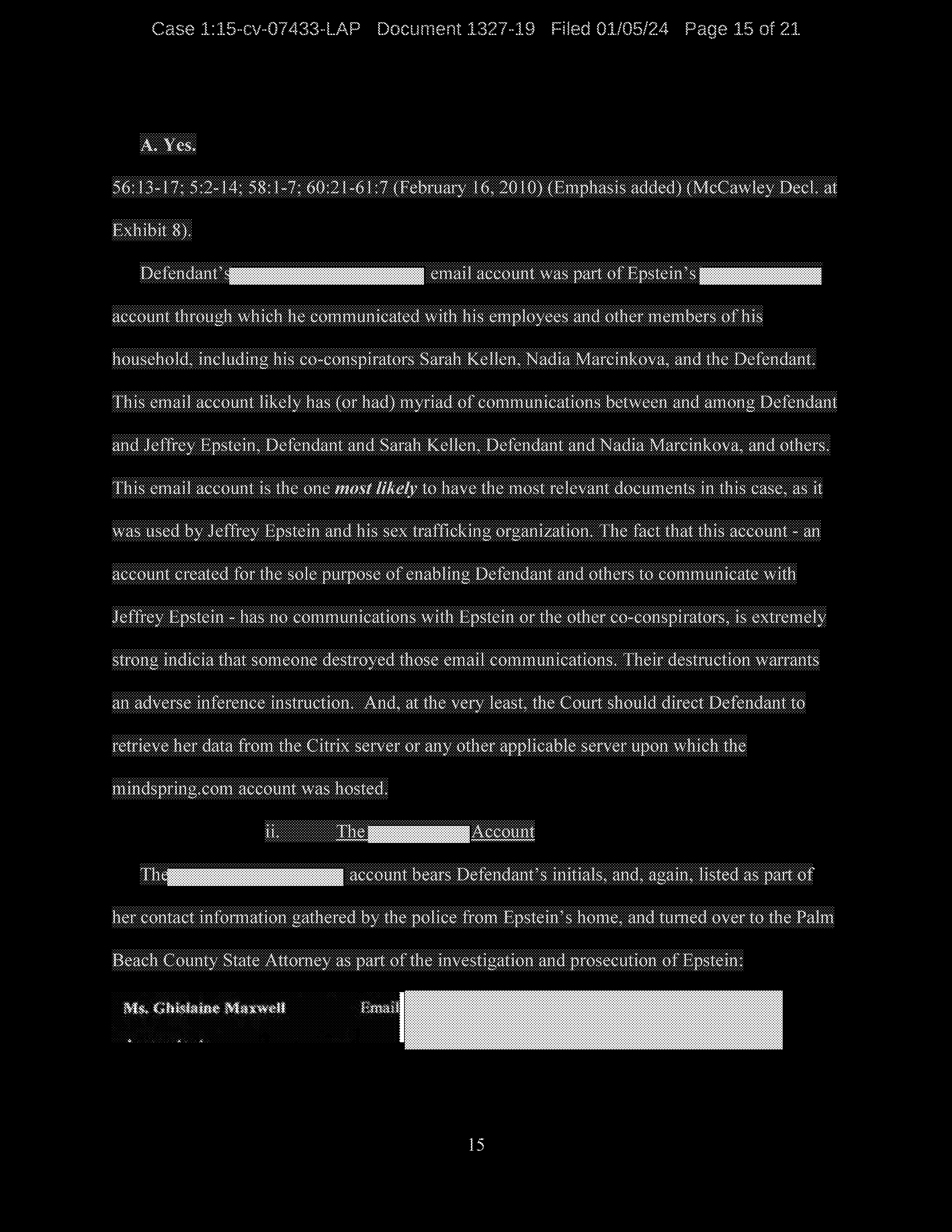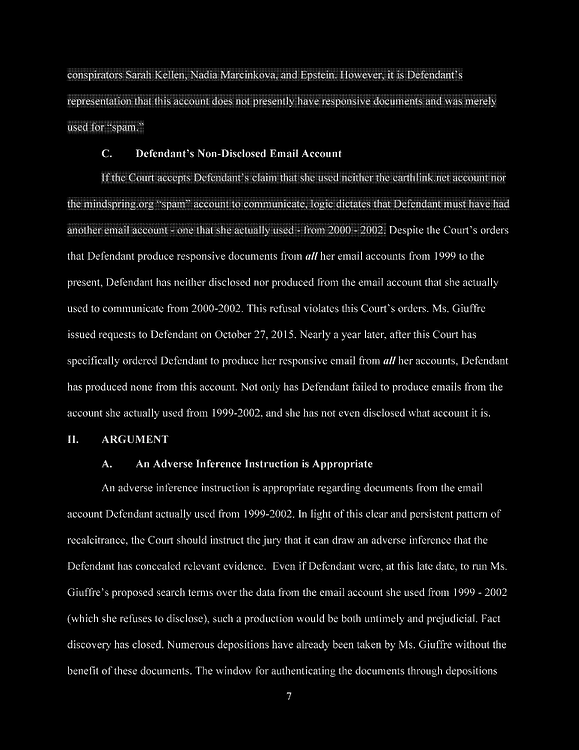 Finally, Defendant denies using her gmax1@mindspring.com account for anything other than spam, despite the fact that the account was set up by Jeffrey Epstein for the purpose of sending electronic communications to members of his household.