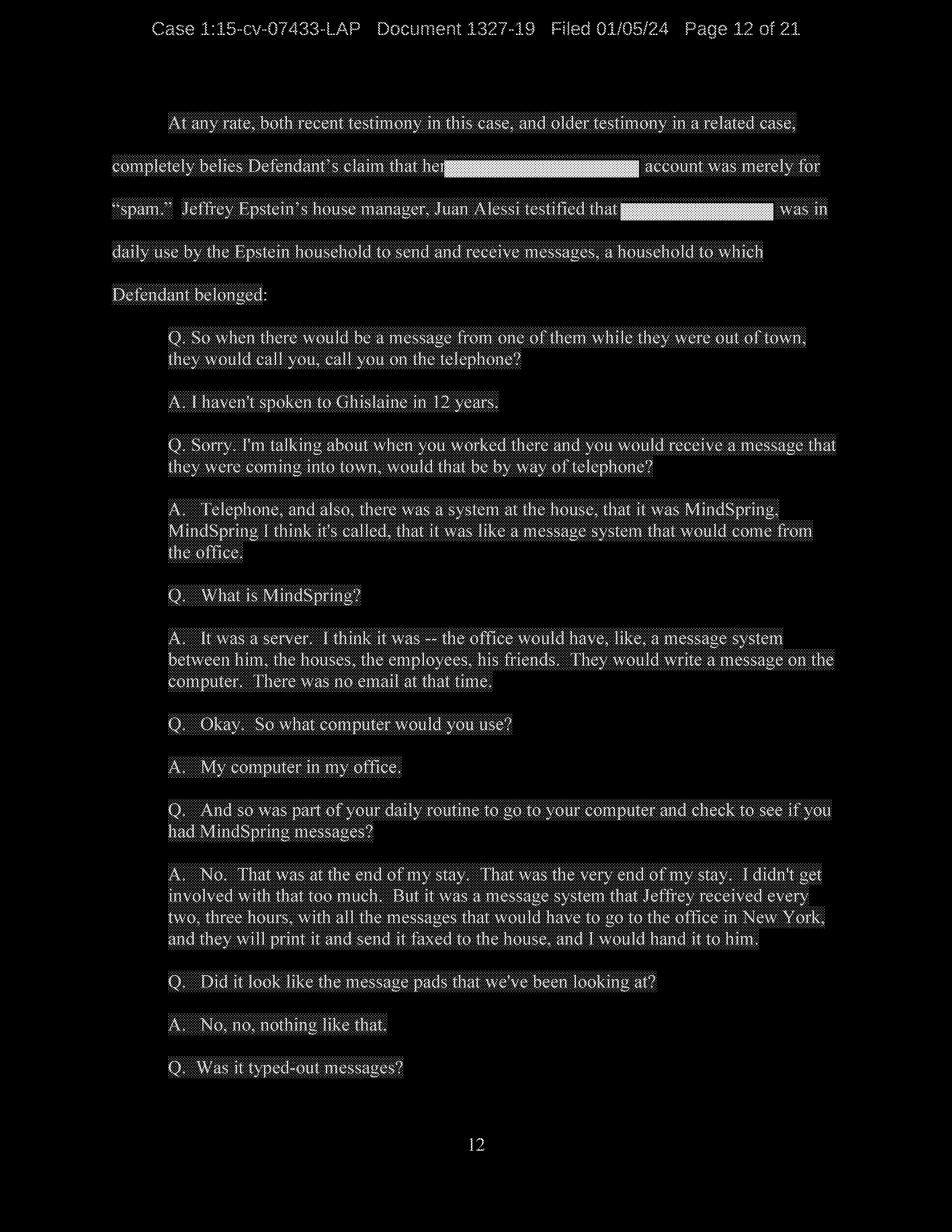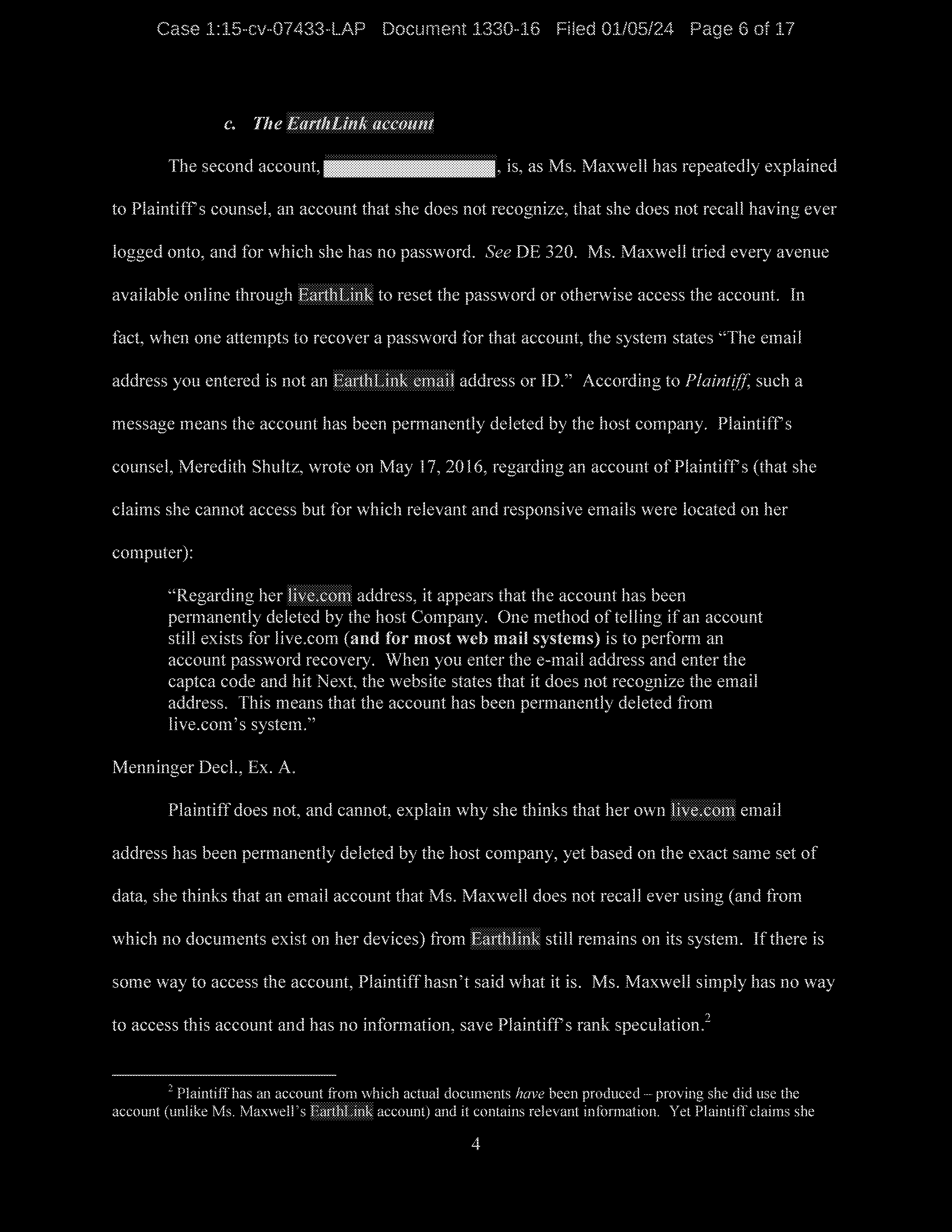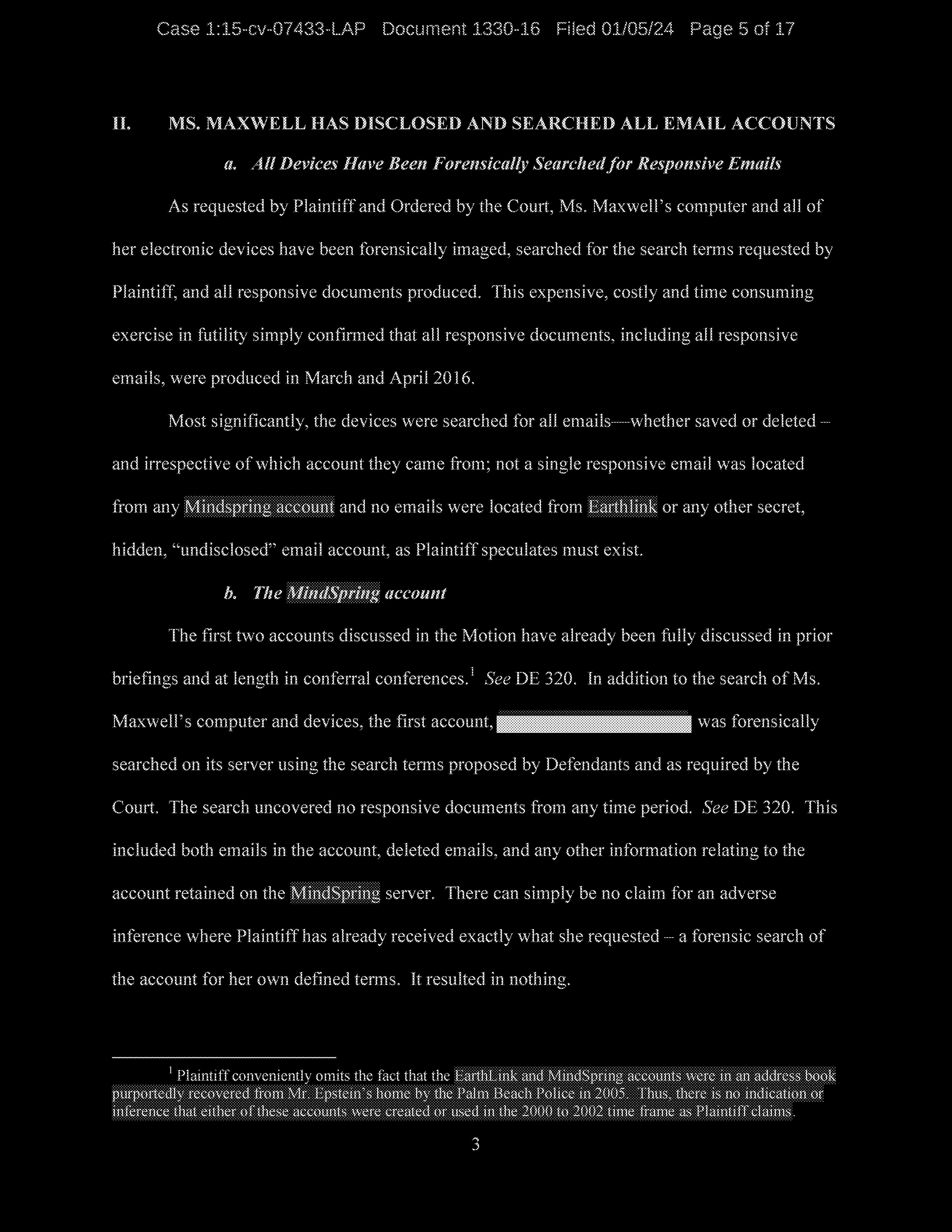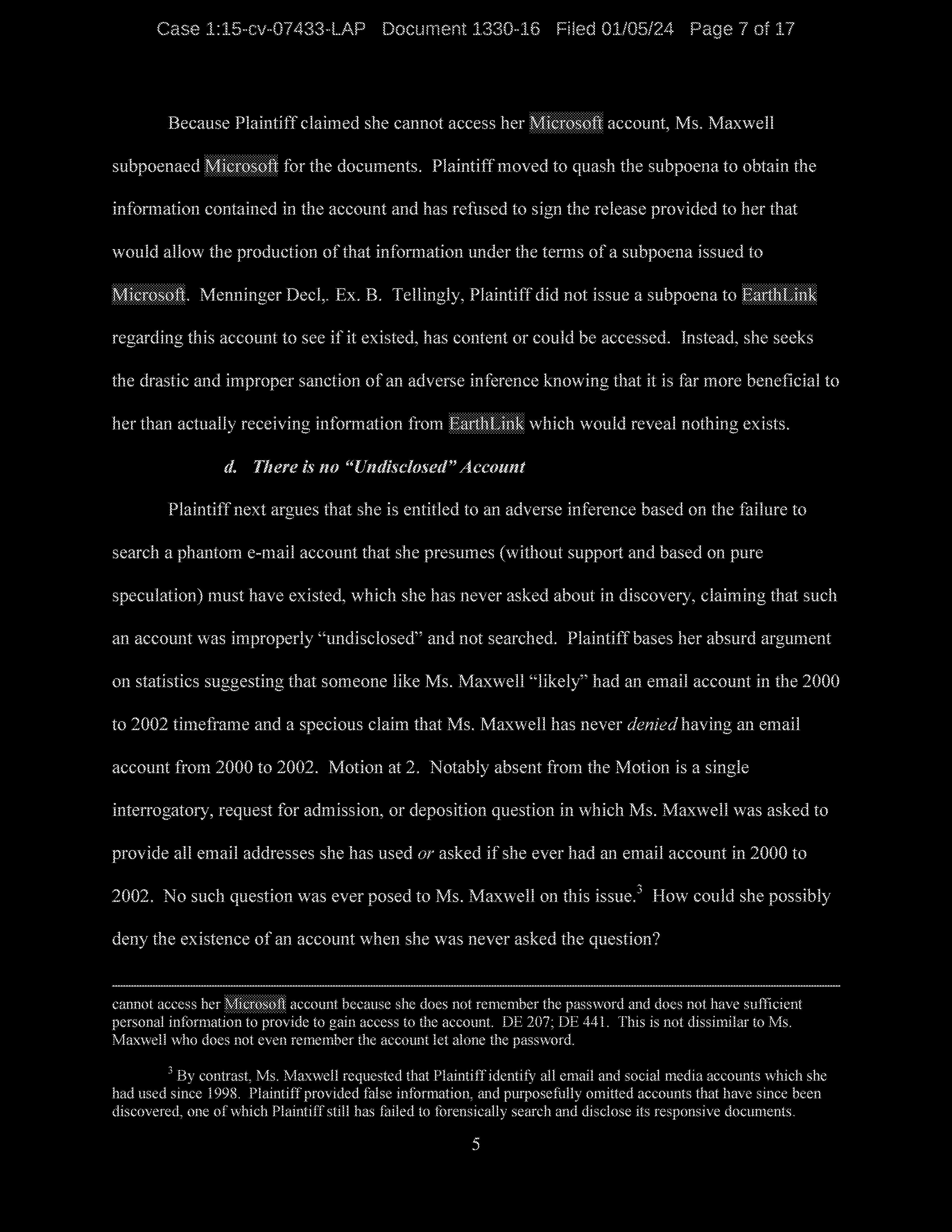 Finally, Defendant denies using her gmax1@mindspring.com account for anything other than spam, despite the fact that the account was set up by Jeffrey Epstein for the purpose of sending electronic communications to members of his household.