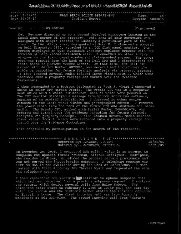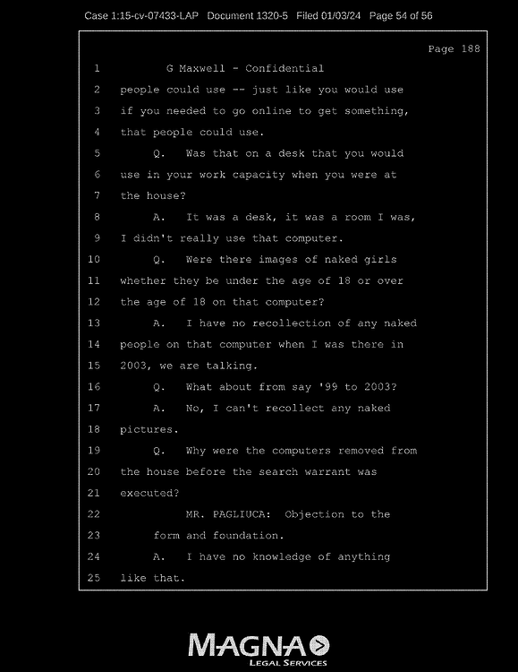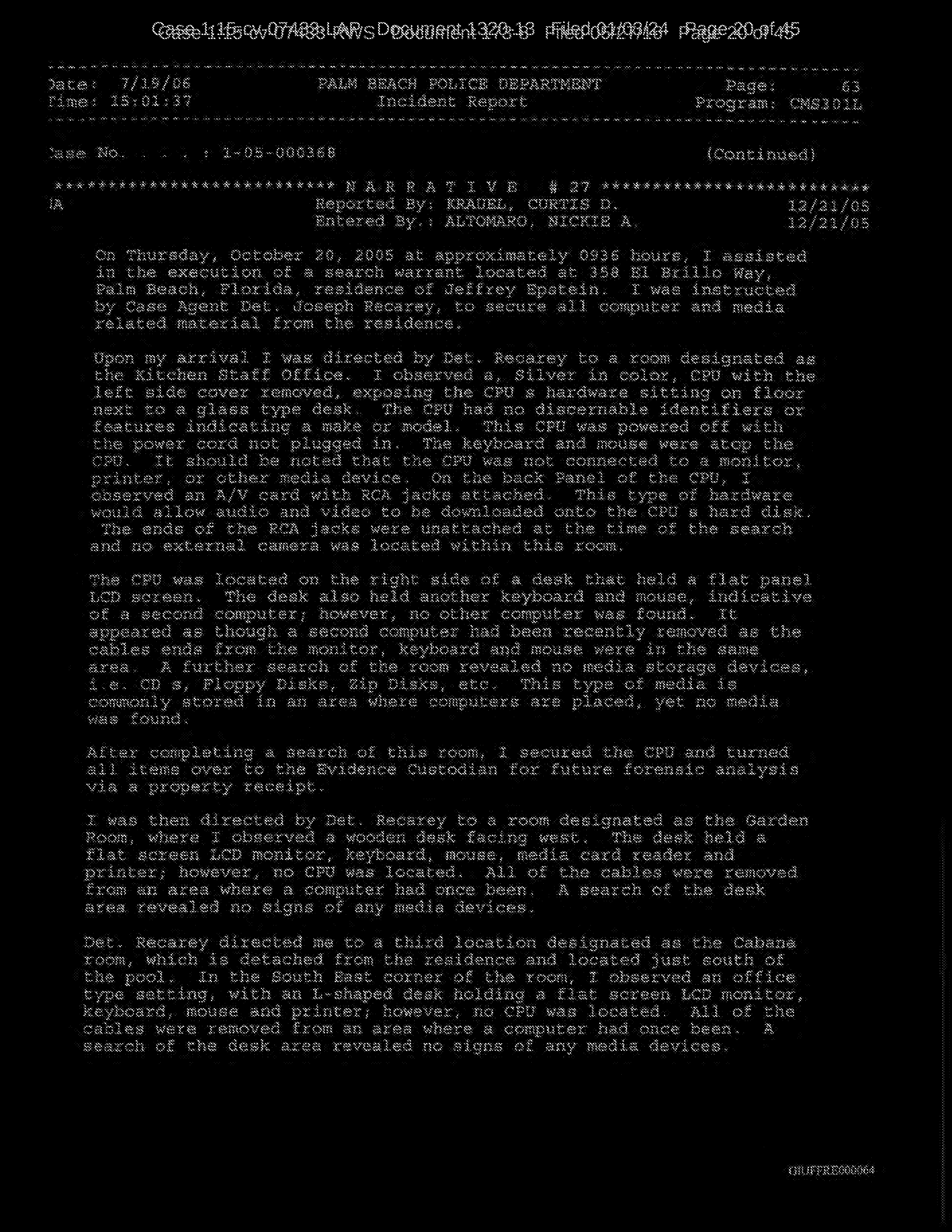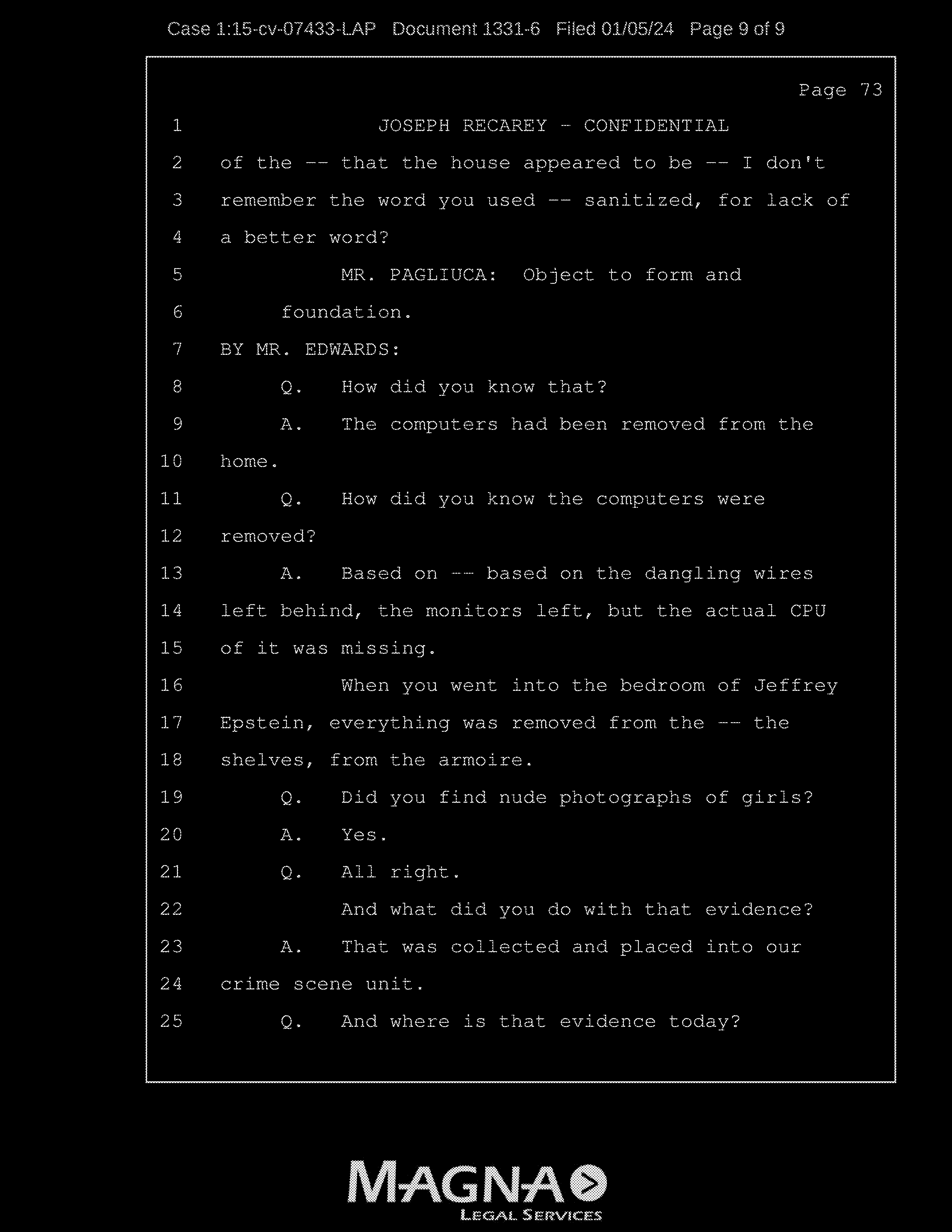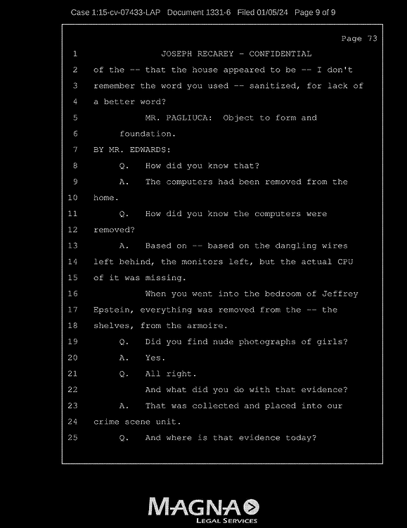 A: Based on – based on the dangling wires left behind, the monitors left, but the actual CPU of it was missing. When you went into the bedroom of Jeffrey Epstein, everything was removed from the – the shelves, from the armoire.