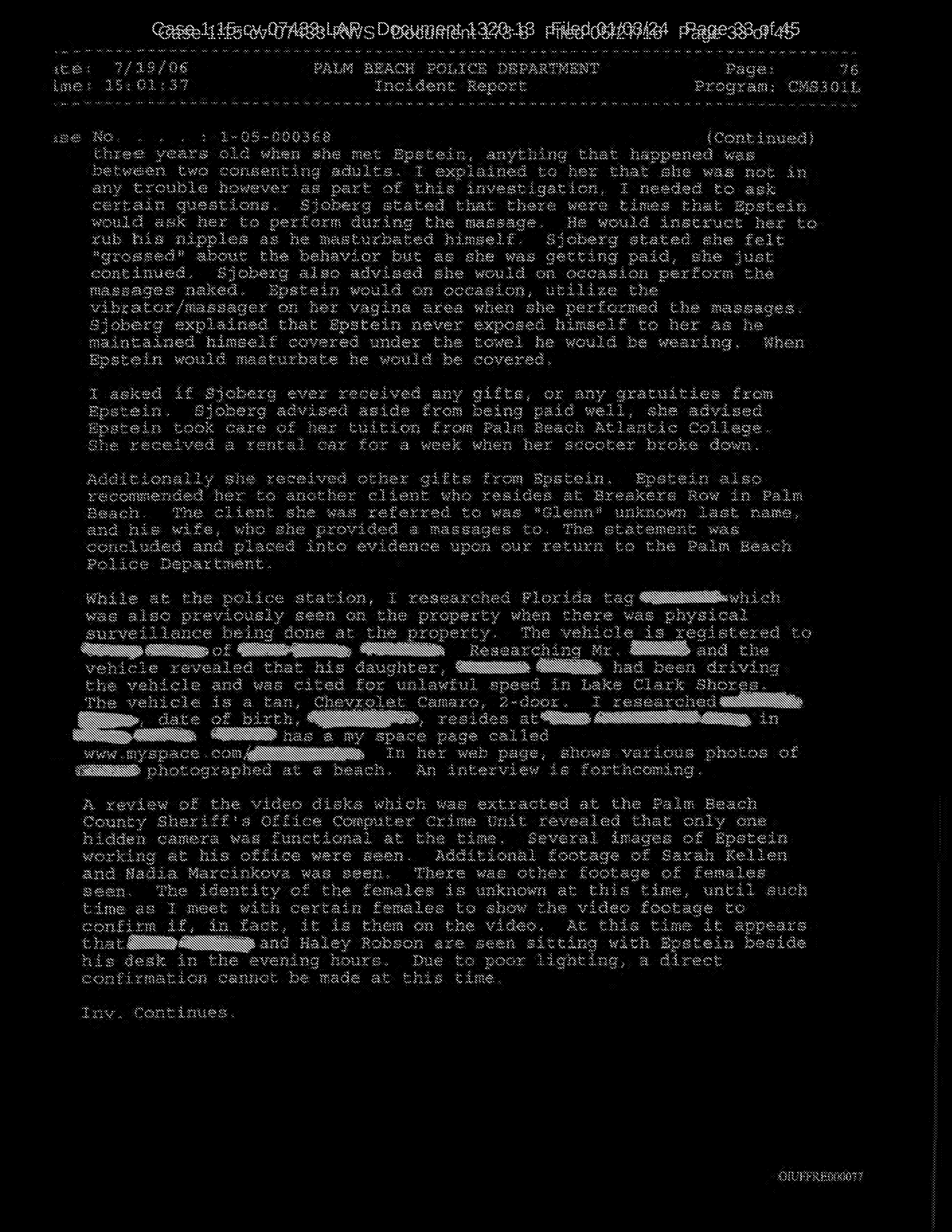 A review of the video disks which was extracted at the Palm Beach Country Sheriff’s Office Computer Crime Unit revealed that only one hidden camera was functional at the time. Several images of Epstein working at his office were seen. Additional footage of Sarah Kellen and Nadia Marcinkova were seen. Additional footage of Sarah Kellen and Nadia Marcinkova was seen. There was other footage of females seen. The identity of the females is unknown at this time, until such time as I meet with certain females to show the video footage to confirm, in fact, it is them on the video. At this time it appears that [NAME] and Haley Robson are seen sitting with Epstein beside his desk in the evening hours. Due to poor lighting, a direct confirmation cannot be made at this time.