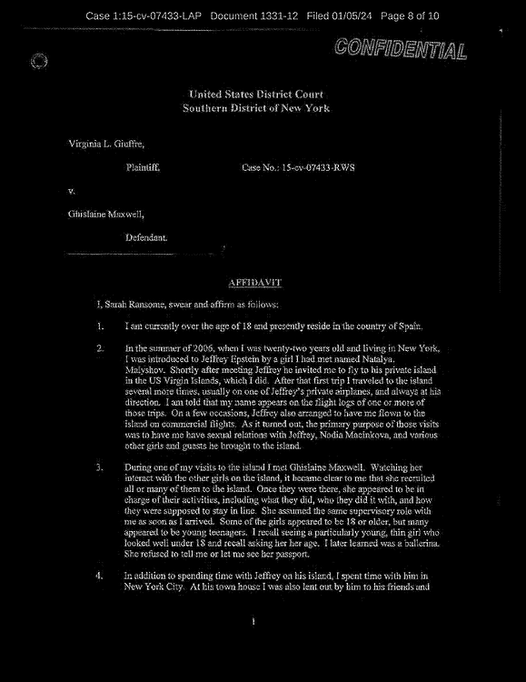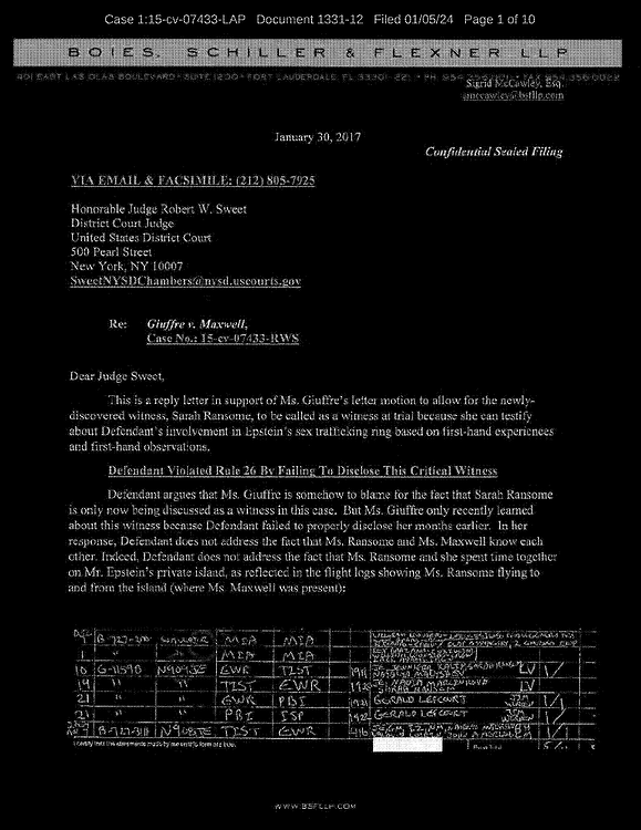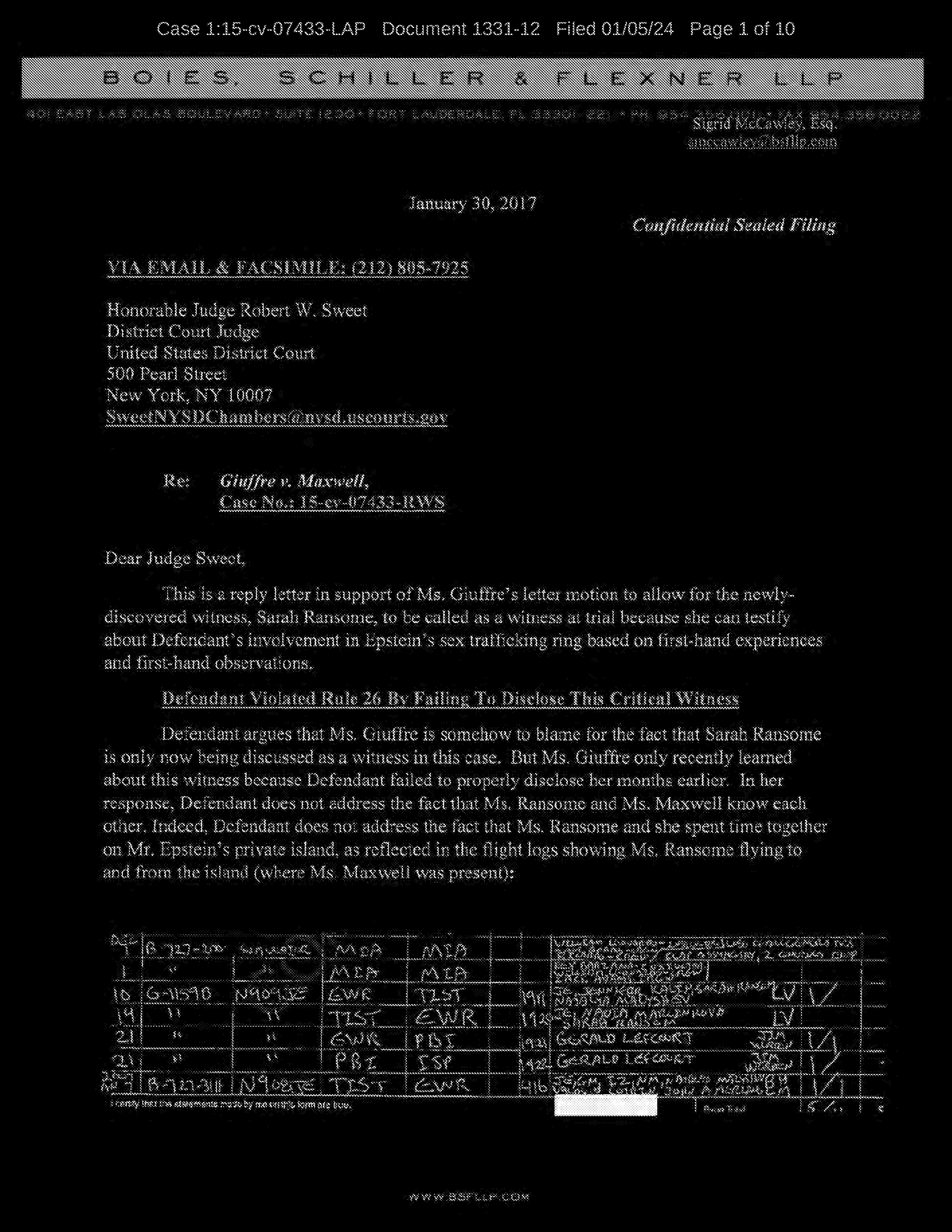 Ms. Ransome and Ms. Maxwell know each other. Indeed, Defendant does not address the fact that Ms. Ransome and she spent time together on Mr. Epstein’s private island, as reflected in the flight logs showing Ms. Ransome flying to and from the island (where Ms. Maxwell was present)