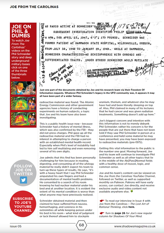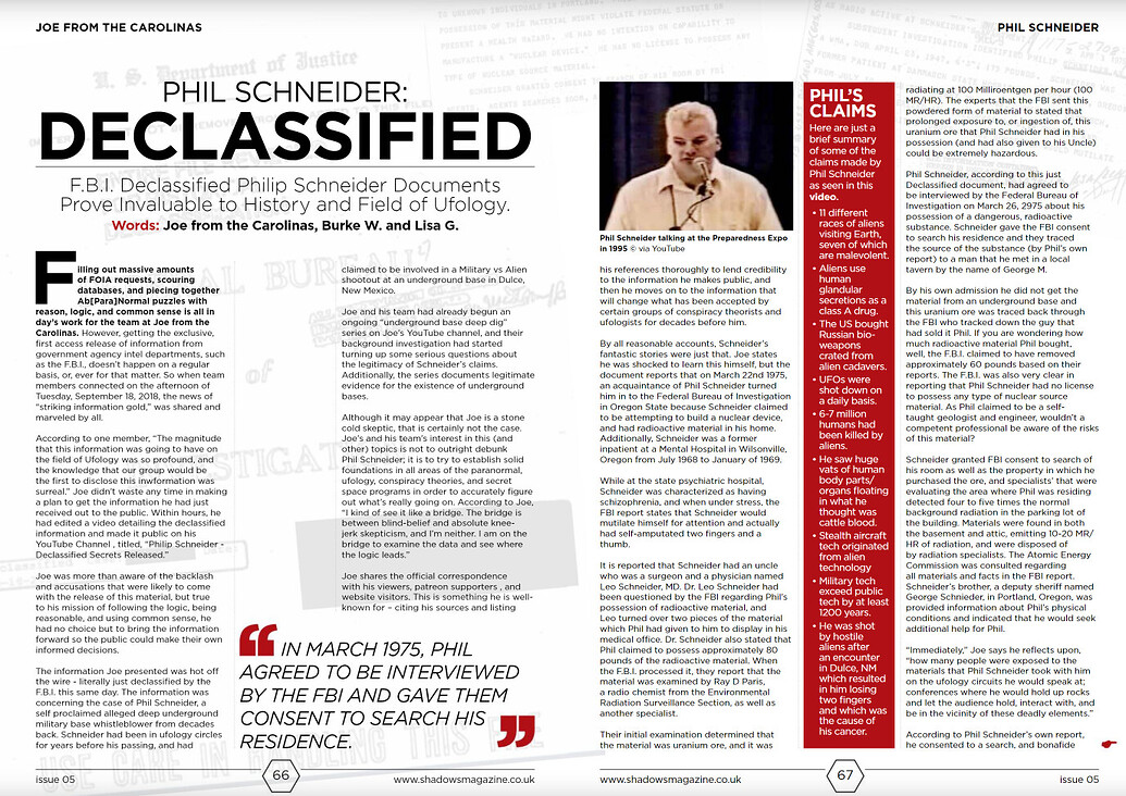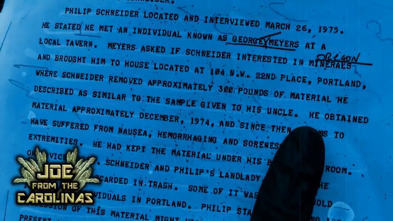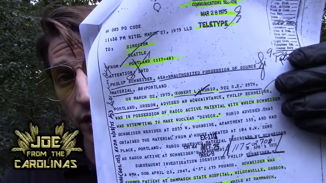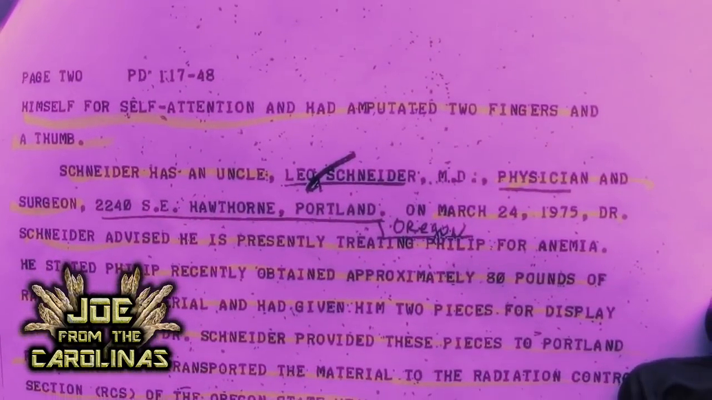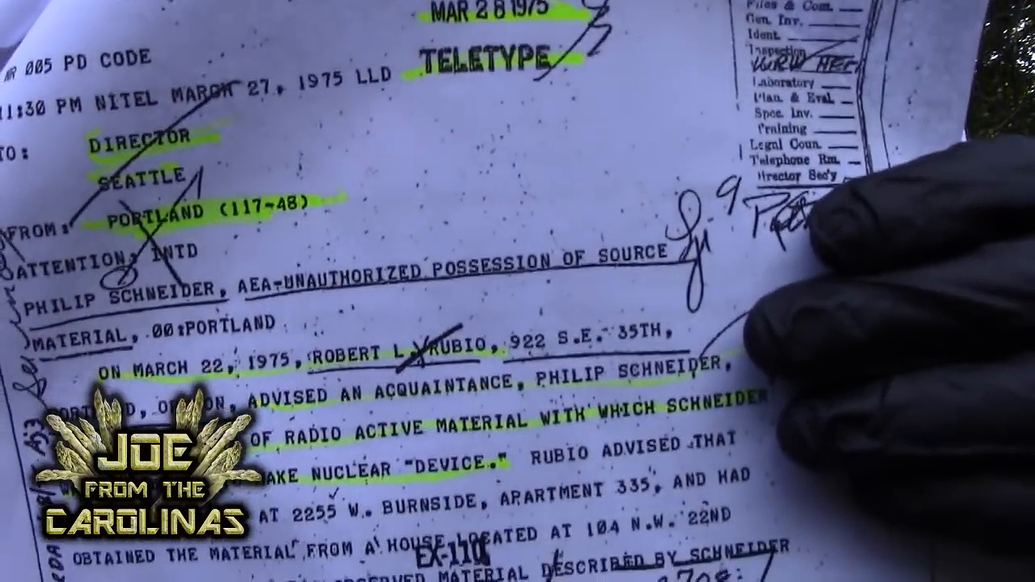 Around 2018 Joe from Carolina (BeyondTheory on YouTube) and his research team issued a FOIA request about Phil Schneider to the FBI. On March 22, 1975 an acquaintance of Phil Schneider turned him into the FBI in Oregon. Phil claimed to have been attempting to build a nuclear device, and had radioactive materials: