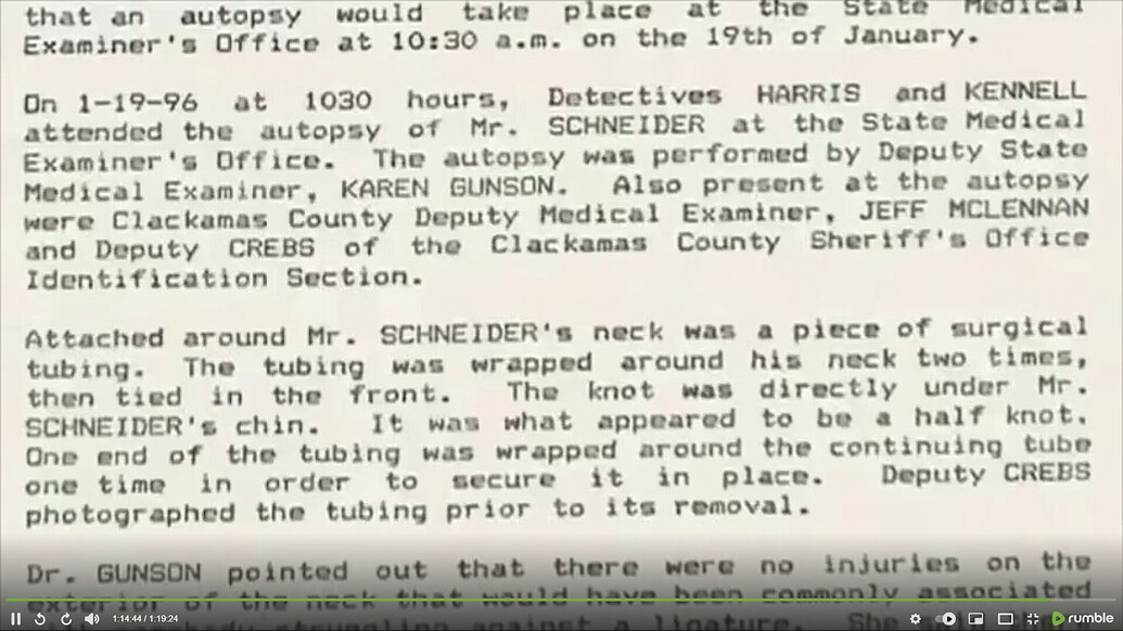 After the initial cause of Philipâs death was listed as a stroke, Cynthia asked to see the body before it was to be prepared for cremation. She was dissuaded by the funeral director who felt that the bodyâs advanced state of decomposition would be too traumatic. However, she could not shake the feeling that something was wrong. The next day Cynthia was contacted by Detective Randy Harris who said that âsomething was wrongâ - that there were marks on Philipâs neck. Philip Schneiderâs body was removed from the funeral home and autopsied by Dr. Karen Gunson, Medical Examiner for Multnomah County, Oregon.