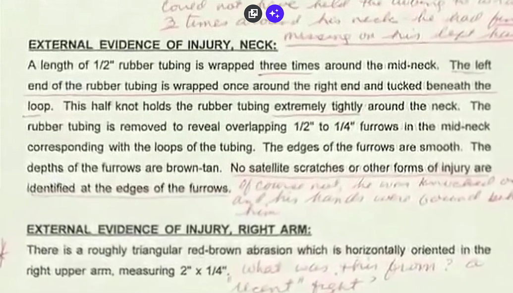 Philip had missing fingers on his left hand, and limited motion in his shoulders. I believe that it was physically impossible for Philip to have held the rubber hose in his left hand with missing fingers and then wrap the hose three times with shoulders that had limited motion. In order to end up where his body was, he had to sit on the edge of his bed, wrap the hose around his neck, slowly and painfully strangle to death, and fallen head first into a wheelchair.