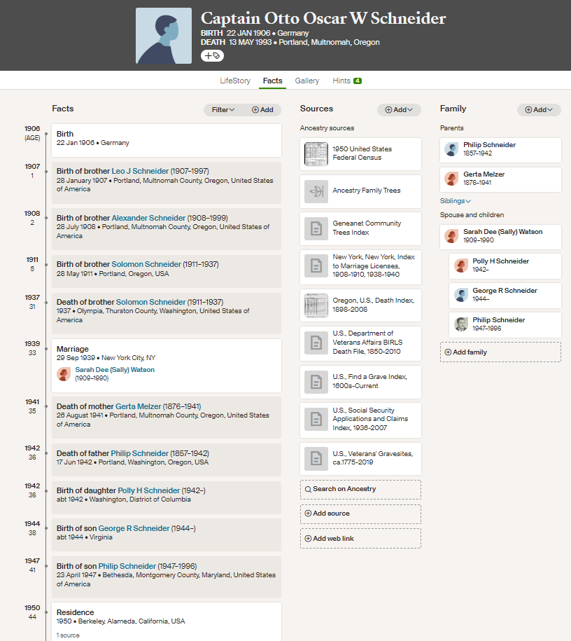 Public records show that Philâs grandfather moved to the US (probably from Germany) around 1907, obviously long before WW2. Public marriage records show that Philâs father was married to his mother âSarah Dee (Sally) Watsonâ at NYC in 1939. A bunch of Philâs uncles were born in Portland, beginning in 1907, and his sister Polly was born in Washington DC during WW2 in 1942.