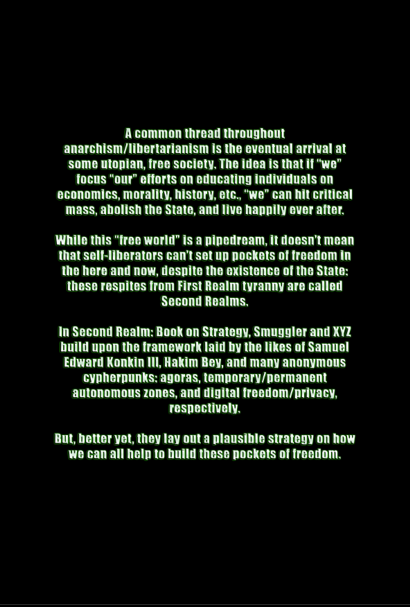 A common thread throughout anarchism/libertarianism is the eventual arrival at some utopian, free society. The idea is that if “we” focus “our” efforts on educating individuals on economics, morality, history, etc., “we” can hit critical mass, abolish the State, and live happily ever after. While this “free world” is a pipedream, it doesn’t mean that self-liberators can’t set up pockets of freedom in the here and now, despite the existence of the State: these respites from First Realm tyranny are called Second Realms. In Second Realm: Book on Strategy, Smuggler and XYZ build upon the framework laid by the likes of Samuel Edward Konkin III, Hakim Bey, and many anonymous cypherpunks: agoras, temporary/permanent autonomous zones, and digital freedom/privacy, respectively. But, the truly unique thing these authors were able to formulate was the merging of the physical and digital realms.