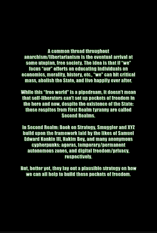 In Second Realm: Book on Strategy, Smuggler and XYZ build upon the framework laid by the likes of Samuel Edward Konkin III, Hakim Bey, and many anonymous cypherpunks: agoras, temporary/permanent autonomous zones, and digital freedom/privacy, respectively. But, the truly unique thing these authors were able to formulate was the merging of the physical and digital realms.