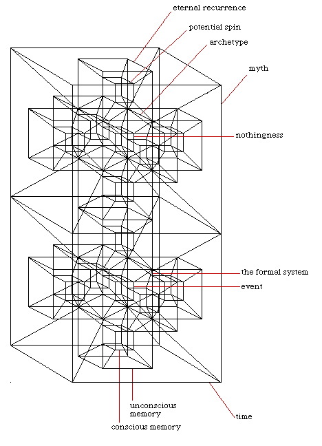 the hypercubic hypercross contained within the above hypercube represents the contents of figure 6 (the multiverse) as it would be perceived by figure 4 (consciousness).