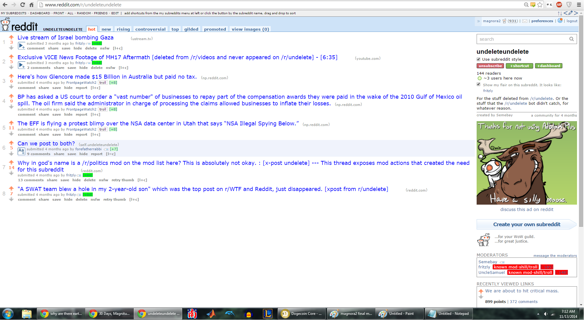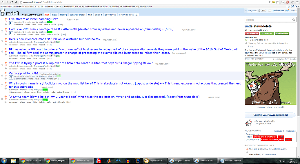 Anyway, as a consequence of all this, I was no longer moderator of /r/undeleteundelete. My popular post about censorship from /r/undelete no longer appears in the top of all time list. They shut me down.