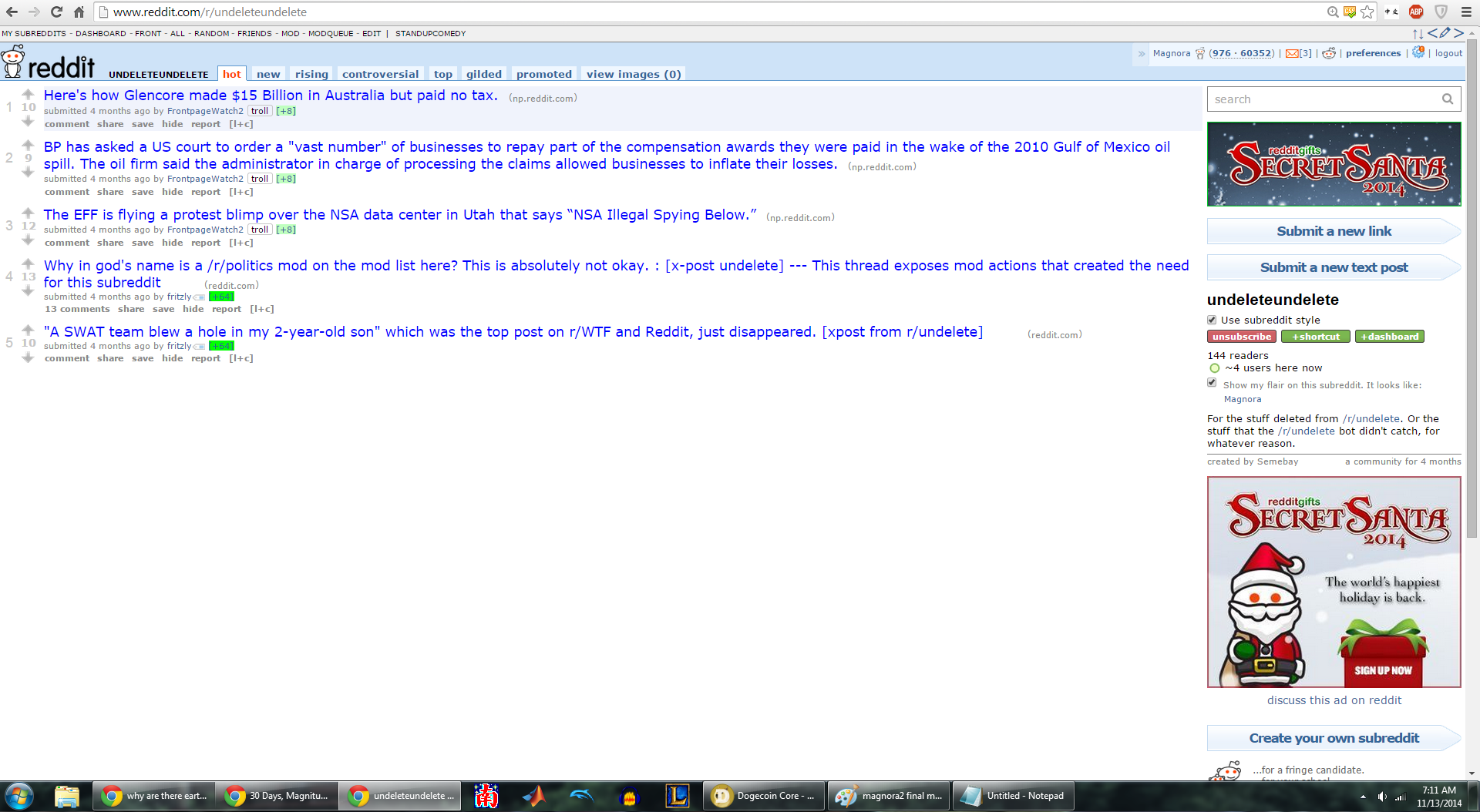 You perhaps may remember me from 5 months ago, by the name /r/magnora2 from my /r/undelete meta-post âWe are about to reach critical mass.â It got to #5 of all time on that subreddit, and was crossposted to /r/conspiracy and got highly upvoted as well. Hereâs the post http://www.reddit.com/r/undelete/comments/27v0oh/we_are_about_to_hit_critical_mass/