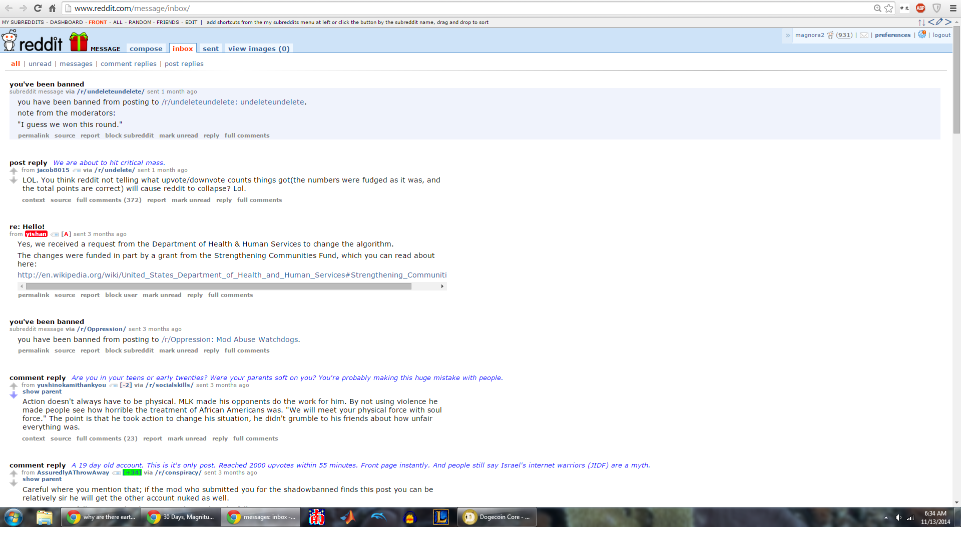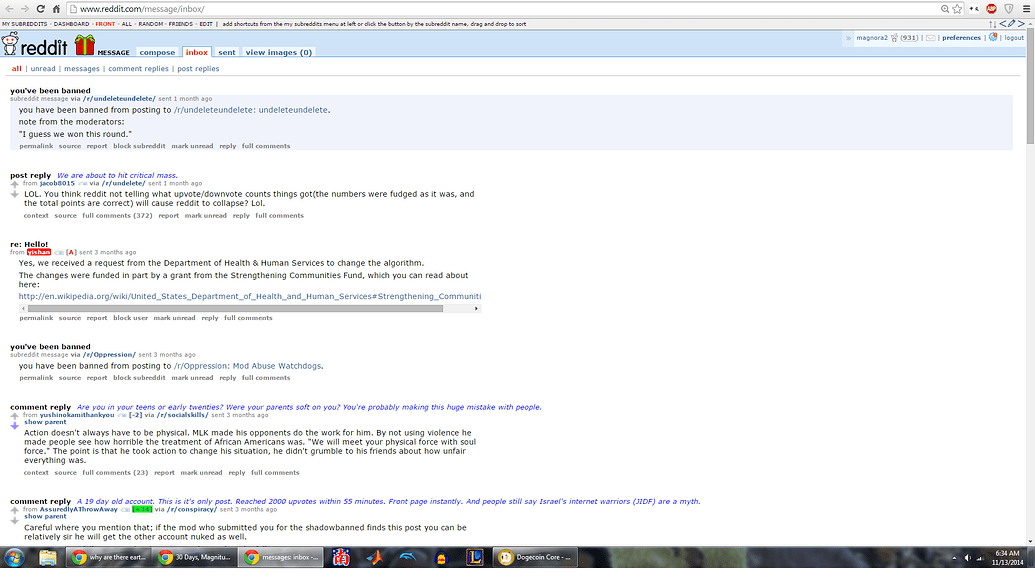 Today, I log in to /u/magnora2 for the first time in a long time just for kicks. I see that I have a new mail. How odd, since that account is shadowbanned. I opened it up, and this is what I see. Read the first message: