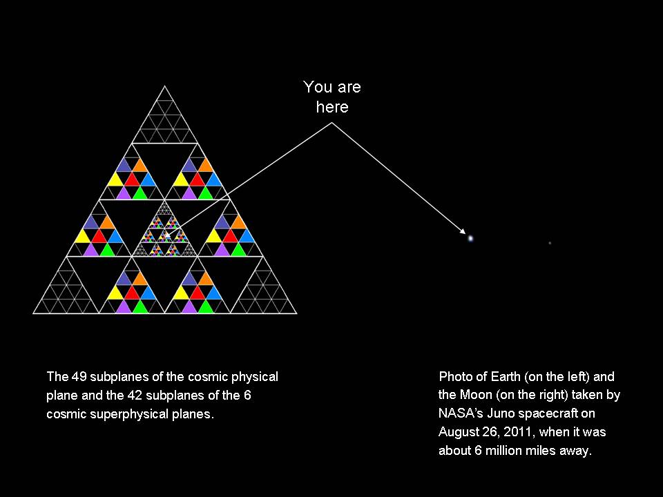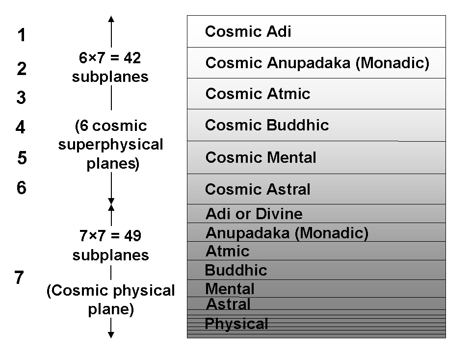 The mathematical scheme expressed in the Cosmic Tetractys has the following natural, Theosophical interpretation: Theosophy teaches that there are seven planes of consciousness (see here). The most material plane is the physical plane. This is the physical universe, the space-time continuum, revealed by the five senses and by science’s instrumental extensions of them, such as the microscope and the telescope. Beyond (or, rather, interpenetrating) it are the astral, mental, buddhic, atmic, anupadaka (monadic) & adi (divine) planes.* Each plane is divided into seven subplanes, so that the seven planes have (7×7=49) subplanes. They constitute the “cosmic physical plane.” Beyond them are six, still higher, cosmic superphysical planes, each composed of seven subplanes, totalling 42 subplanes. This means that the seven cosmic planes comprise (49+42=91) subplanes, where