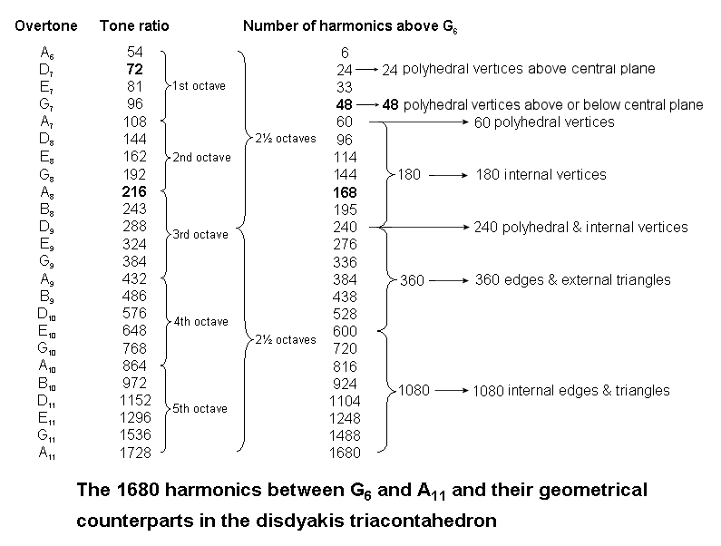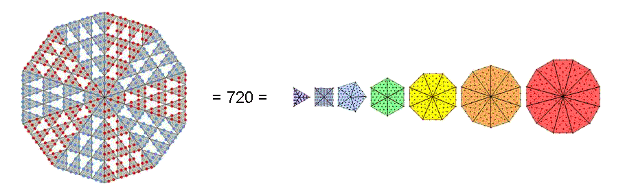 Their possession of this parameter of the inner Tree of Life demonstrates the holistic character of the five Platonic solids — how they embody archetypal numbers that parameterise any holistic system. The number 720 appears also in the first four Platonic solids, as well as in the disdyakis triacontahedron (see Fig. 7 here) and as the 720 edges of the 600-cell, which is the polychoron counterpart of each half of the inner form of 10 Trees of Life (see section entitled “The holistic 120:720 division in the two 600-cells and in sacred geometries” here).