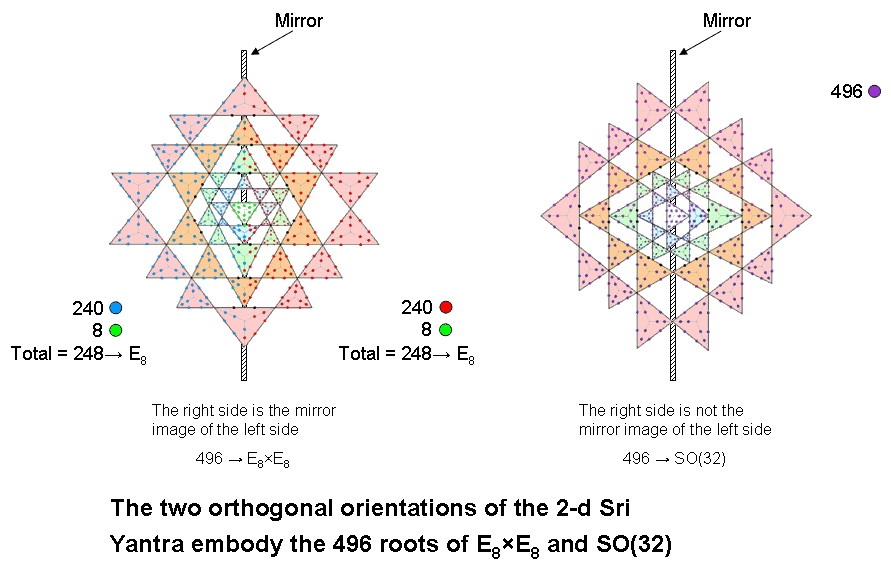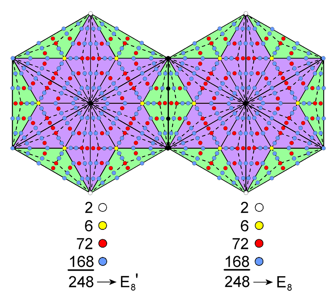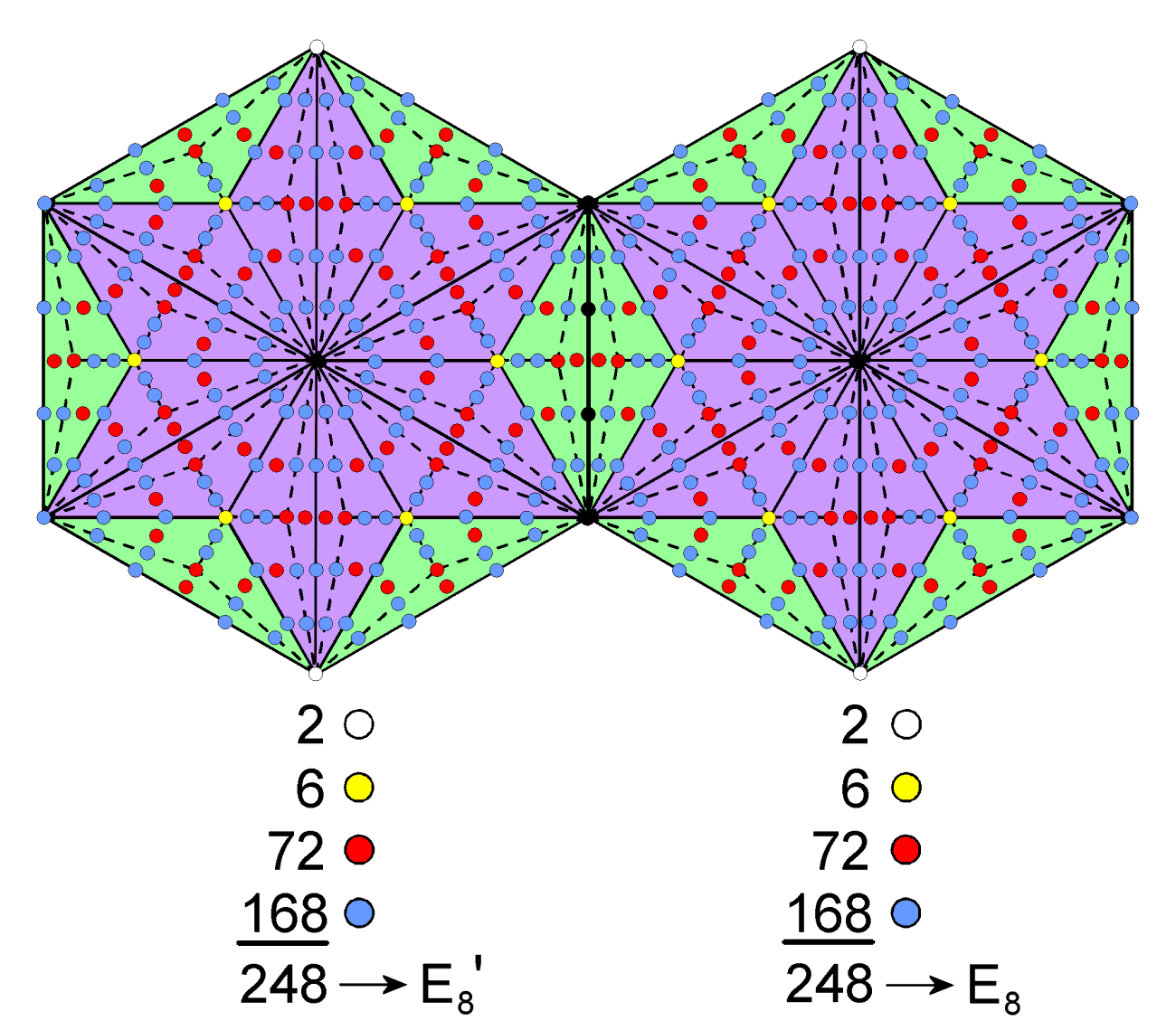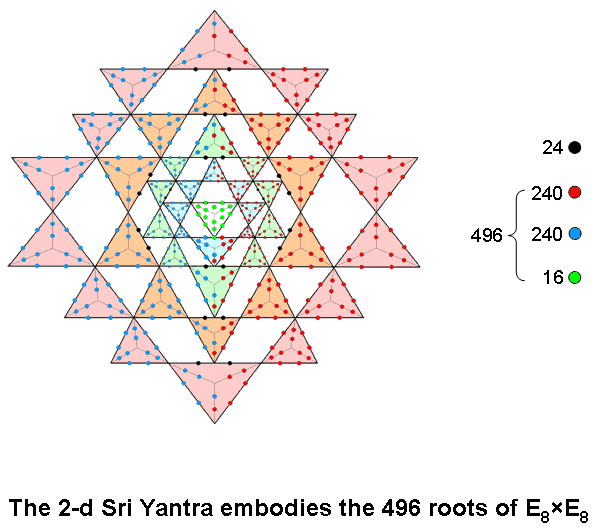 The two white yods denote the two simple roots of E8 that are not simple roots (denoted by the six yellow yods) of its exceptional subgroup E6, which has 72 roots denoted by the 72 red yods, the remaining 168 roots being denoted by the 168 blue yods. Also illustrated here is the amazing power of the tetractys to reveal in sacred geometries numbers of prime significance to theoretical physics (in this case, the dimension 496 of E8×E8′, one of the two possible symmetry groups describing the anomaly-free forces between heterotic superstrings). See also here.