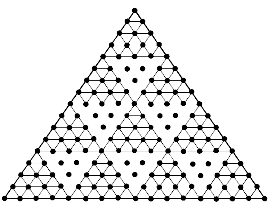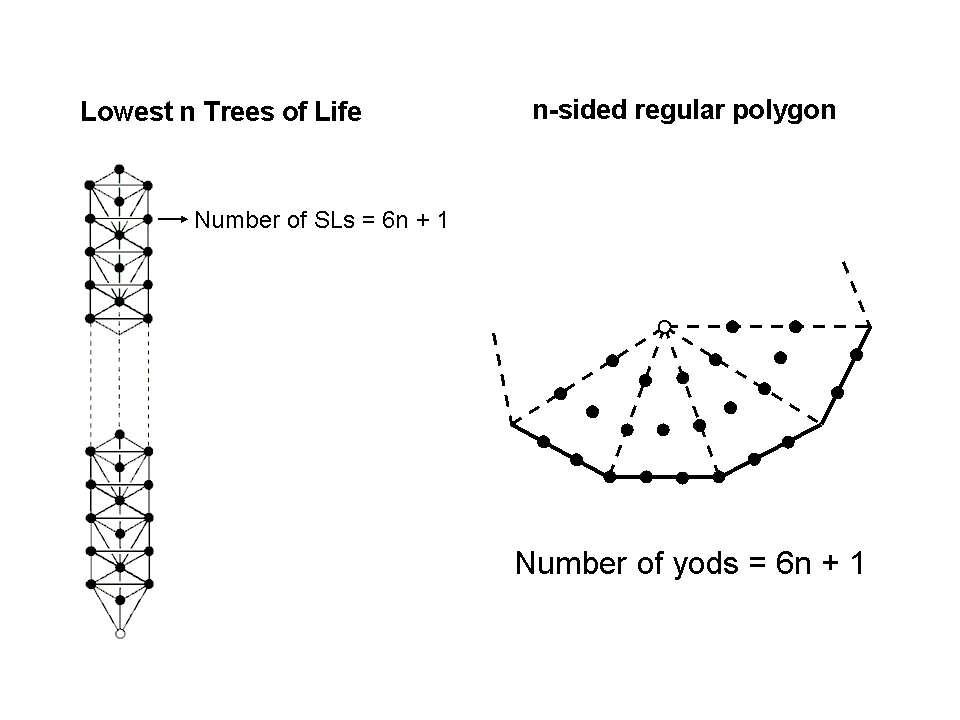 The ten yods in the tetractys symbolize the ten Sephiroth, each of which can be represented by a Tree of Life. Suppose, then, that we regard as a Tree of Life each of the 91 triangles (all ‘yods’ of tetractys arrays of ten triangles) in the Cosmic Tetractys representing differentiations of the Sephiroth of Construction. How many Sephirothic levels, or ‘SLs,’ are there in the 91 overlapping Trees of Life? The formula for the number N(n) of SLs in n overlapping Trees of Life is*: