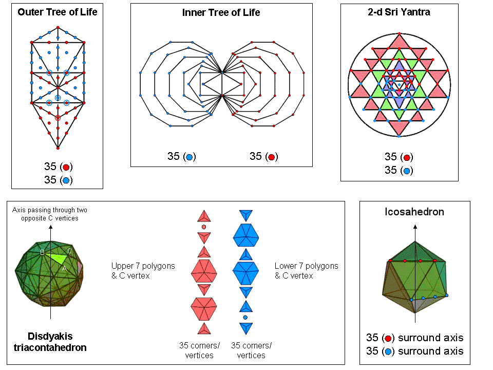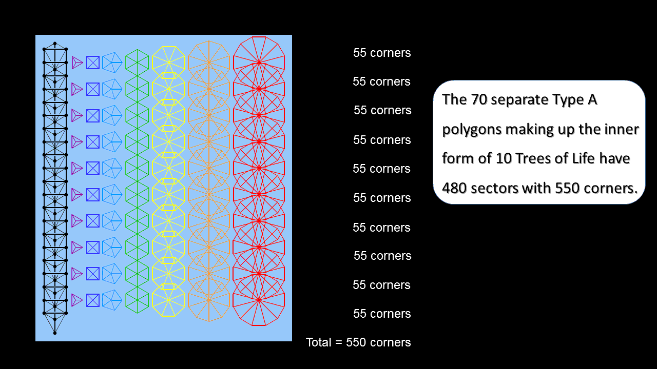 Their 50 faces have 180 triangular sectors with (90+180=270) sides. When the triangles are Type A, (3×180=540) sides are added, making a total of 810 sides. Joining the (50+50=100) vertices & face-centres to the centres of the five Platonic solids adds 100 sides, whilst the 270 internal triangles have (3×270=810) other sides when they are Type A. Hence, there are (810+100+810=1720) sides. The number of corners, sides & triangles in the five Platonic solids = 550 + 1720 + 1350 = 3620 = 362×10, where 362 is the number of yods in the two Type B dodecagons present in the inner form of the Tree of Life: