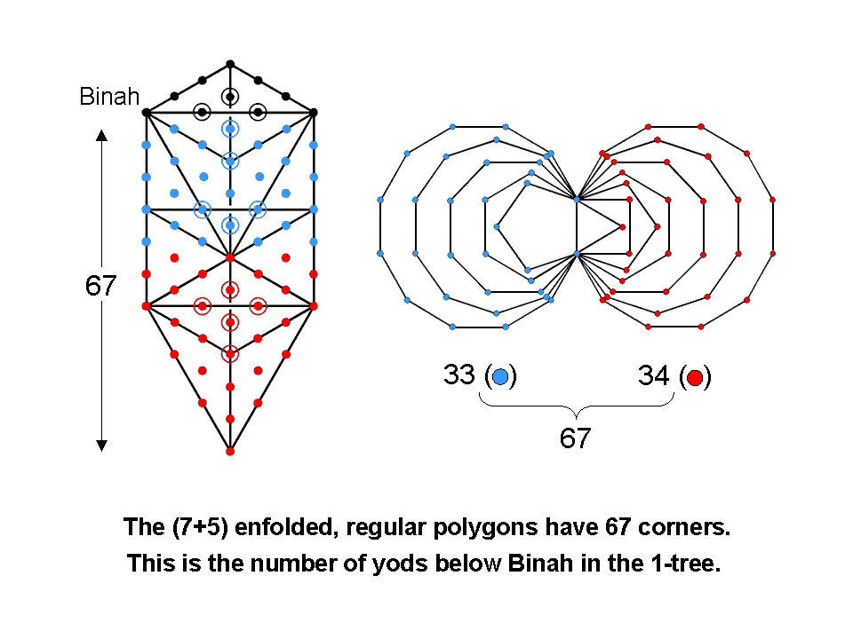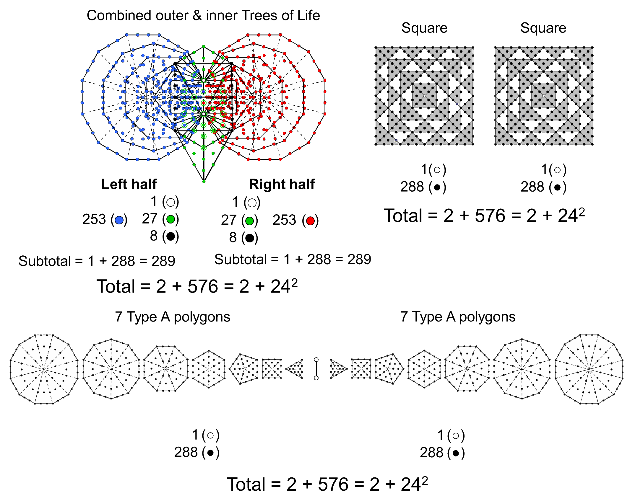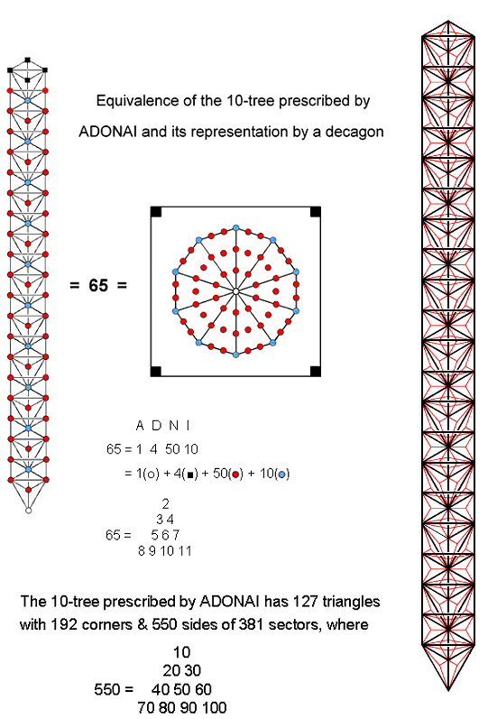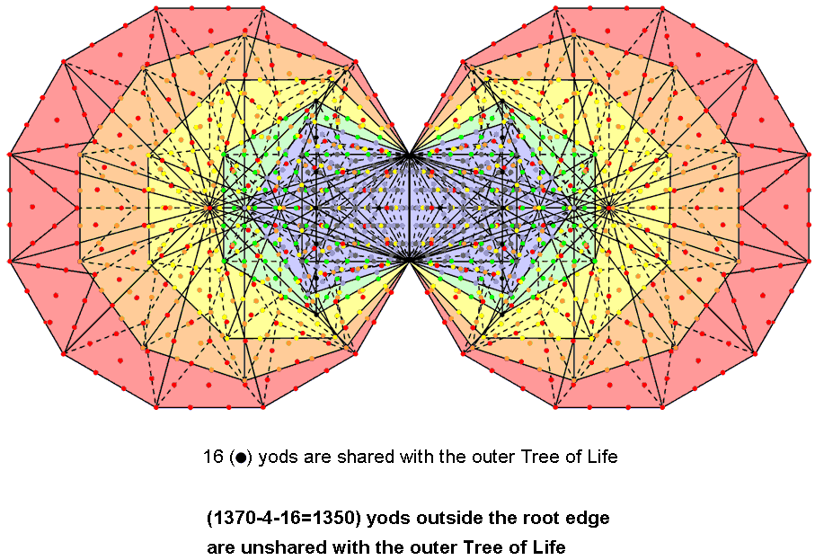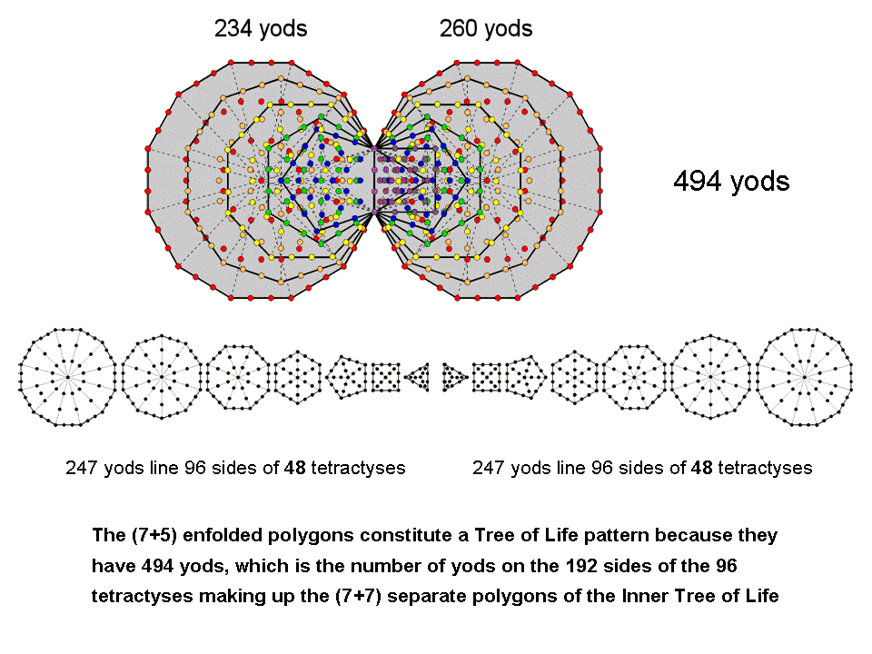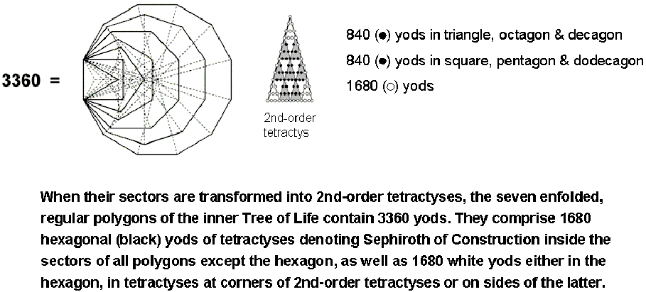 Each dodecagon embodies (apart from the Pythagorean factor of 10) the number of geometrical elements in each half of the five Platonic solids. Of these geometrical elements, 20 corners & sides make up their axes, which are therefore surrounded by (3620−20=3600) geometrical elements, 1800 being in the five upper halves and 1800 being in their five lower halves. As 1800 = 50×36, where 50 is the number of ELOHIM, the Godname of Binah, and 36 is the number of ELOHA, the Godname of Geburah, the Sephirah below Binah in the Tree of Life, we see how these Sephiroth on the Pillar of Judgement determine the geometrical composition of the regular polyhedral representation of the Tree of Life. On average, the number of geometrical elements surrounding the axis of a Platonic solid constructed from Type A triangles = 3600/5 = 720. There are 360 (=36×10) such geometrical elements on average in each half of a Platonic solid. They correspond to the 360 yods surrounding the centres of the two Type B dodecagons. The number 720 = 72×10, where 72 is the number of Chesed, the Sephirah opposite Geburah in the outer Tree of Life. The centre of a decagon whose sectors are 2nd-order tetractyses is surrounded by 720 yods,* whilst the centres of the seven separate polygons of the inner Tree of Life are surrounded by 720 yods when all the polygons are Type B.**