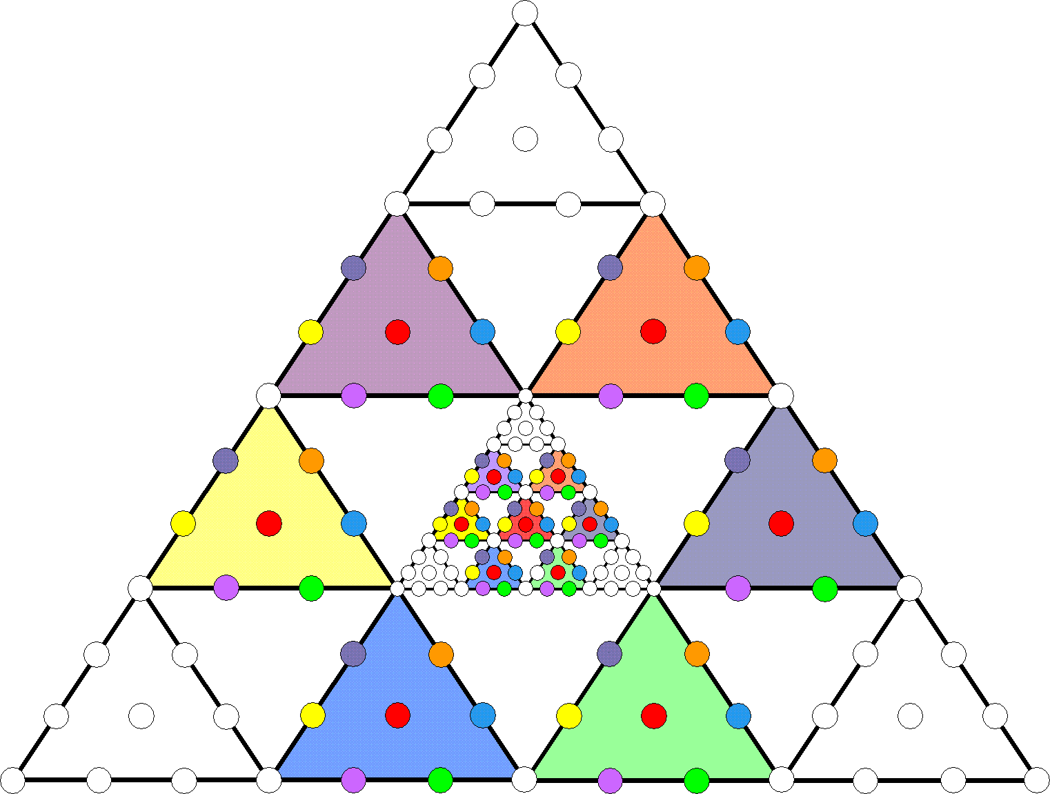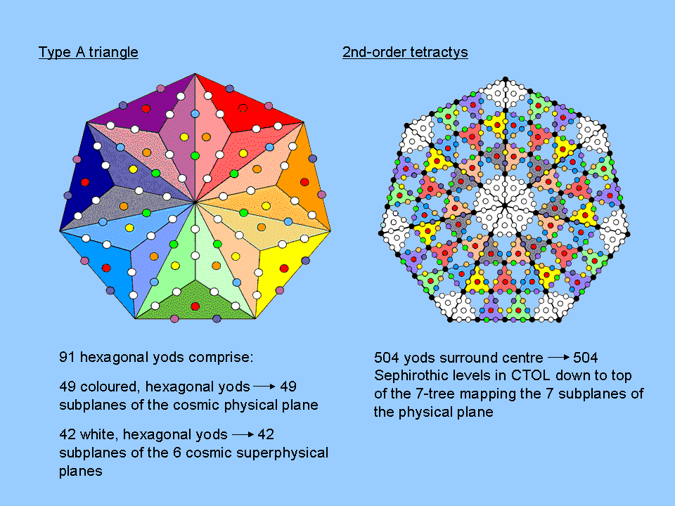 A symbol of the seven-fold nature of Man and the seven Sephiroth of the spiritual cosmos, the heptagon has 91 hexagonal yods when its sectors are Type A triangles. Each denotes one of the subplanes of the seven cosmic planes of consciousness and one of the Trees of Life in CTOL. The 49 coloured, hexagonal yods either at the centres of tetractyses or lining their sides denote the 49 Trees of the 49-tree that maps the cosmic physical plane; the 42 white hexagonal yods on sides of tetractyses inside each sector of the heptagon denote the 42 Trees of Life above the 49-tree that map the 42 subplanes of the six cosmic superphysical planes. This is the single, polygonal representation of CTOL.