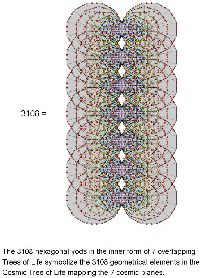 They have 444 hexagonal yods (see here). As 3108 = 7×444, the (49+49) regular polygons making up the inner form of seven overlapping Trees contain 3108 hexagonal yods: