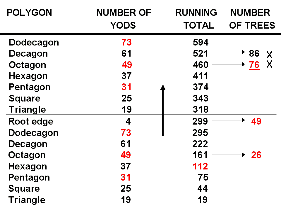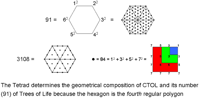 Notice that 3108 = 444×7, where 7 is the fourth odd integer. As 3108 = 37×84, where 37 is the number of yods in the Type A hexagon, the fourth type of regular polygon, and 84 = 1² + 3² + 5² + 7², we see that the Tetrad determines the number quantifying the geometrical composition of CTOL, as well as its number (91) of Trees of Life, because the Type B hexagon has 91 yods: