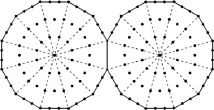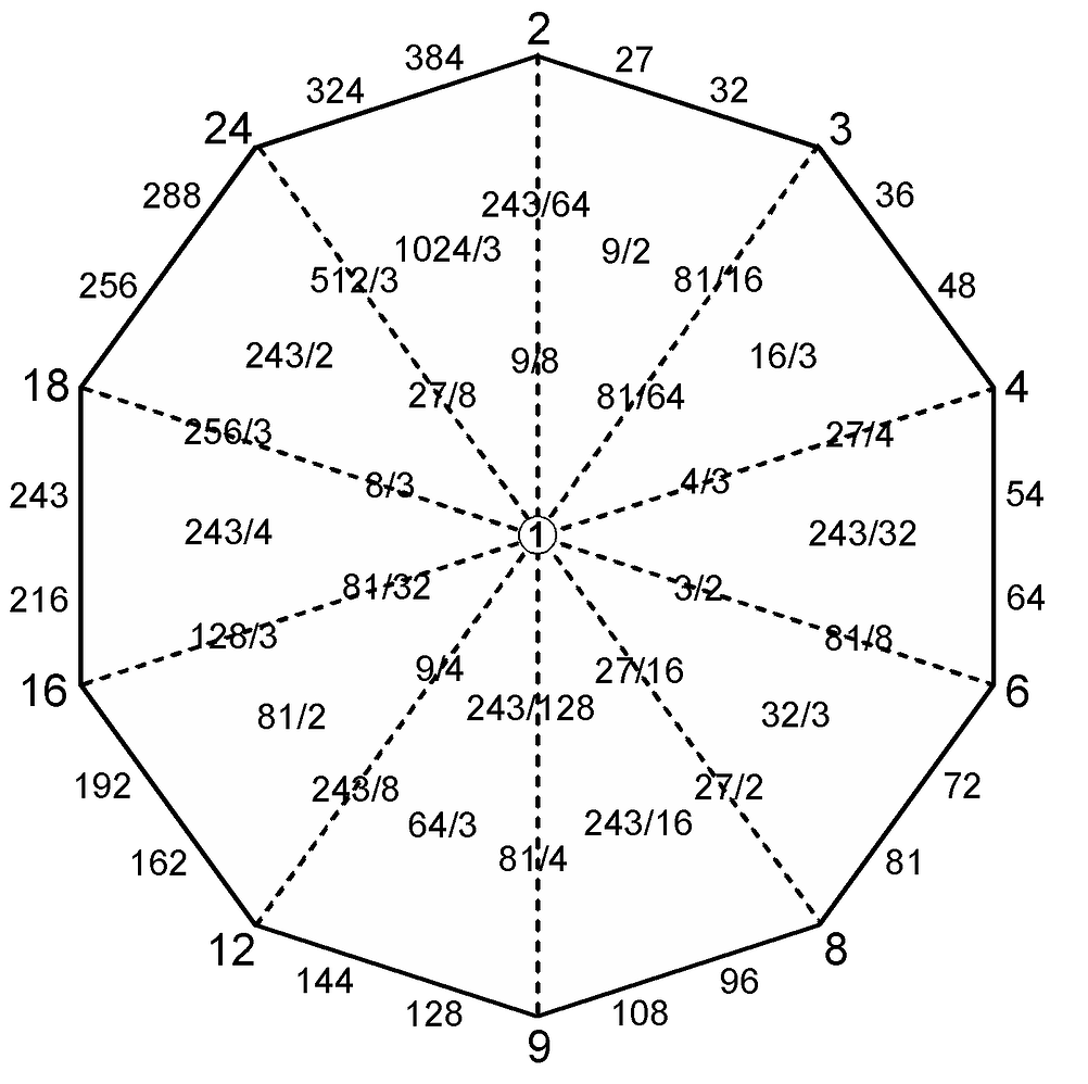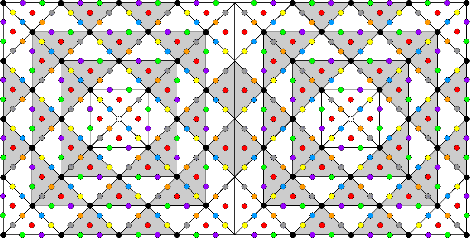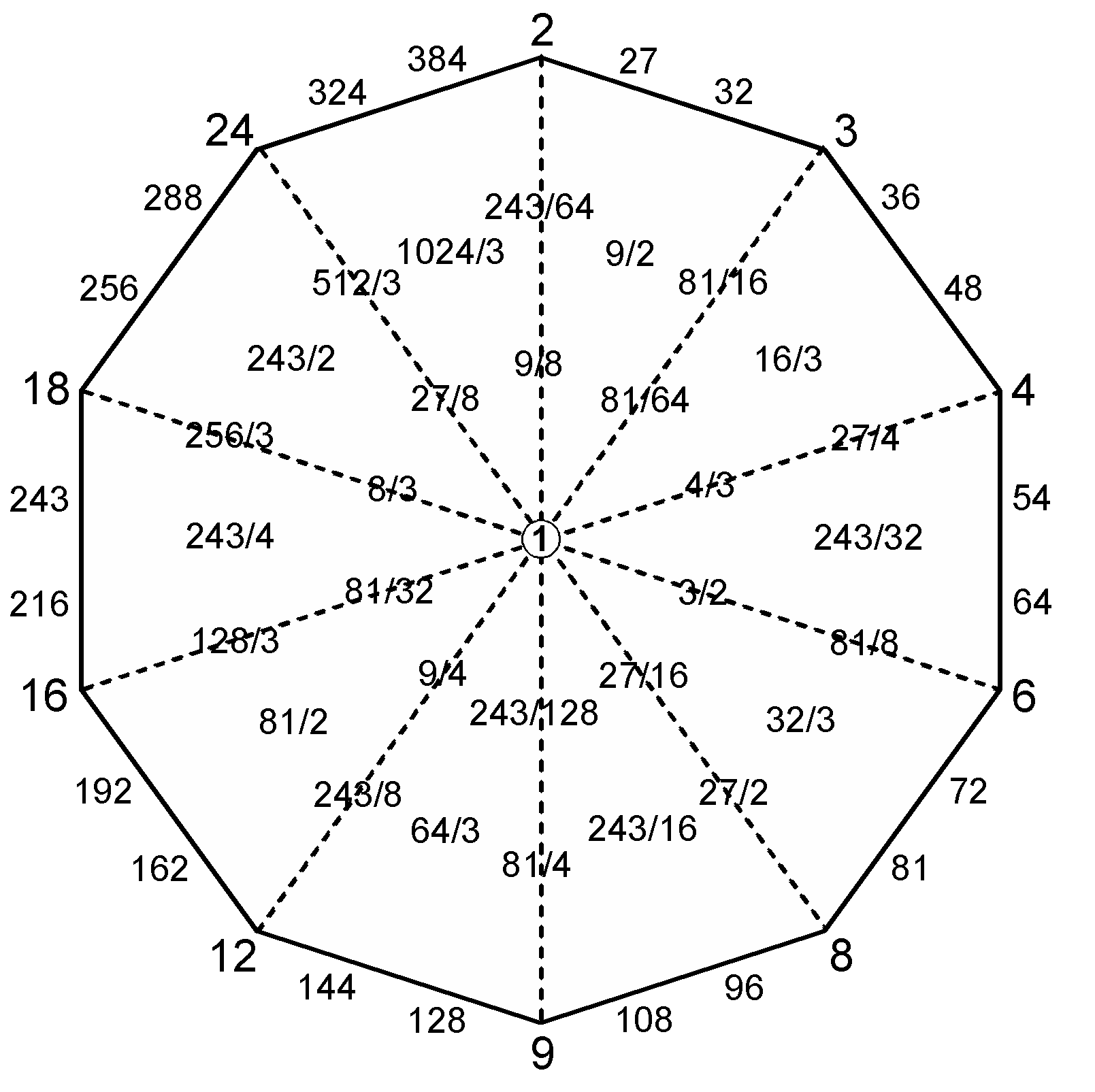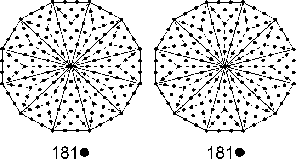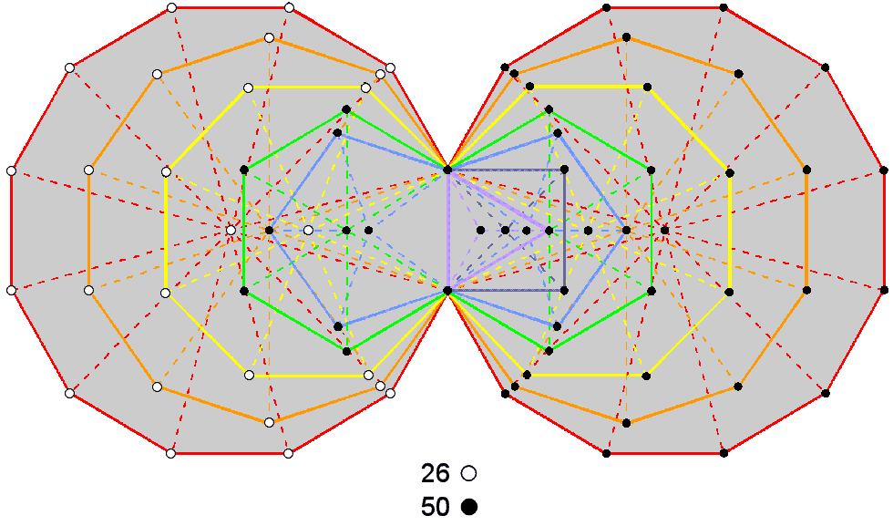 The 48 points therefore divide up into a set of 36 points and 12 corners of the ten triangular arrays of points forming a tetractys. Their counterparts in the seven regular polygons making up one half of the inner Tree of Life (see here) are the 36 corners of the first six separate polygons and the 12 corners of the dodecagon. All holistic structures display analogous patterns, such as this 36:12 division. For example, dividing a straight line into 48 segments is the initial step in one of the ways of constructing the Sri Yantra (see here).