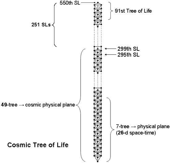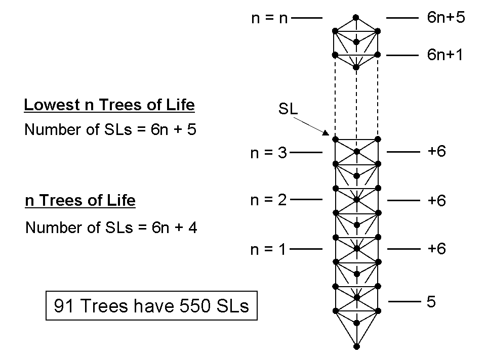 Therefore, N(91) = 550. As will be proved in this section, the number 550 is embodied in all sacred geometries because they are equivalent maps of all levels of reality — physical and superphysical. The set of 91 overlapping Trees with 550 SLs (see opposite) will be called the “Cosmic Tree of Life,” or “CTOL.” This ladder-like structure is the basis of what is referred in the Old Testament as “Jacob’s ladder” (see Book of Genesis 28: 10-19).