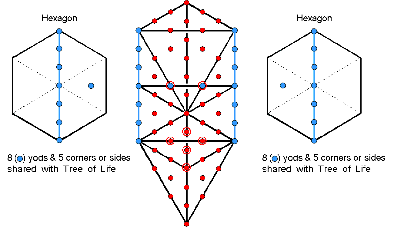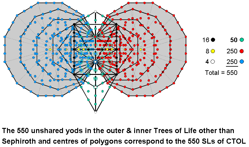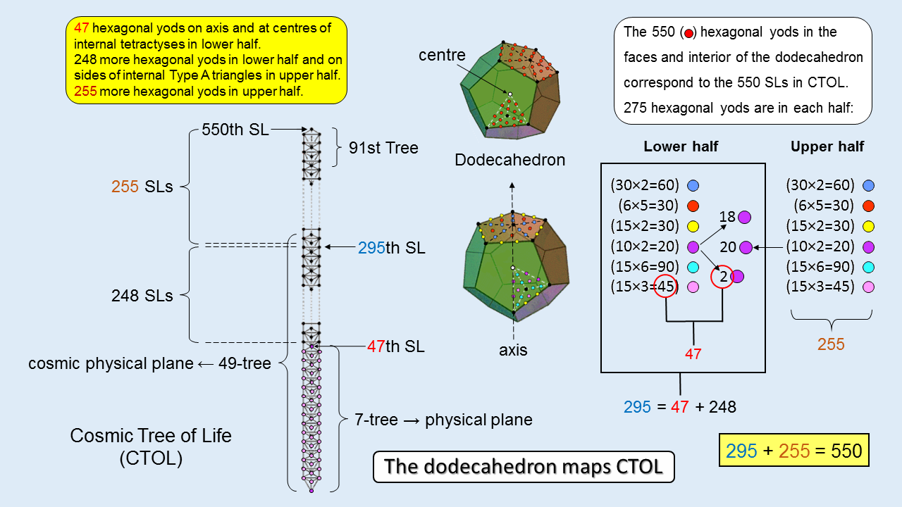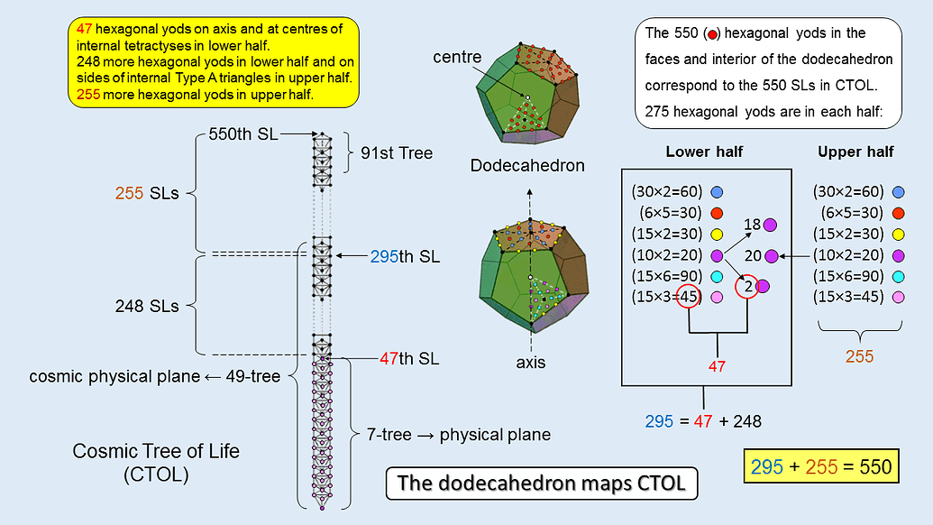 Remarkably, we see that the complete set of 550 hexagonal yod contains subsets that differentiate between the 47 SLs of the 7-tree mapping the physical plane, the next 248 SLs up to Chesed of the 49th Tree and the remaining 255 SLs of CTOL. The 47 hexagonal yods either line the axis or are at centres of tetractyses that formally correspond to Malkuth. In the same way, the physical plane corresponds to Malkuth, being the lowest of the seven planes that correspond formally to the seven Sephiroth of Construction. The 295 SLs up to Chesed of the 49th Tree correspond to the 295 hexagonal yods that are either in the lower half of the dodecahedron or on sides of internal Type A triangles that join vertices in its upper half to its centre. The 255 SLs spanning the 42 Trees that map the six cosmic superphysical planes correspond to the 255 other hexagonal yods in its upper half.