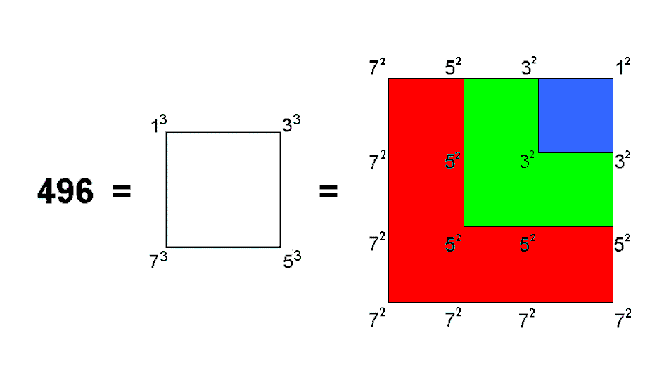 This beautiful property reveals the unique status of this number of Trees of Life in CTOL as a representation of the 91 subplanes of consciousness. Such mathematical design cannot be, plausibly, dismissed as the product of chance. Instead, it is undeniable evidence of the transcendental origin of CTOL. Other remarkable, geometrical properties of CTOL are discussed in the author’s new book. Its embodiment of this number is an illustration of the Tetrad Principle, formulated in Article 1, whereby defining parameters of holistic systems are numbers expressed by either the fourth member of a class of mathematical object or its first four members. Another example of this Pythagorean principle at work can be found here when the cubes of the first four odd integers in the 4×4 array shown opposite are replaced by their squares, generating the holistic parameter 496: