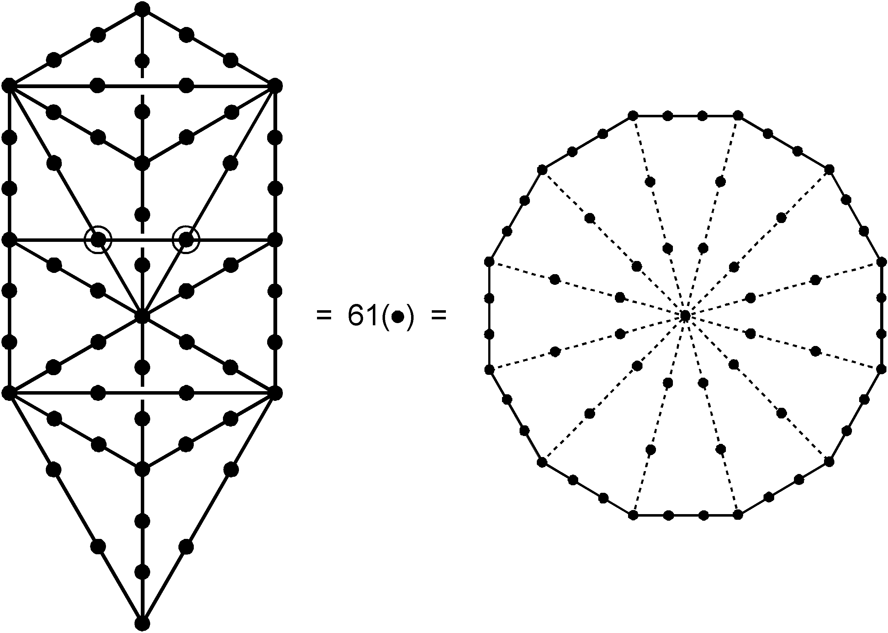 A triangular array of 153 points, 17 points per side, is the basis of the template that generates the Cosmic Tetractys. It shows how ELOHIM SABAOTH, the Godname of Hod with number value 153, arithmetically prescribes the Cosmic Tetractys: 153 is the 17th triangular number. Each tetractys array of 10 triangles consists of 15 points, 30 lines and 16 triangles, i.e., 61 geometrical elements. The Godname YAH with number value 15 prescribes the basic unit, as does the Godname EL with number 31, because it has 31 points & triangles, whilst 61 is the 31st odd integer.