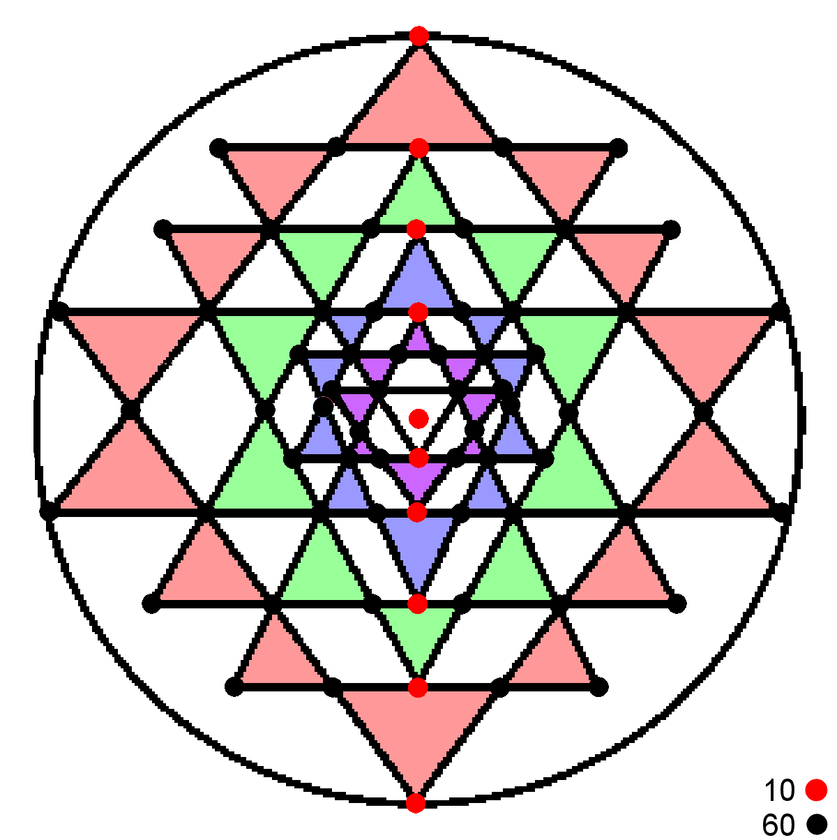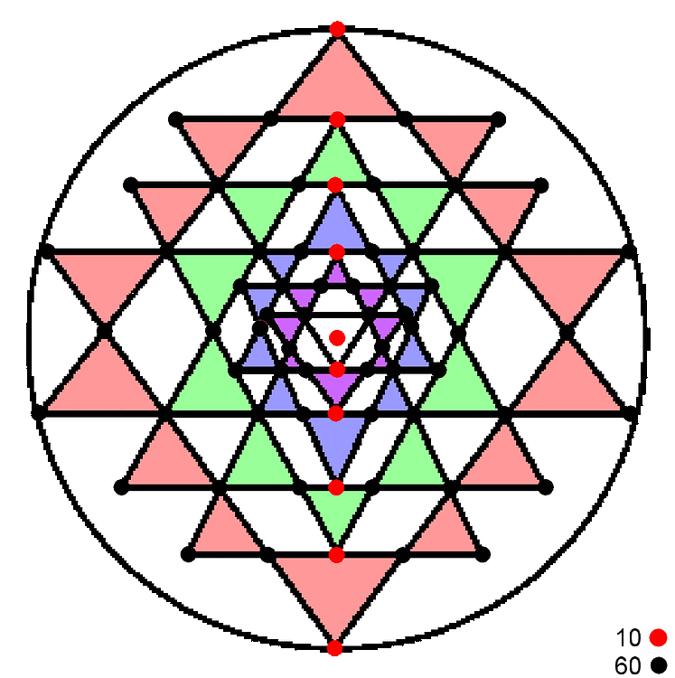 Compare these properties with the 3-dimensional Sri Yantra when the 42 triangles are turned into Type A triangles and the central one is turned into a Type B triangle (for the definition of these two types of triangles, see Sacred Geometry/Tree of Life). The seven planes of consciousness have a one-to-one correspondence with the seven Sephiroth of Construction (physical↔Malkuth, astral↔Yesod, mental↔Hod, etc). The six superphysical planes are associated with the six Sephiroth of Construction other than Malkuth. In the tetractys, the latter are symbolized by the six hexagonal yods that lie on its edges, the central hexagonal yod denoting Malkuth. The 504 hexagonal yods that line the sides of the 126 tetractyses in the 42 triangles of the Sri Yantra are the counterpart of the 504 SLs belonging to the 84 Trees of Life mapping all superphysical realms of consciousness. The counterpart of the 46 SLs below the top of the 7-tree are the 46 black yods in the central triangle. The presence of the 504 hexagonal yods on sides of tetractyses would, of course, continue if it were the 2-dimensional version of the Sri Yantra that was being considered. So either version can be considered as equivalent to CTOL. However, the point at the centre of the central triangle is regarded in Tantra as the source of creation and this does not fit its symbolizing the bottom of CTOL — the opposite to this, being the final emanation of God. But then the central triangle symbolizes, according to Tantra, the trimûrti of Shiva, Brahma & Vishnu, and this is inconsistent with its identification with the physical universe mapped by the 7-tree. In order to retain the traditional meaning of the bindu point as standing outside all realms of consciousness, being their source, it does make a difference which version of the Sri Yantra is the correct counterpart of CTOL. Only its 3-dimensional form, which has this point hovering above the central triangle and the four layers of 42 triangles stacked on top of one another, is the right counterpart.